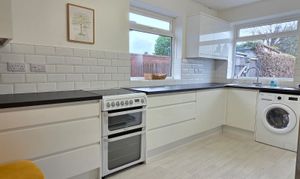 This modern kitchen offers a number of wall, base and drawer units with rollover worktop, tiled splashbacks, stainless steel sink and drainer with mixer tap over, wall mounted boiler unit, space for cooker, space for an American style fridge/freezer, space and plumbing for a washing machine, vinyl flooring, radiator and two UPVC double glazed windows along with door leading out to the rear garden.