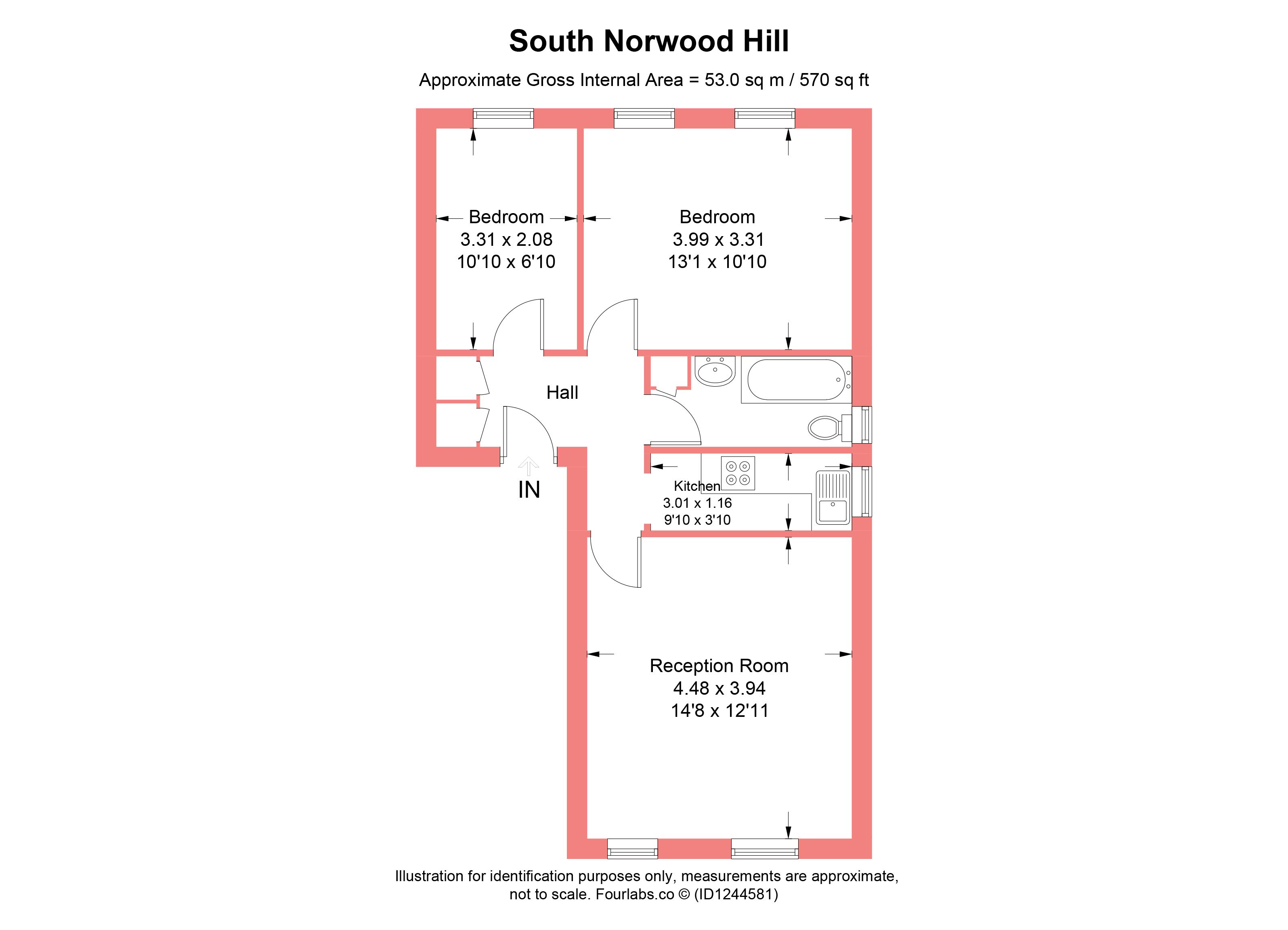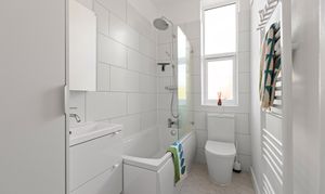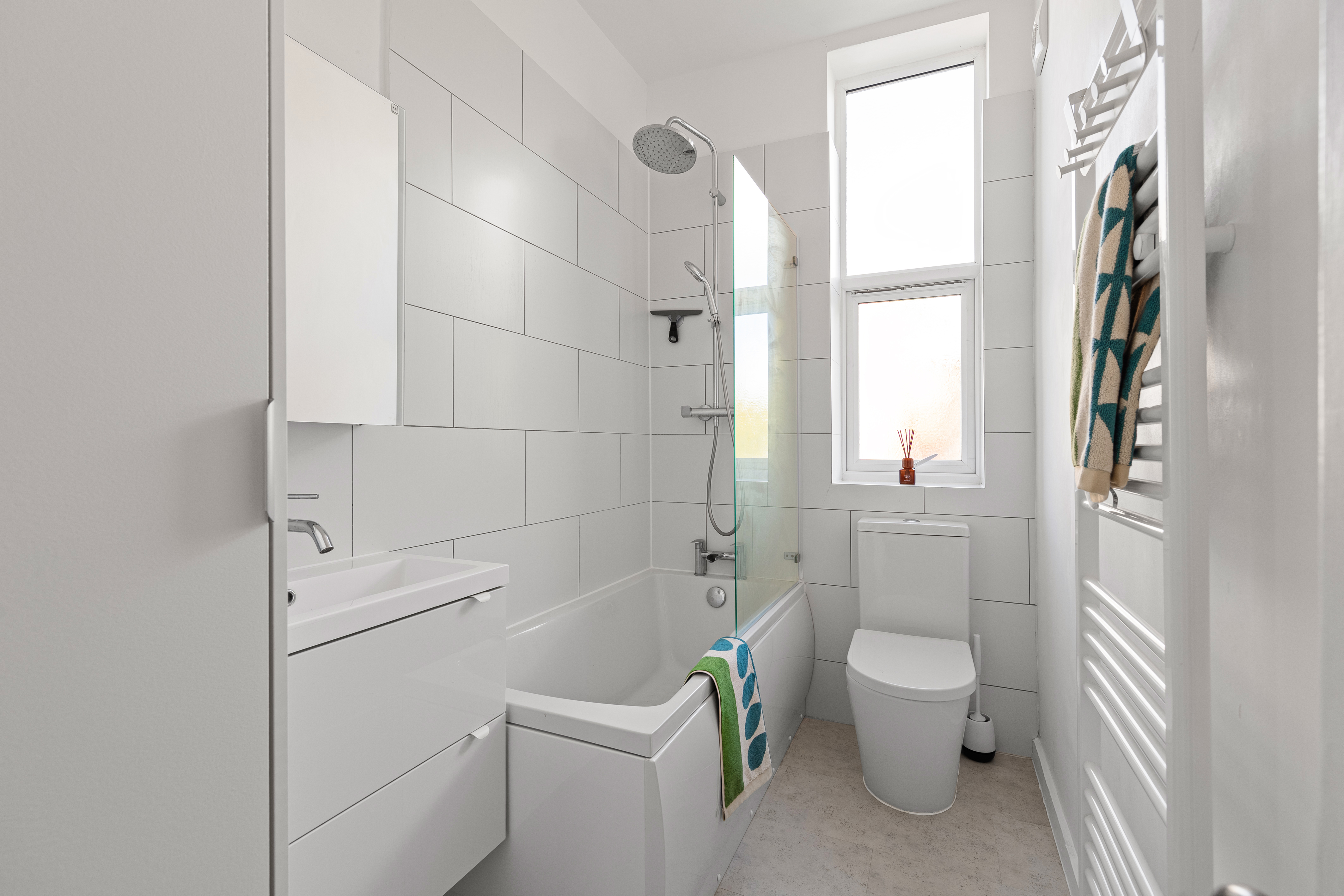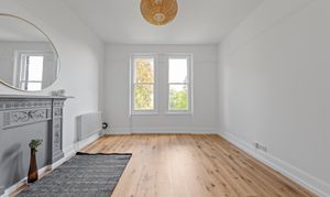 Both bedrooms are doubles. The larger one at the front is a proper 13 by 10 feet with high ceilings and good natural light from the sash windows. The second bedroom is smaller but still a usable double at around 10 by 7 feet – it works well as a guest room or home office.