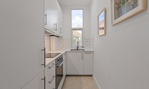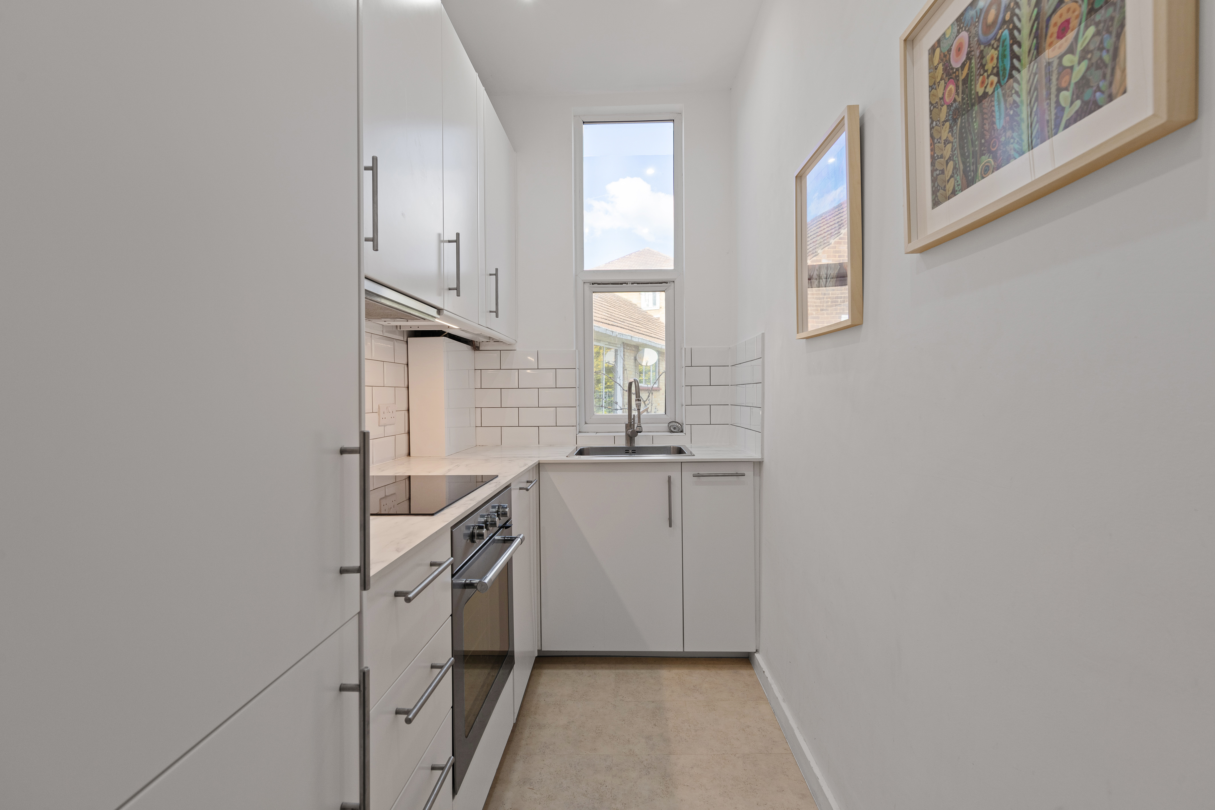 The kitchen is brand new: white handleless units, integrated appliances including an oven and hob, and a sleek, minimal aesthetic. It's compact but well-designed, with enough counter space and storage to be properly functional.