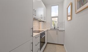 There's decent storage throughout the flat, including built-in cupboards in the hallway. The whole place has been freshly decorated in neutral tones with new flooring, so you're looking at a turnkey situation – just bring your furniture and you're done.