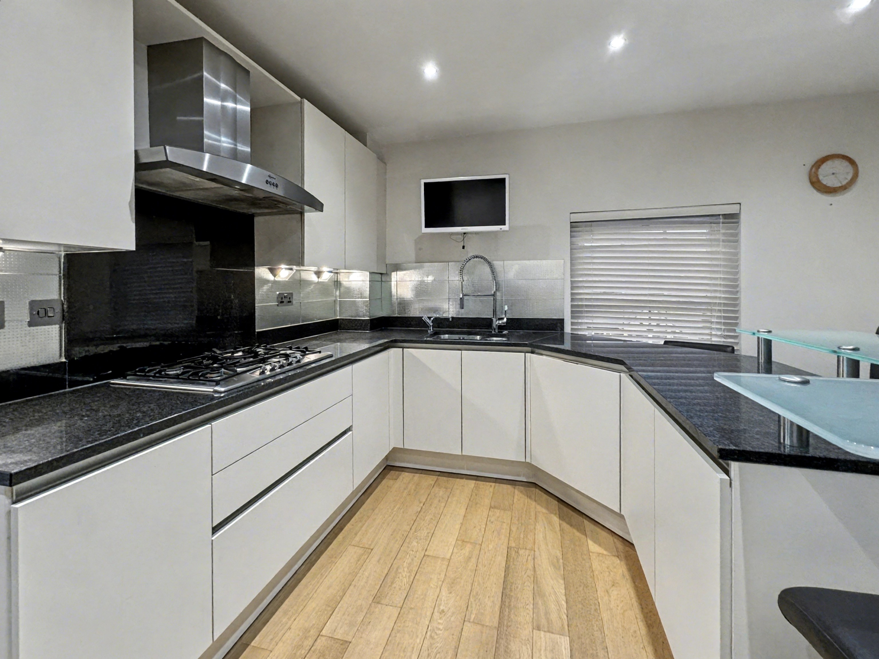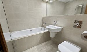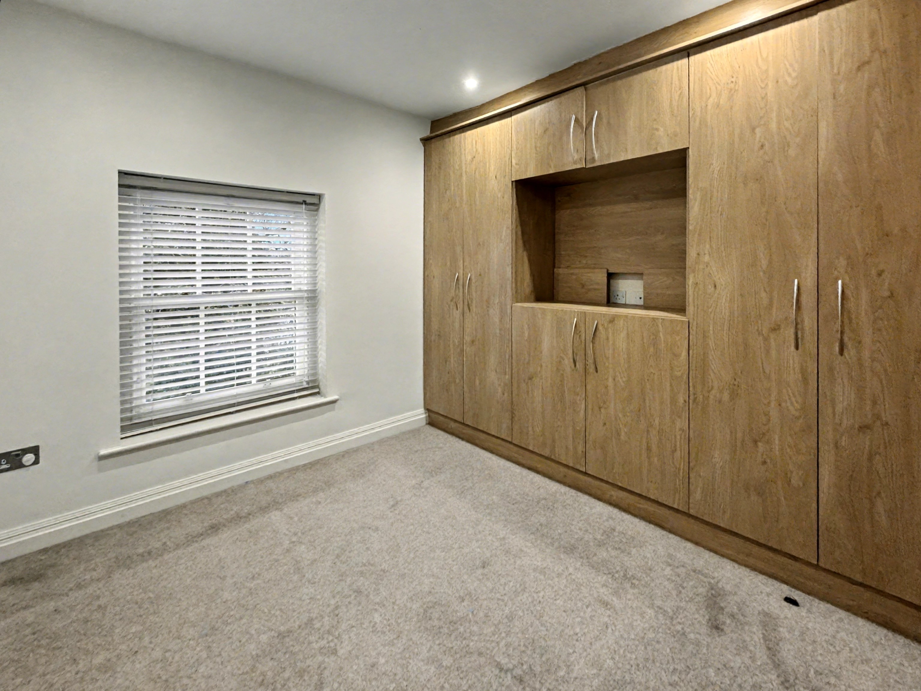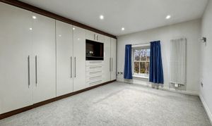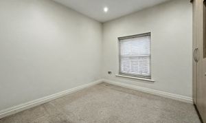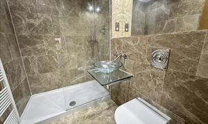 There are two generously proportioned double bedrooms, with the main bedroom boasting fitted furniture and a private en-suite bathroom, complete with high-quality fixtures and elegant tiling. The second bedroom also features fitted furniture and shares access to a beautifully designed family bathroom, which includes a walk-in rainfall shower, a pedestal sink, and sleek contemporary finishes.