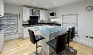 The apartment features a welcoming entrance hall leading to a spacious and bright ‘L’-shaped lounge with a dining area, complemented by large sash windows and patio doors that open onto a charming balcony. The stylish kitchen is fitted with a range of modern units, integrated appliances, and a convenient breakfast bar, providing a perfect space for both cooking and casual dining. The adjoining utility room adds practicality and convenience.