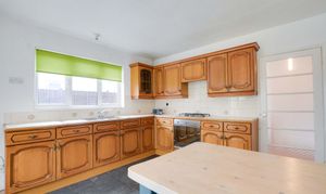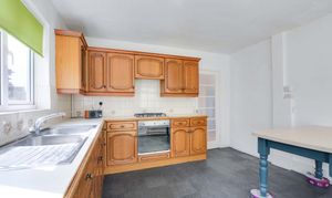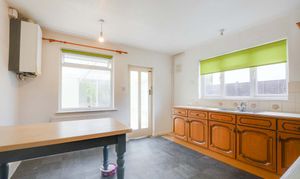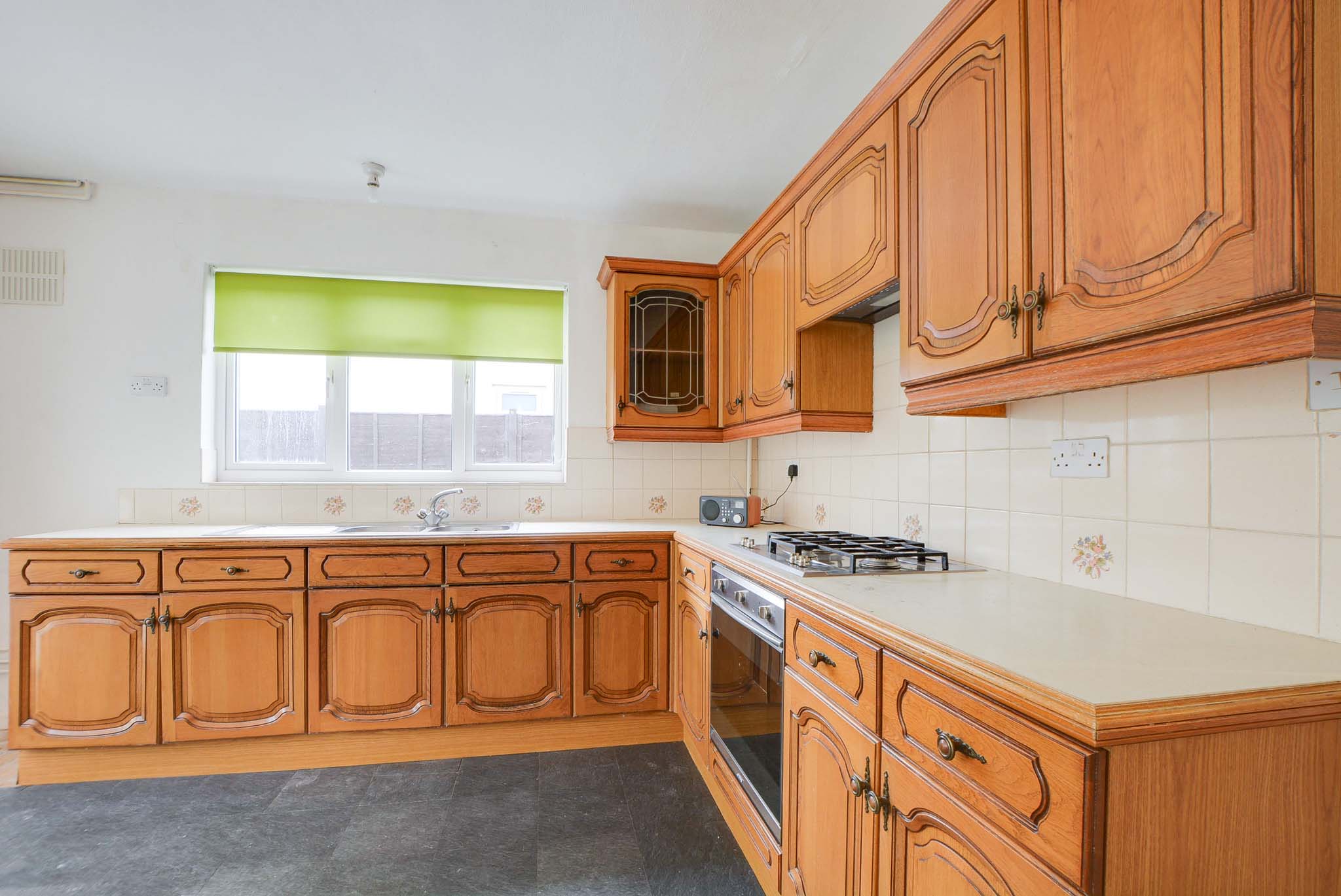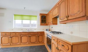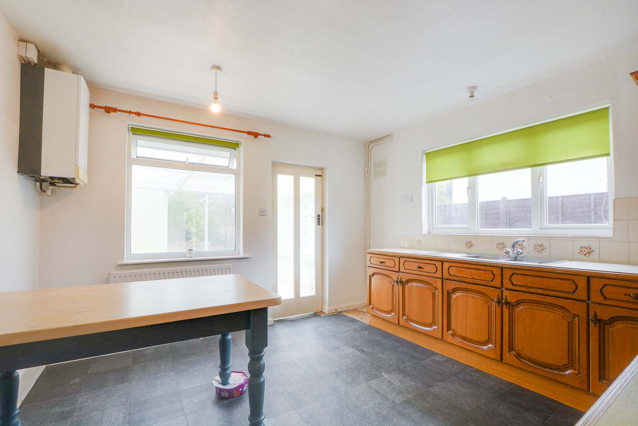 With double glazed windows to the side and rear elevations, a range of oak wall and base units with work surface over, stainless steel sink and drainer, inset four ring gas hob and oven, extractor hood, wall mounted combi boiler, part tiled walls, radiator, door to conservatory.