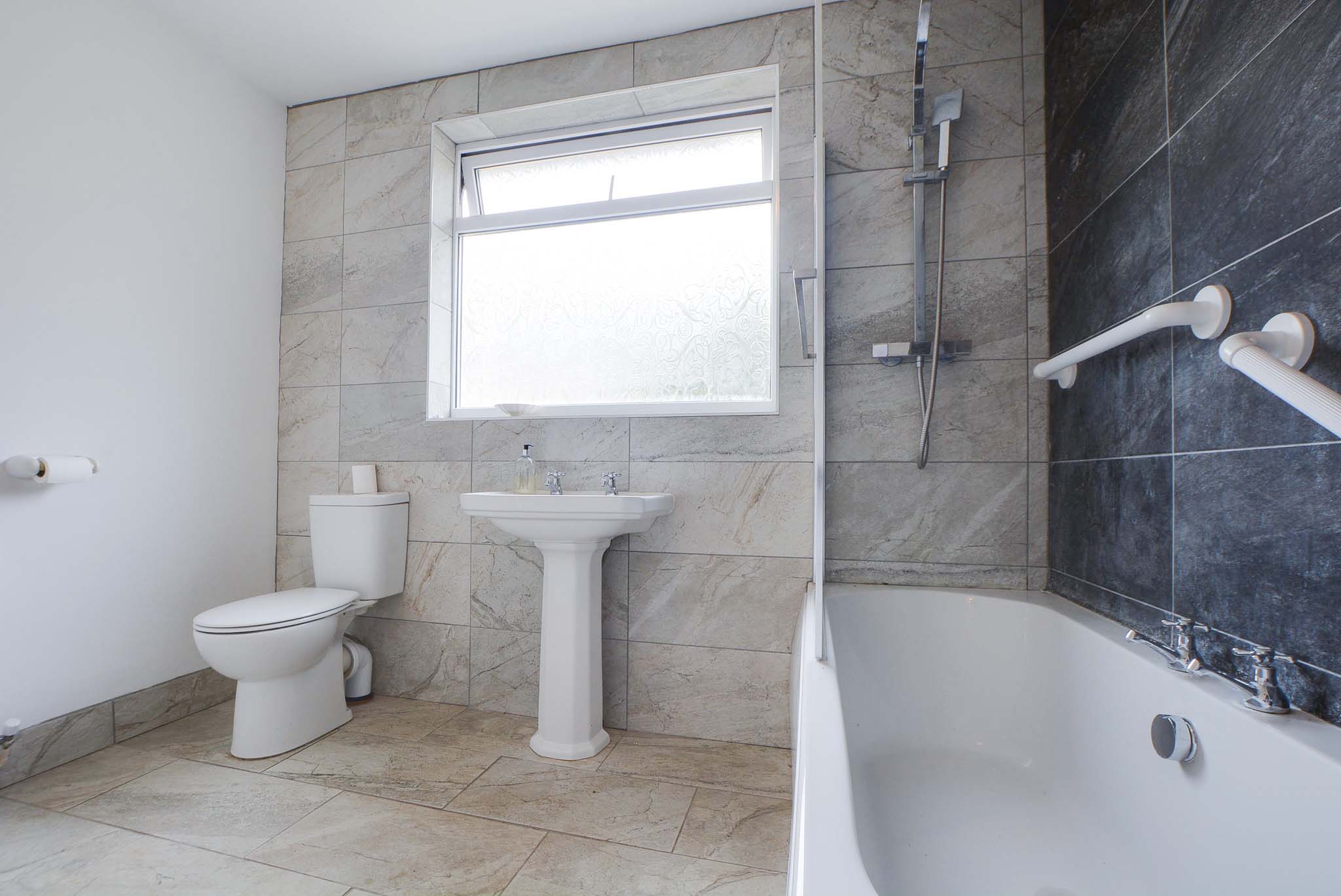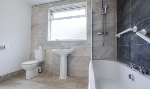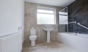 With double glazed window to the side elevation, ceramic tiled floor, bath with shower over and shower screen, low-level WC, wash hand basin, part tiled walls, radiator.