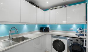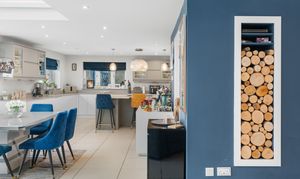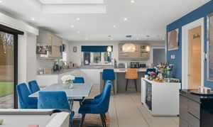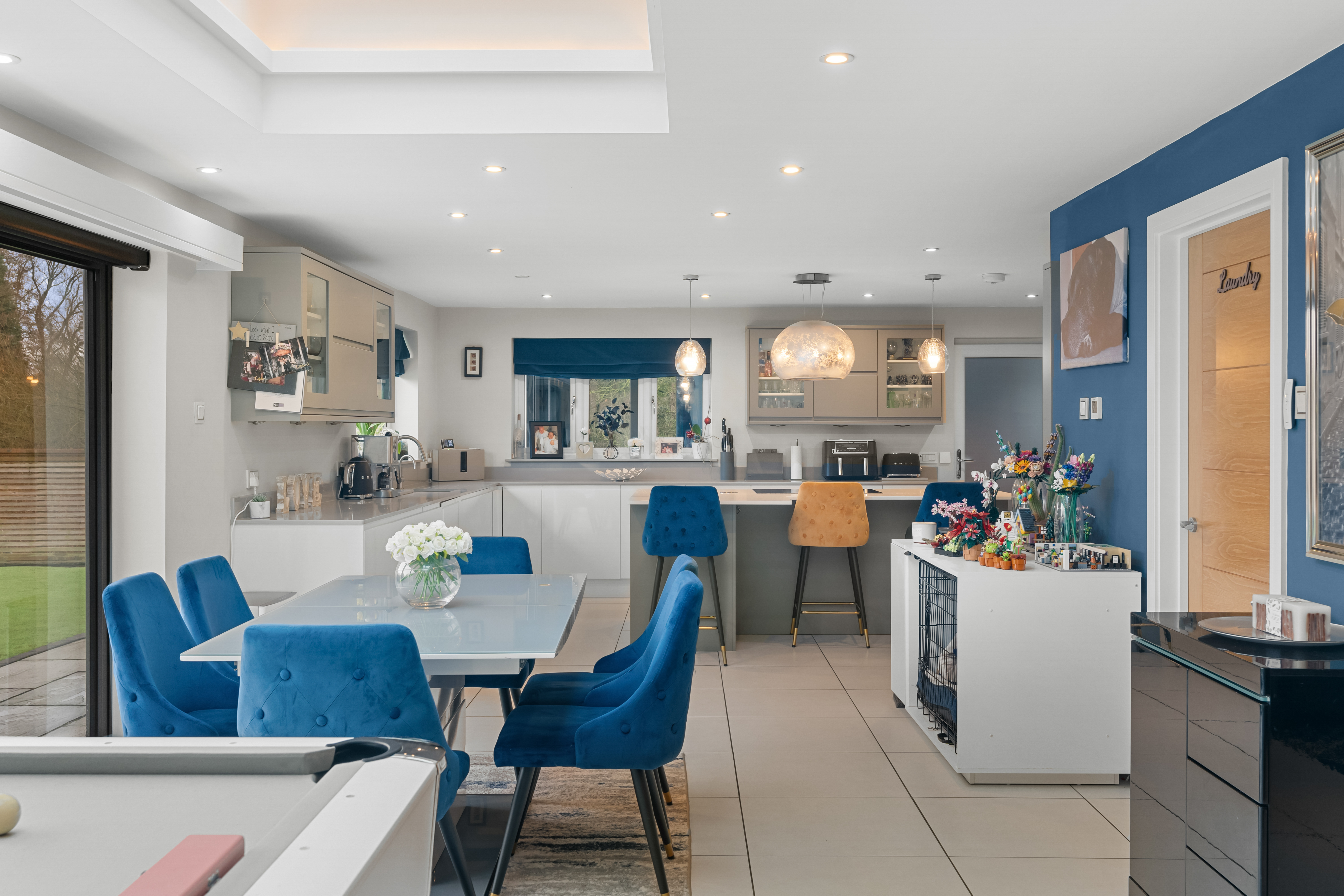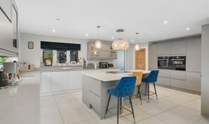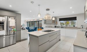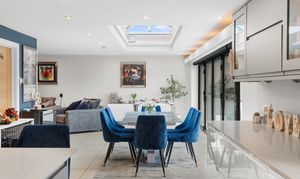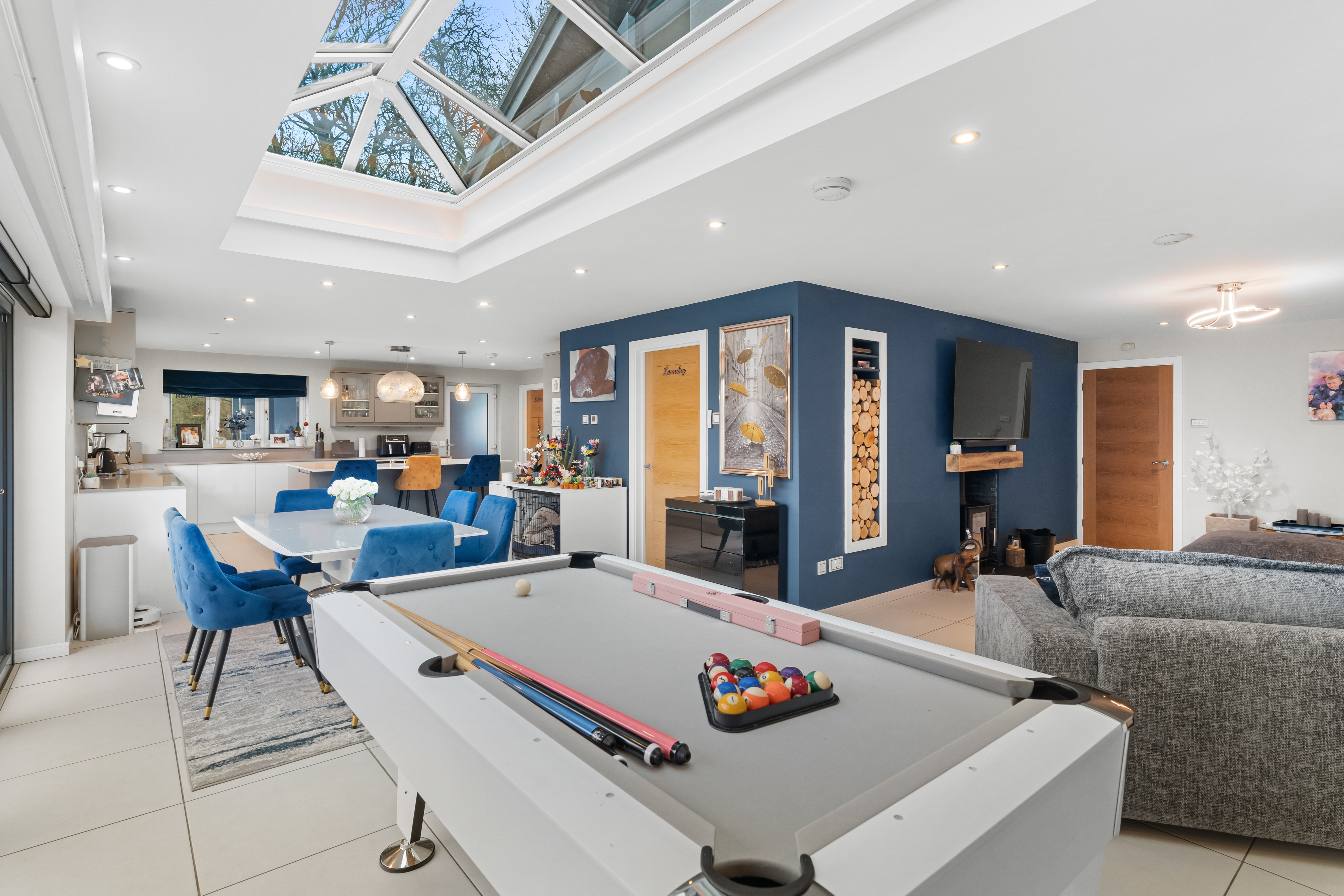 At the heart of the home is a stunning open-plan living space, designed for both everyday living and entertaining. A striking roof lantern floods the room with natural light, while bi-fold doors open onto the terrace, creating a seamless connection between indoor and outdoor spaces. The sitting area, centred around a wood-burning stove, flows effortlessly into the dining area and on to a high-quality kitchen, fitted with premium cabinetry, stone worktops, and integrated appliances. A separate utility room provides additional practicality.
