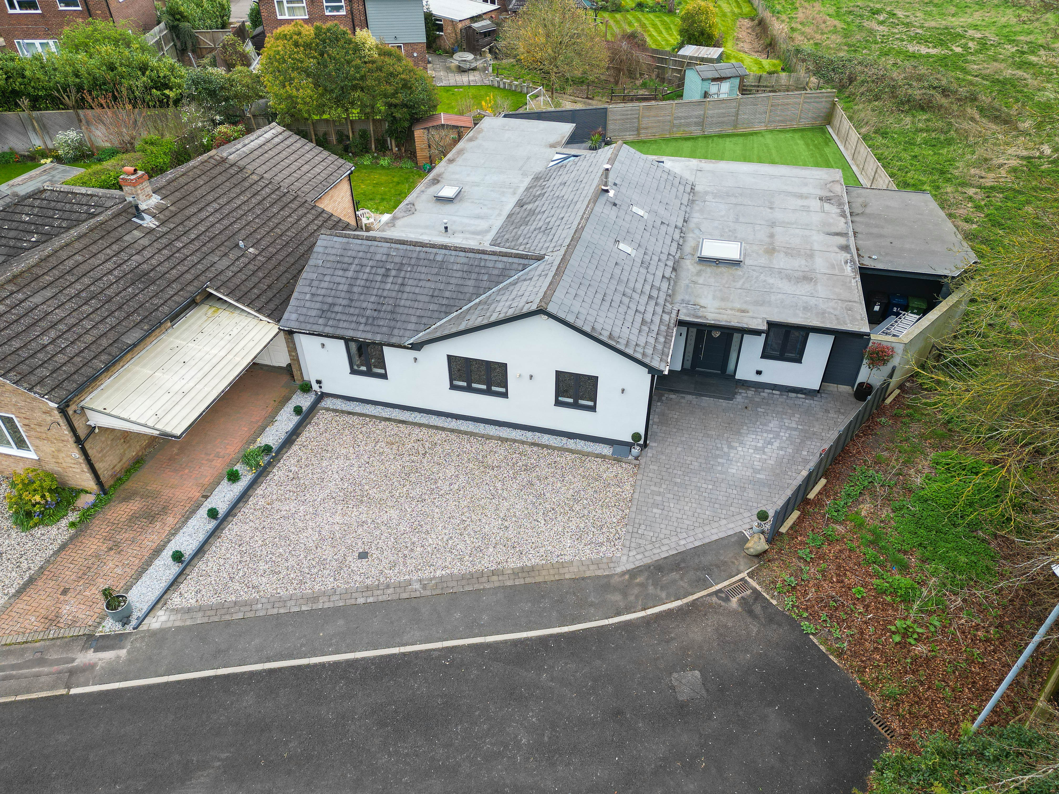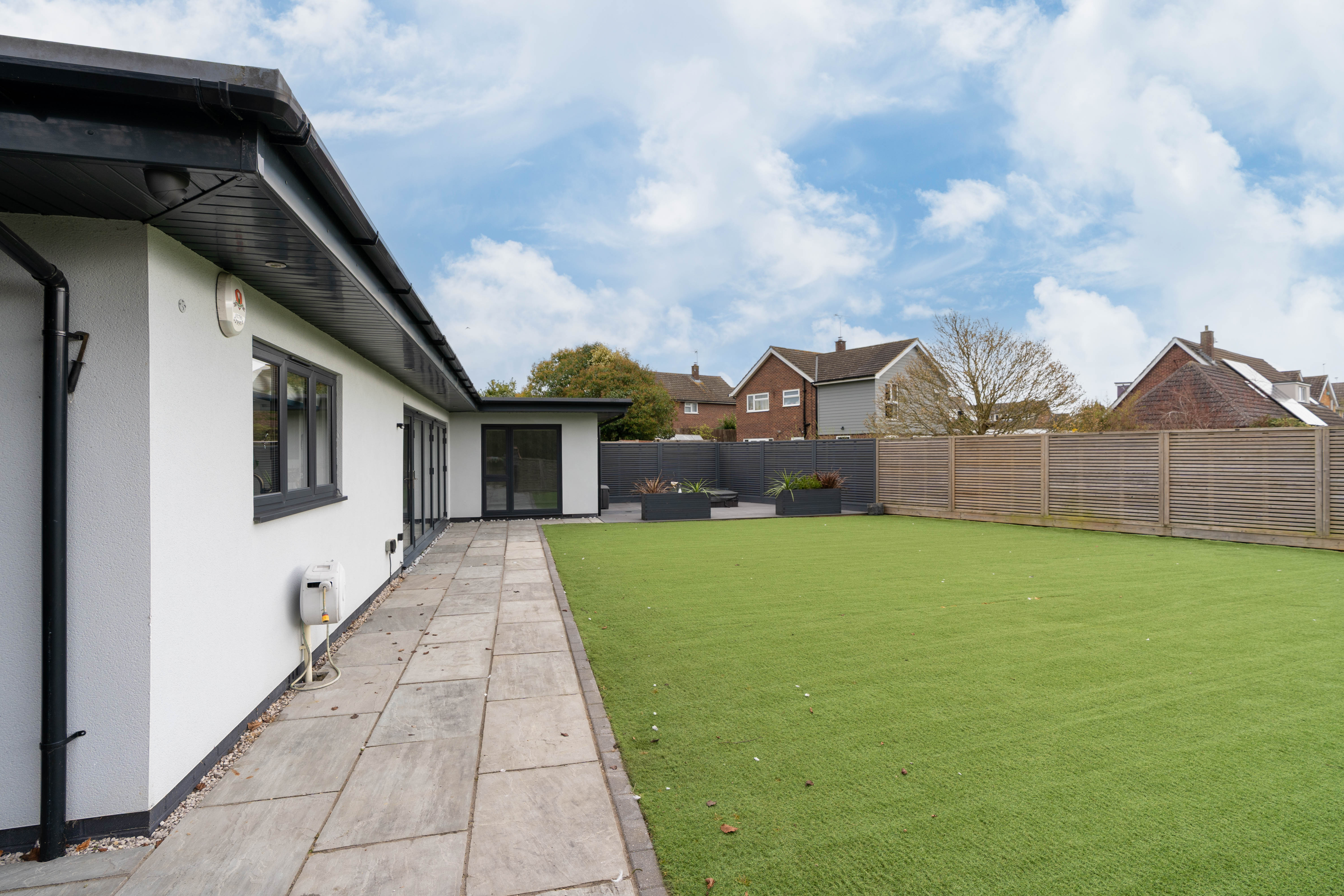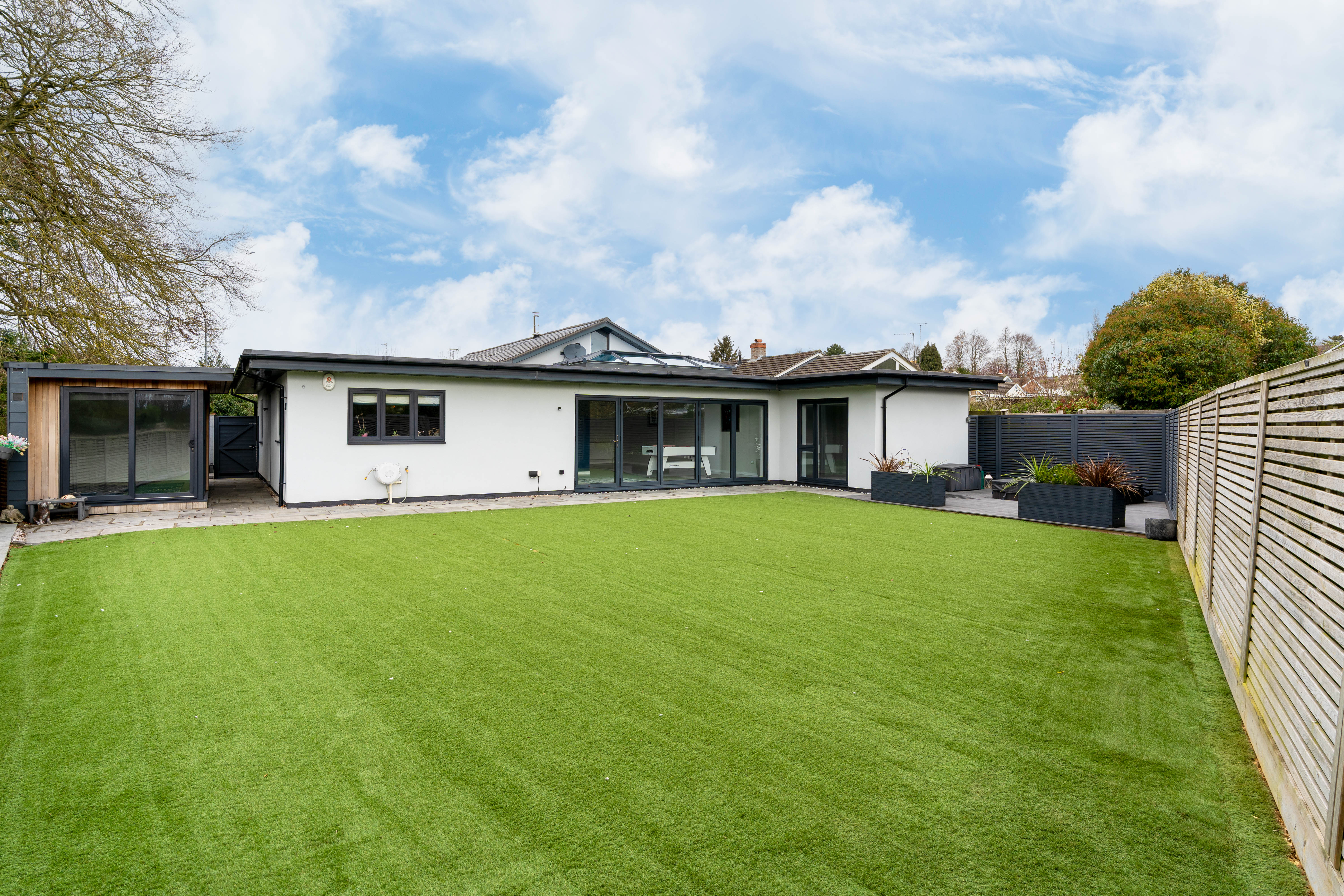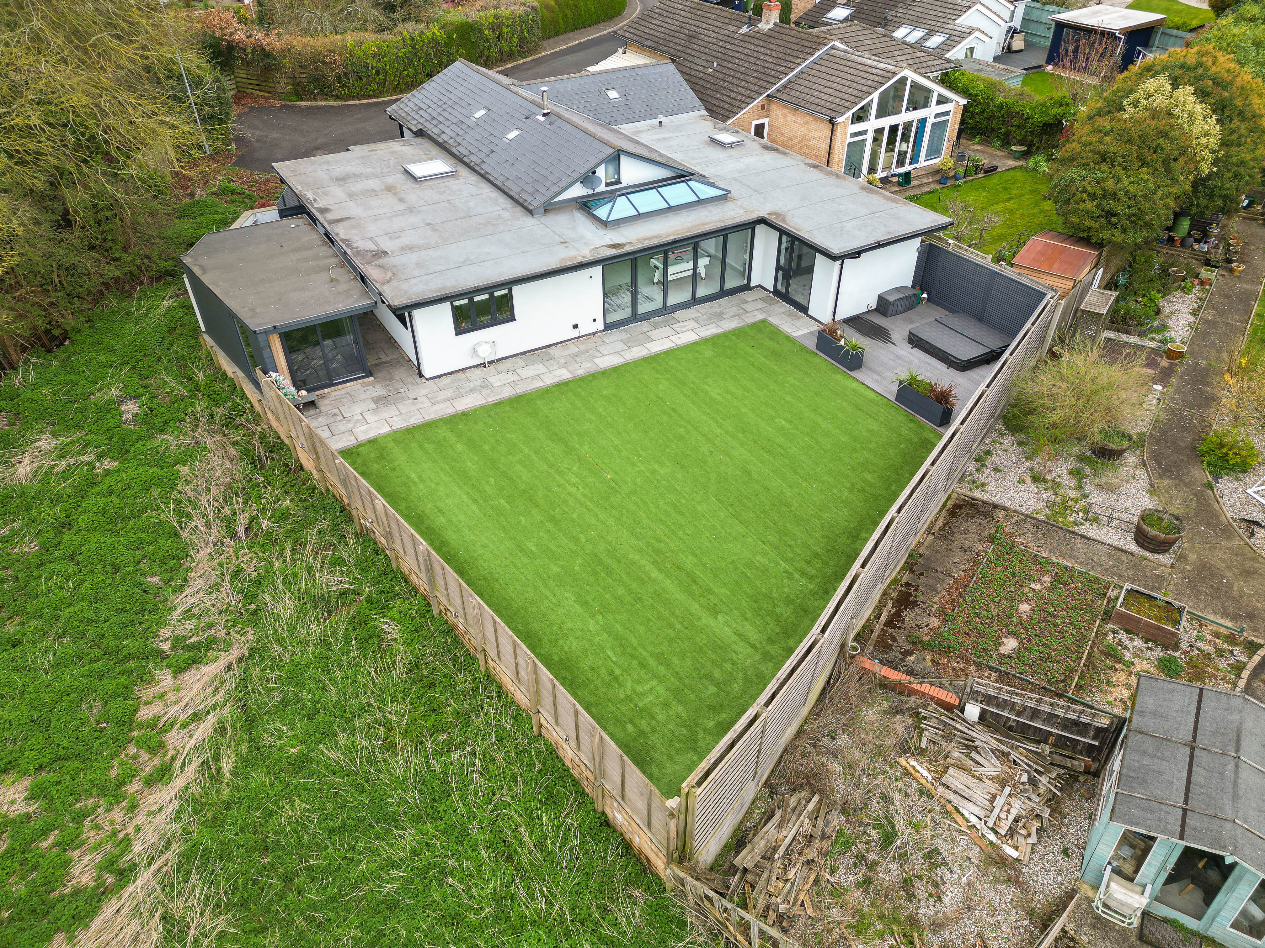 Externally, the property is equally impressive. A driveway provides parking for several vehicles, while the professionally landscaped rear garden has been designed with ease of maintenance in mind, featuring artificial lawn and an expansive paved terrace ideal for entertaining. A secluded hot tub area offers a private retreat for relaxation.