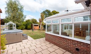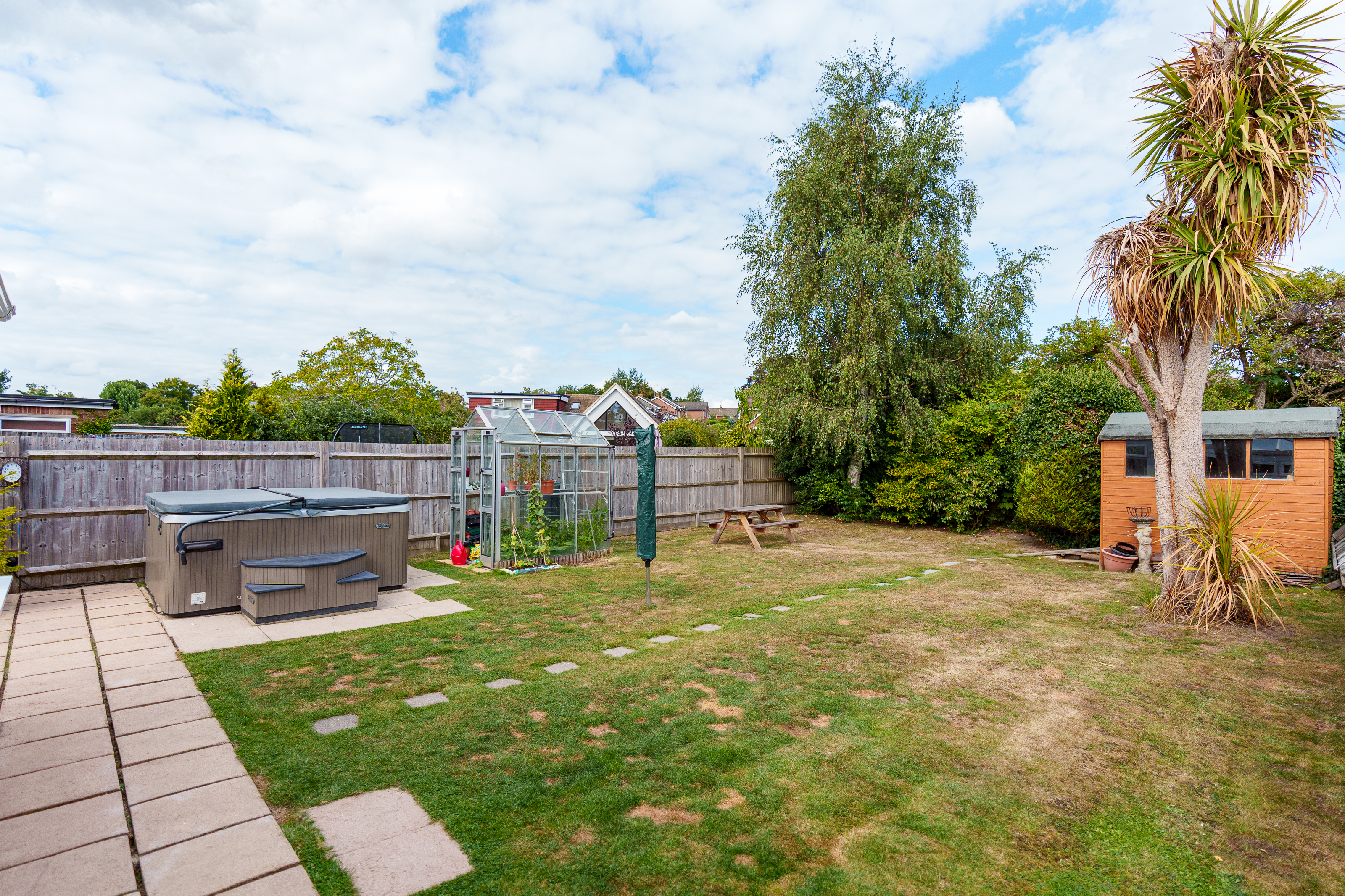 Outside the large rear garden has a patio area, lawn with tree and planted border at the rear, two sheds, green house, hot tub, and side access with security gated entry fitted this year. The front landscaped garden has off road parking for up to four cars.