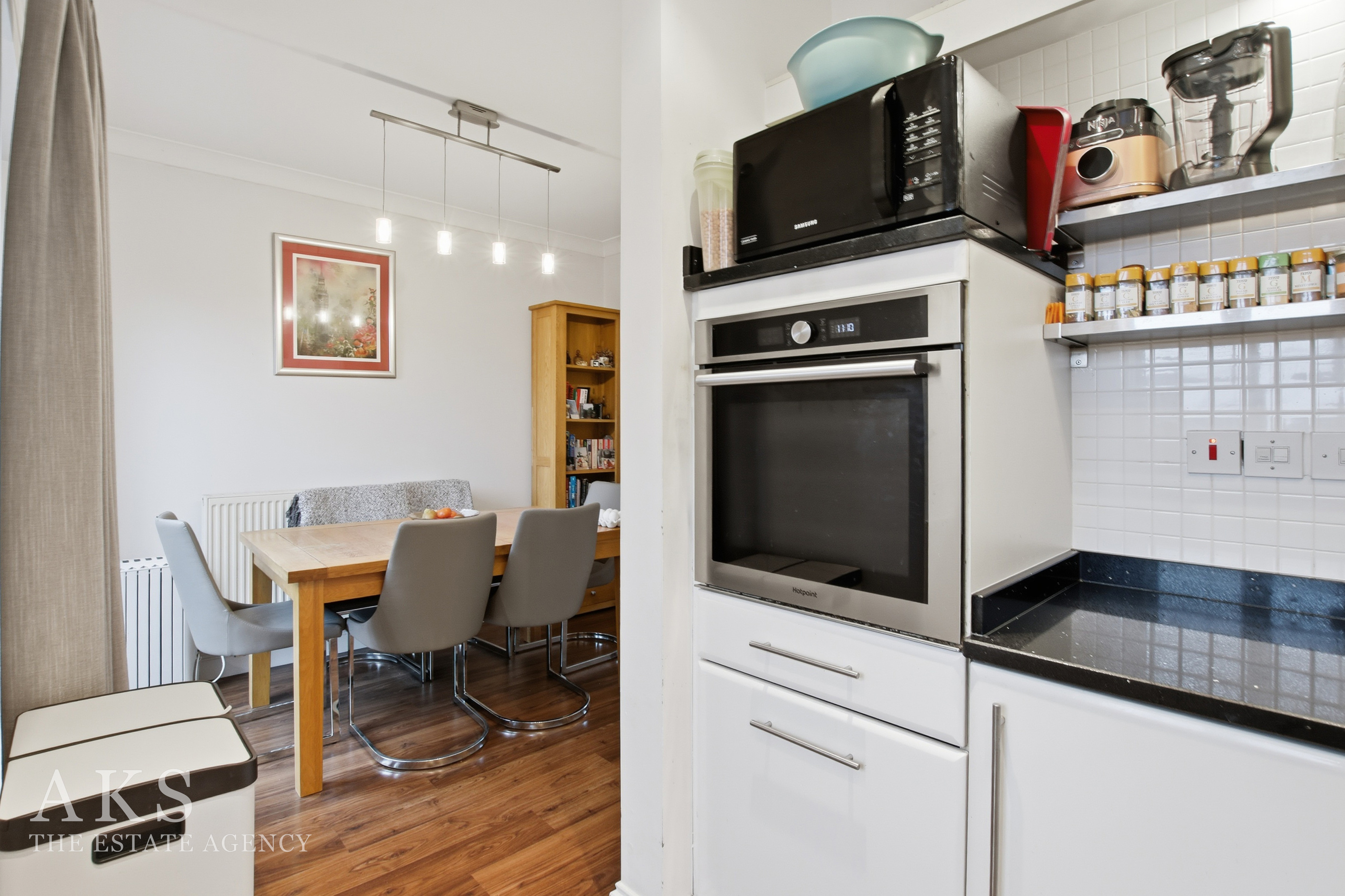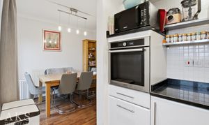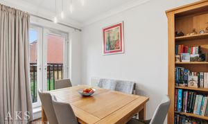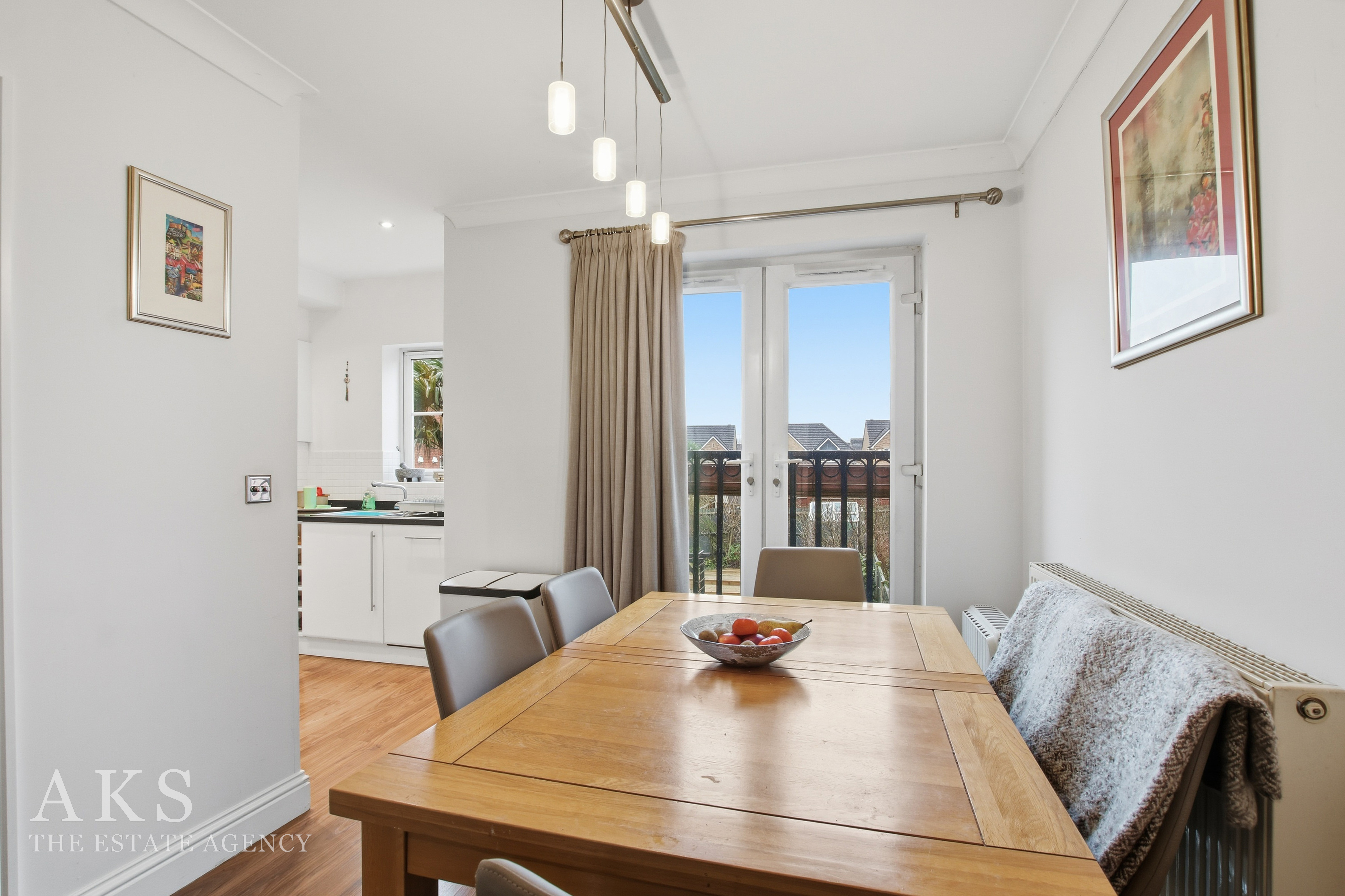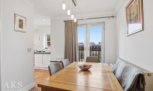 Heading upstairs, the middle floor has the living room at the front, it’s such a bright space, thanks to the Juliet balcony and the extra window. Double doors open into the dining area, where there’s another Juliet balcony, and the whole floor flows seamlessly. The kitchen sits just off to the side, with sleek white high‑gloss units that give it a clean, modern feel. It’s a great floor for entertaining or simply relaxing at the end of the day.
