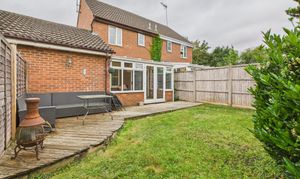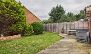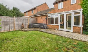 The rear garden is primarily laid to lawn with a deck, mature planting, raised bed and shed.