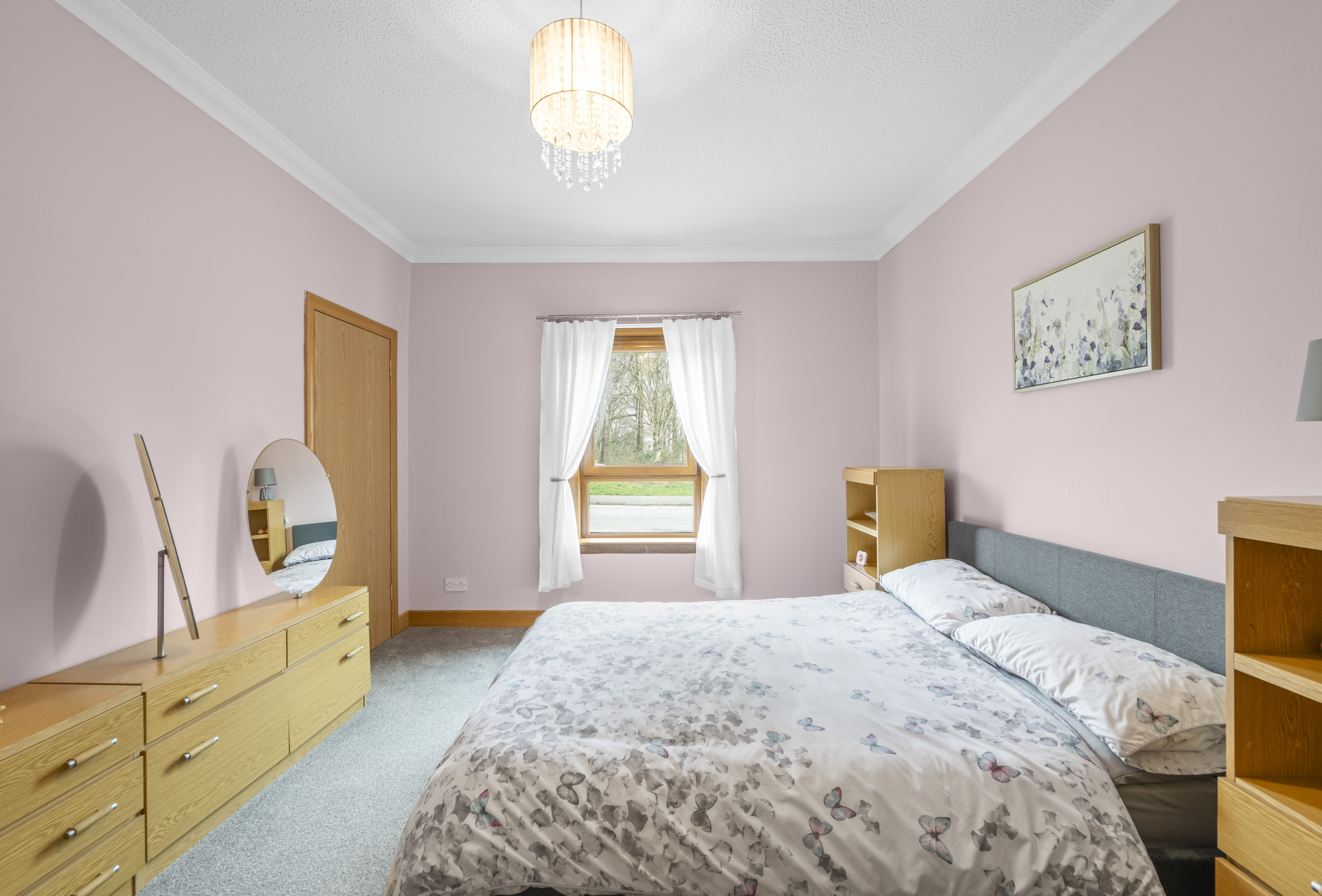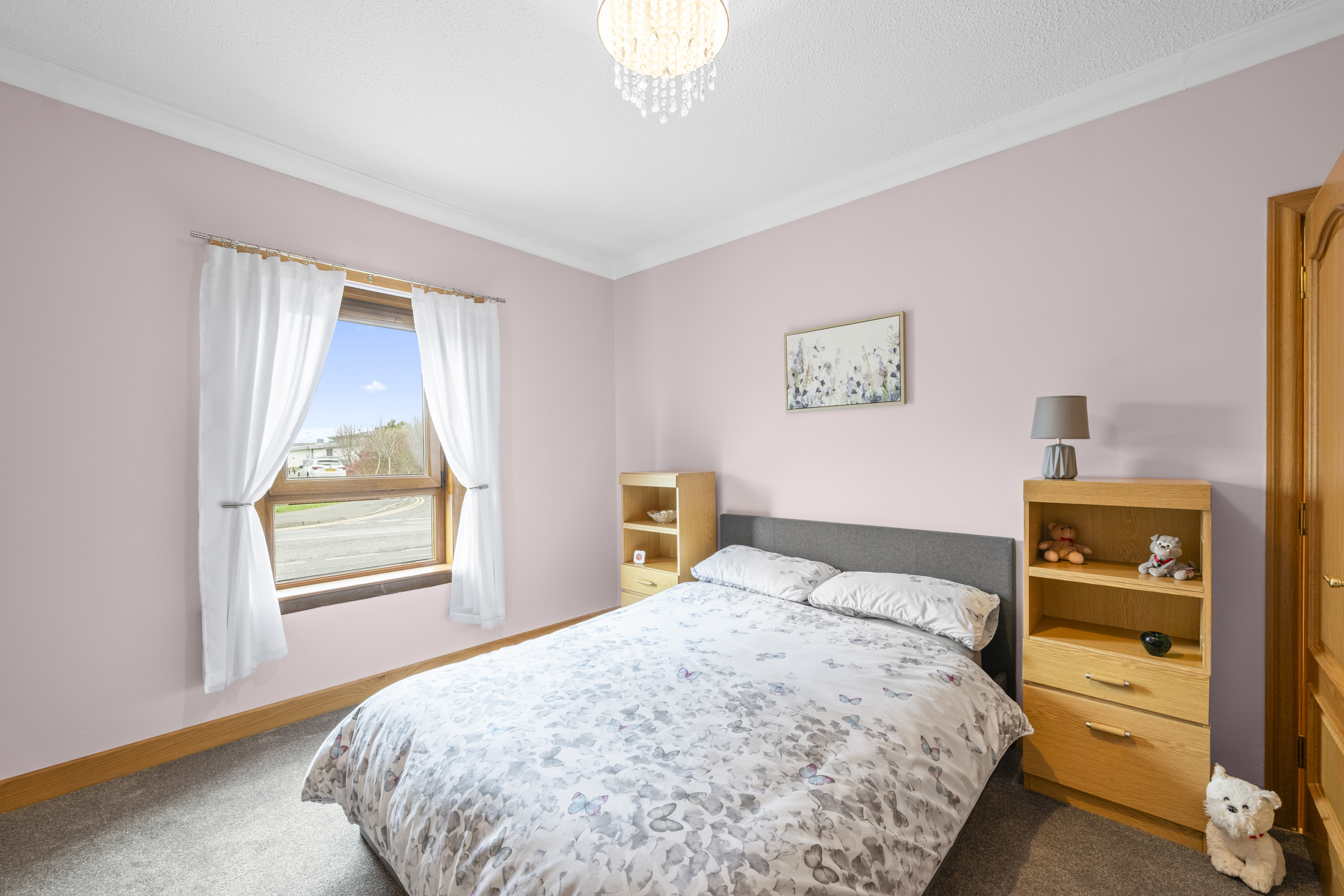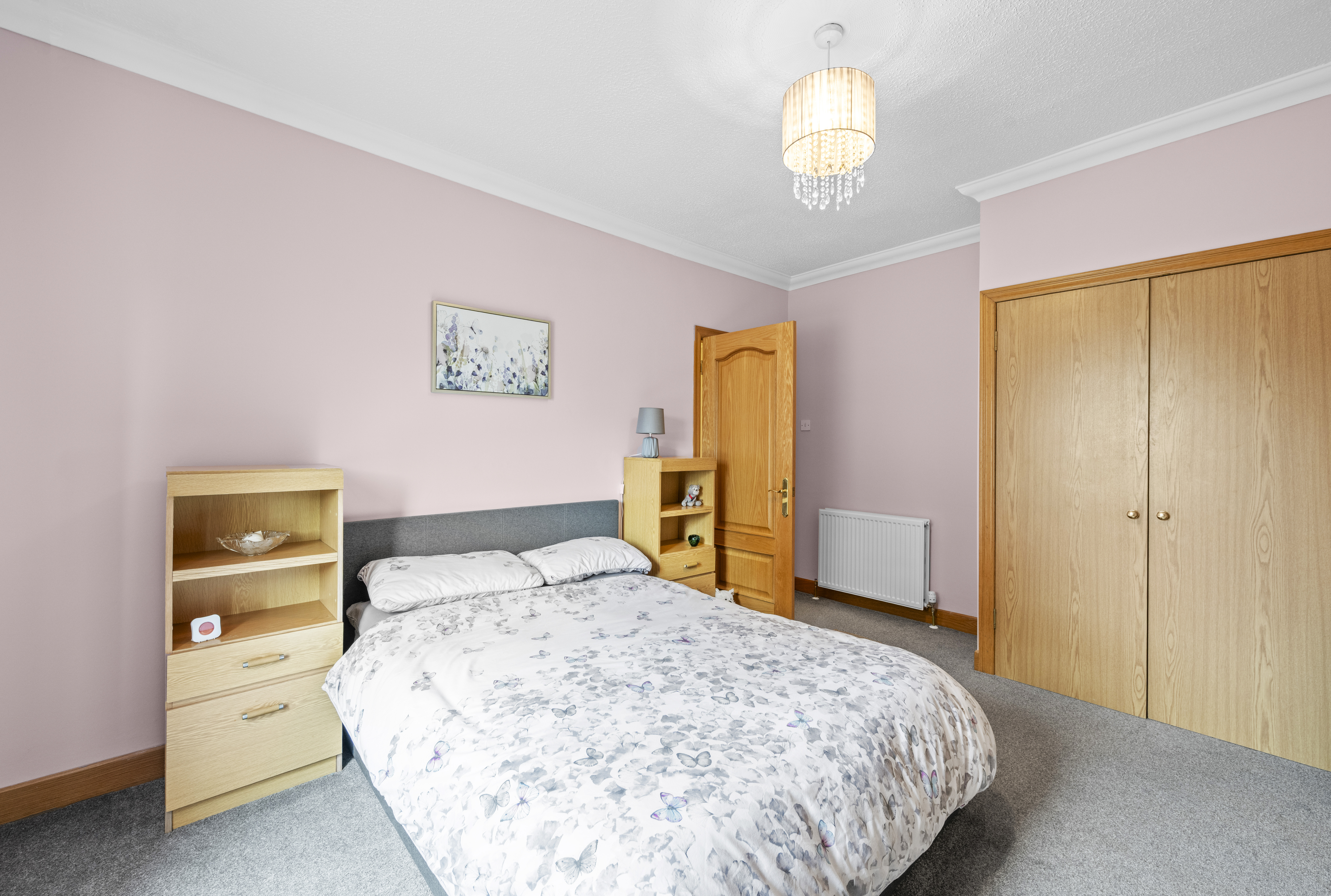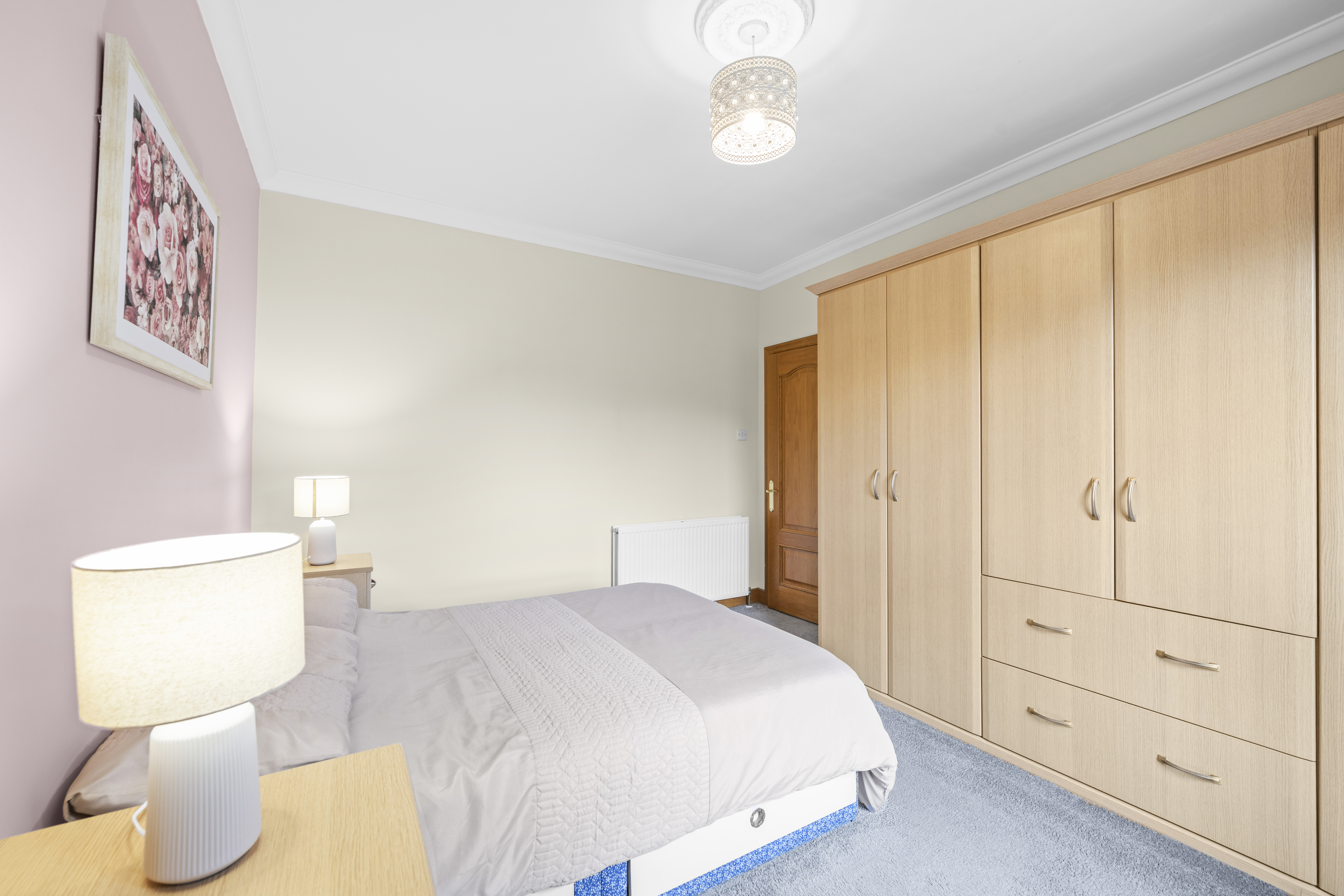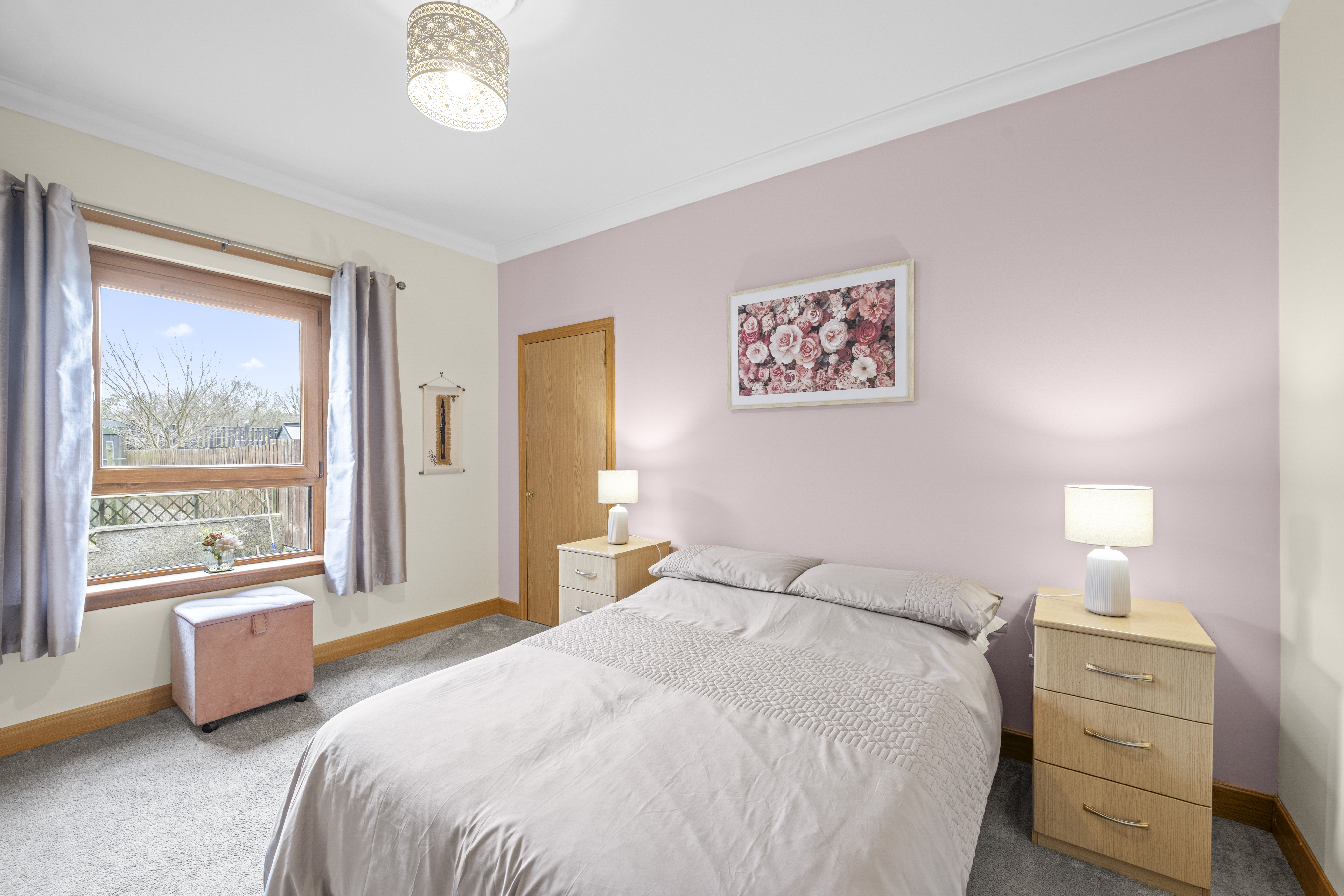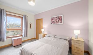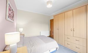 The second double bedroom is also well proportioned and offers calm neutral decor complemented by carpeting. Two fitted cupboards and ample space for a range of additional free standing furniture.