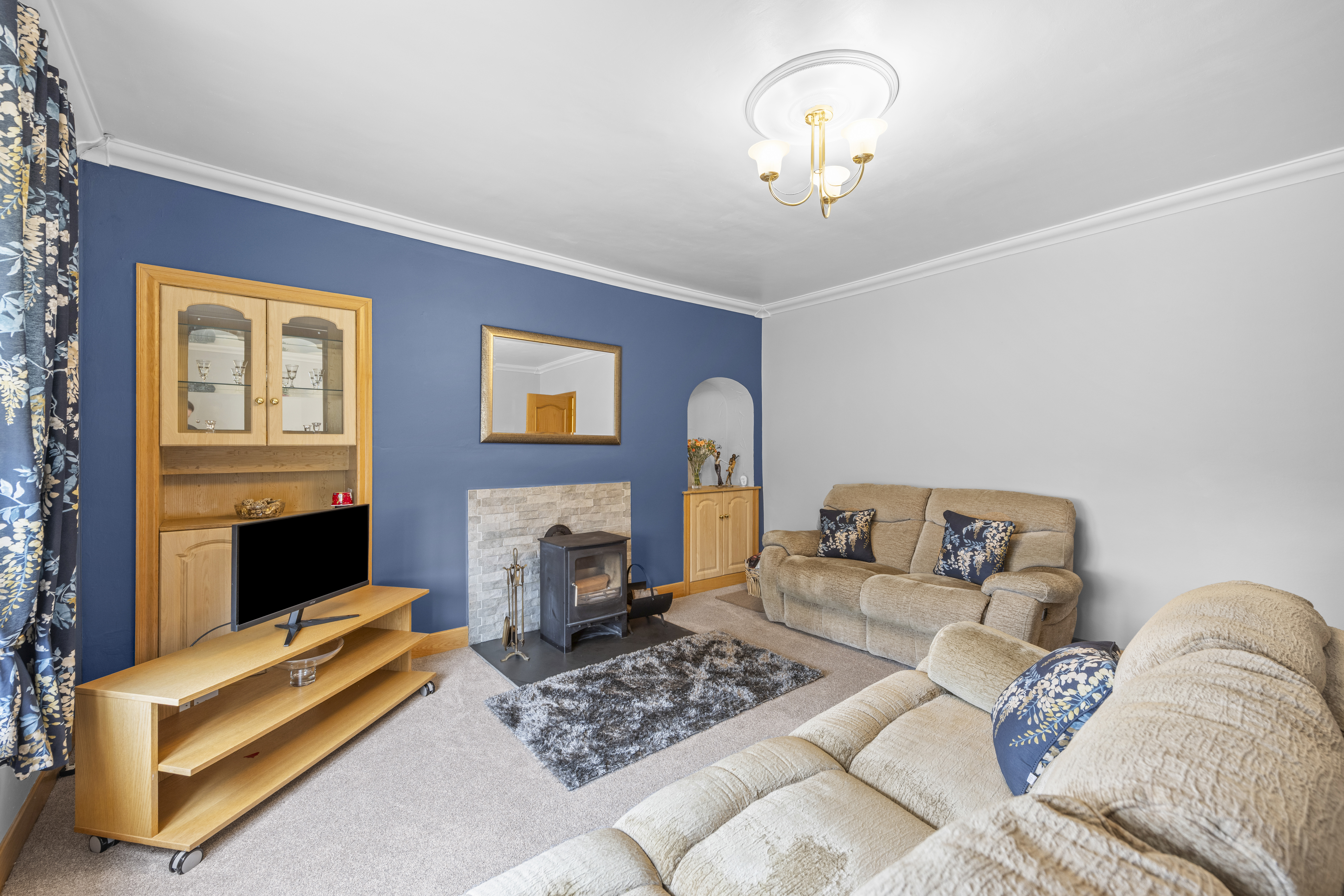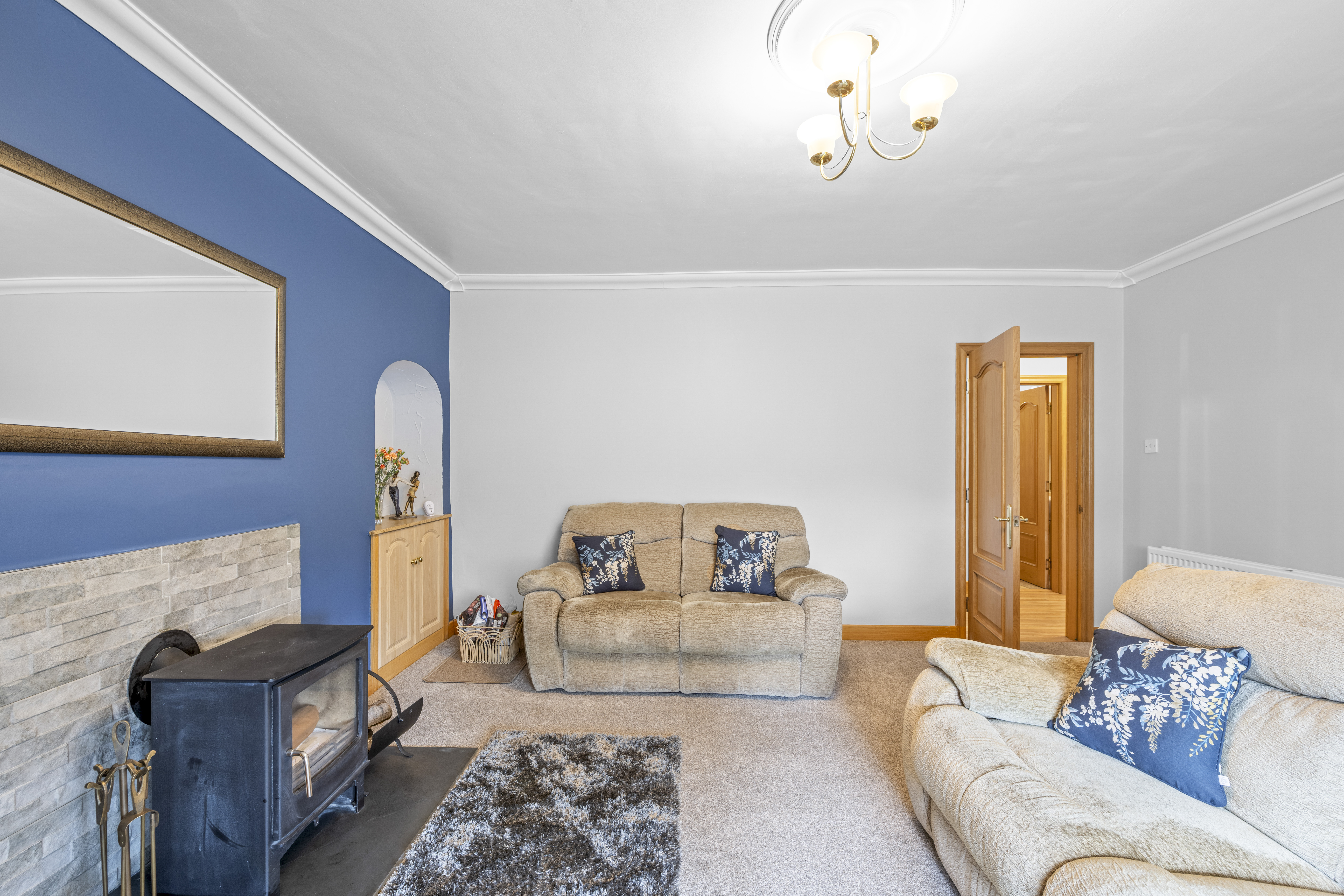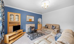A well proportioned Lounge is located to the front of the property offering striking bold accent to feature wall with calm neutral decor to adjoining walls. Quality neutral carpeting. The room offers log burning stove creating focal point. Large window providing lovely natural light.