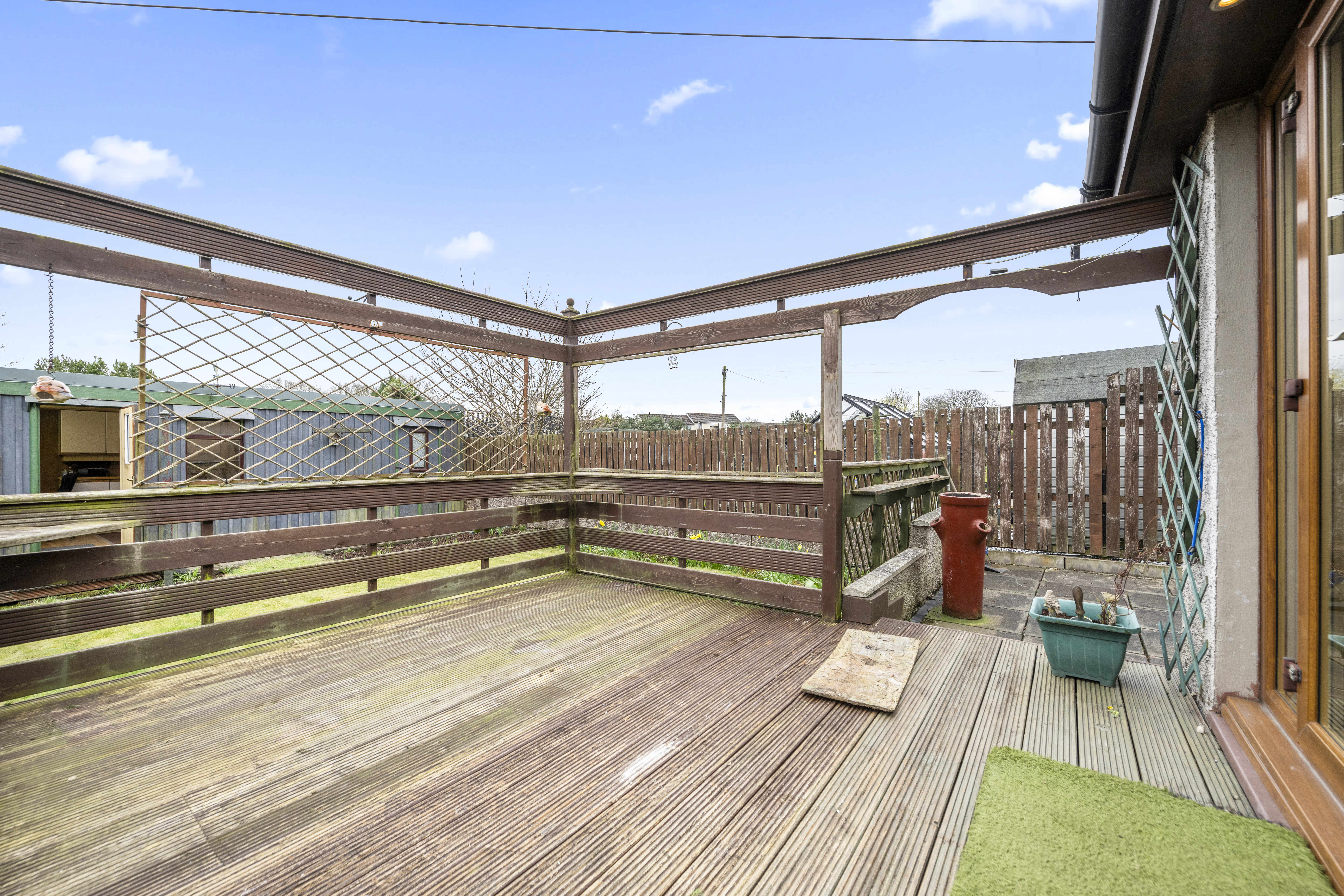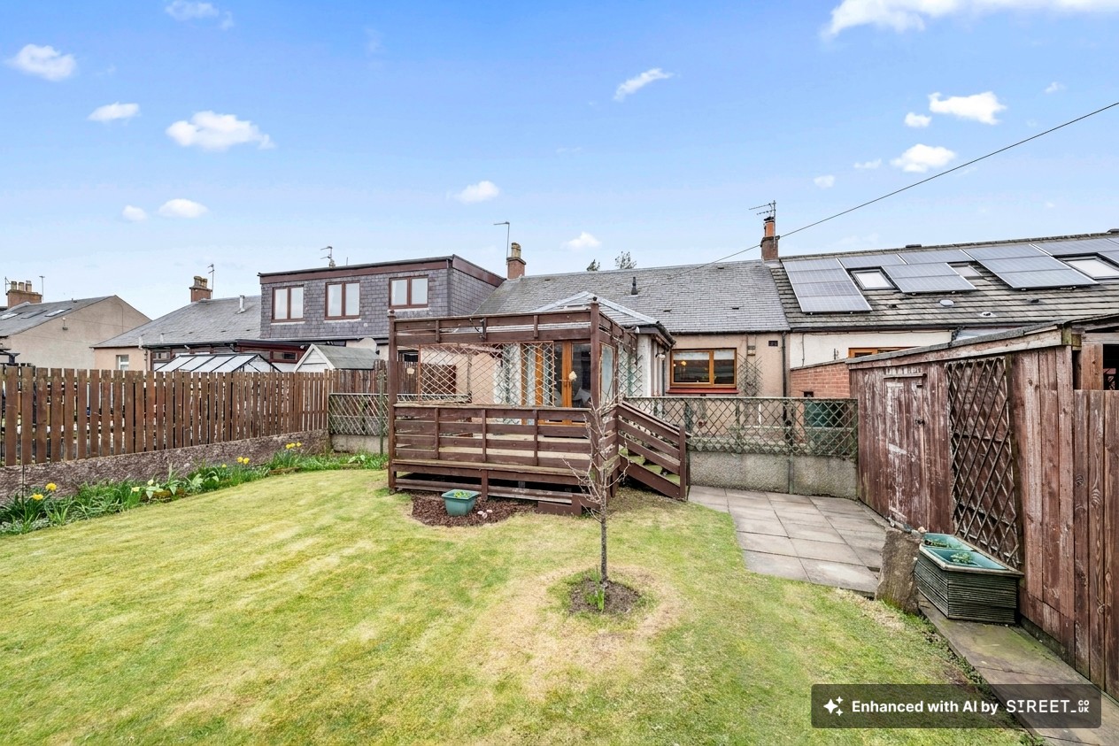 Lovely garden offering an area of decking, paved areas and a sweeping lawn with planted borders. Offering sunny south-easterly orientation the perfect place to relax and unwind with views directly over the Pumpherston Golf Course.