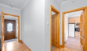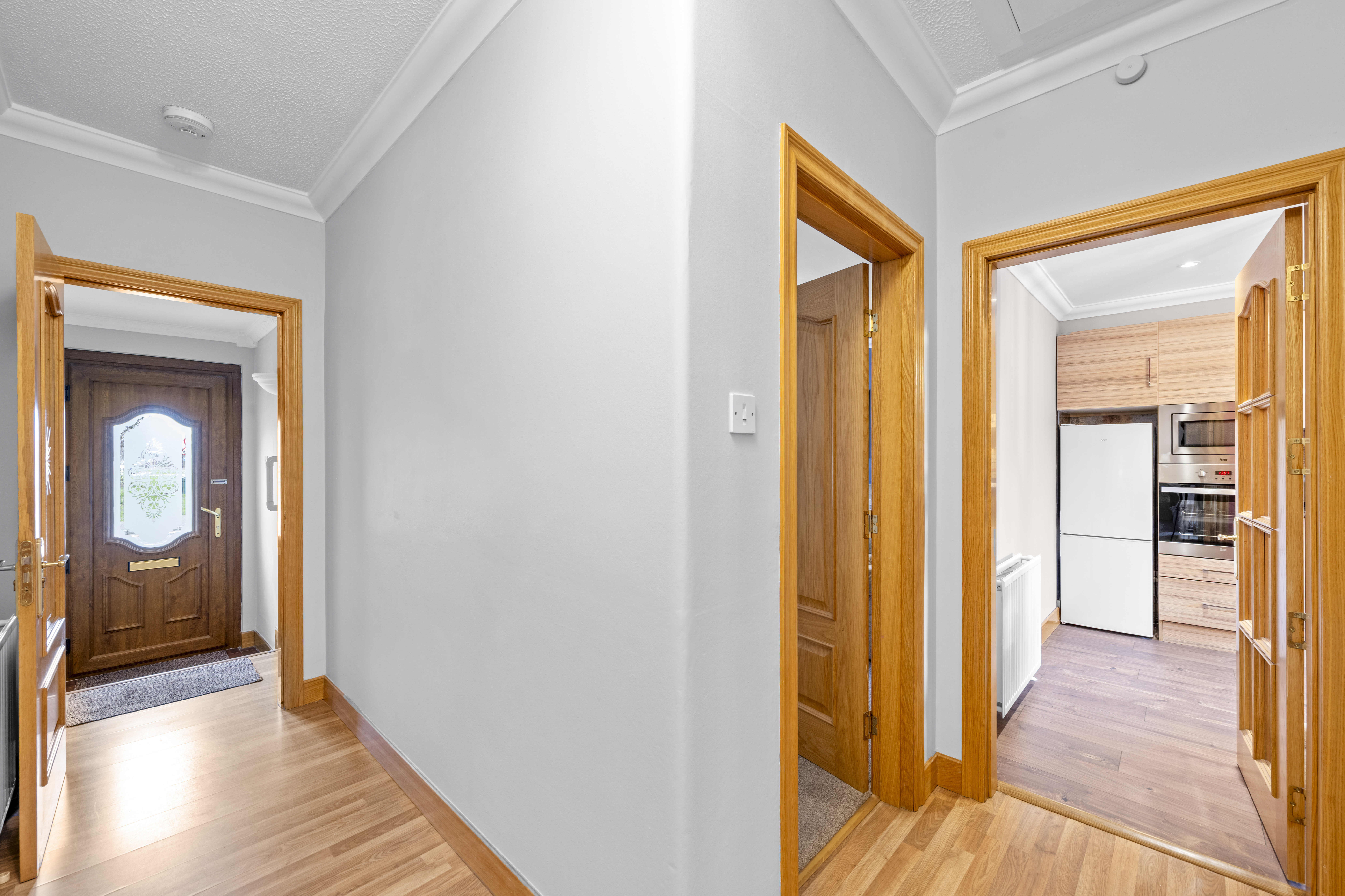 Entrance via UPVc partial glazed door leading to vestibule. Internal glazed door connects to hallway which offers neutral fresh decor complemented by solid wooden flooring.