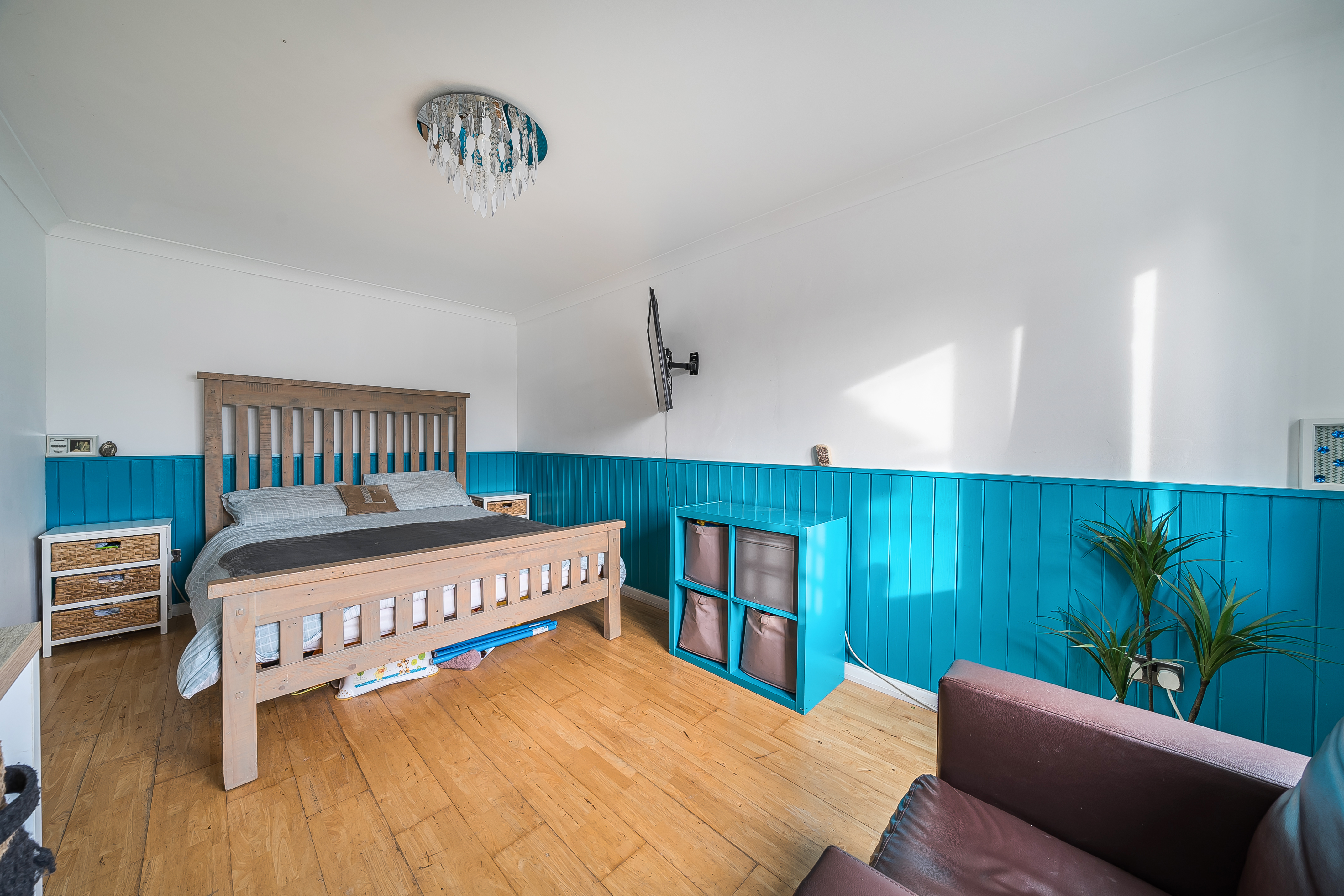 The ground floor accommodation includes an entrance hall, a cloakroom with W.C., a double bedroom that may also serve as a reception room, and a spacious kitchen featuring a range cooker. There is a dining room extension to the side with bi-folding doors opening onto the rear garden, along with internal access to the integral garage. To the rear of the property, a dual-aspect living room benefits from sliding patio doors leading directly to the garden.