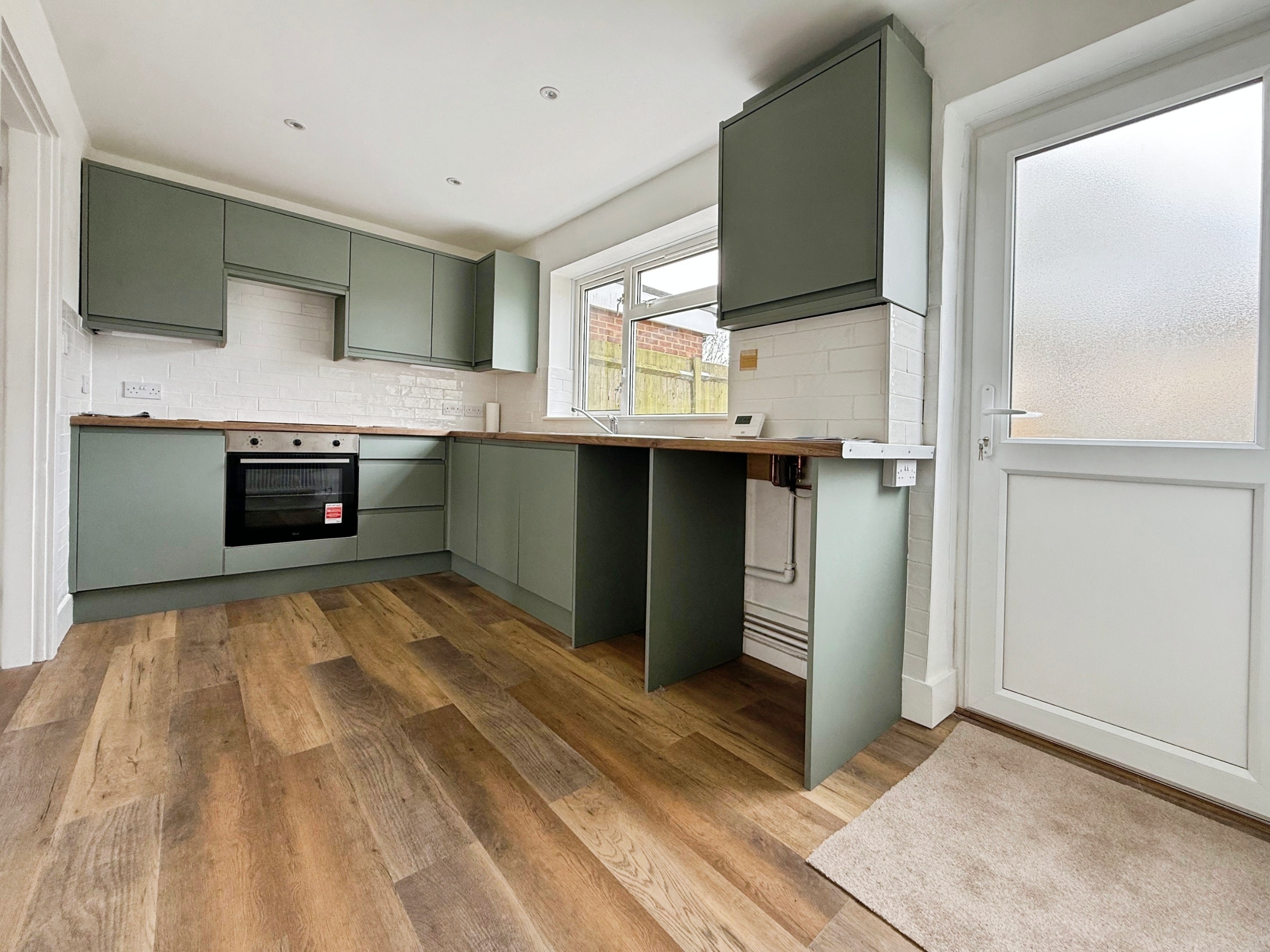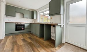 LVT flooring, a brand new fitted kitchen with a range of matching wall and base units, integrated Hoover oven, integrated Hoover induction hob over, space and plumbing for washing machine, space and plumbing for slimline dishwasher, space in a separate cubby hole for tall fridge/freezer, one and a half bowl stainless steel sink with side drainer, cupboard housing Worcester Bosch combi boiler, double glazed window to rear overlooking the garden, radiator, door leading to rear garden.