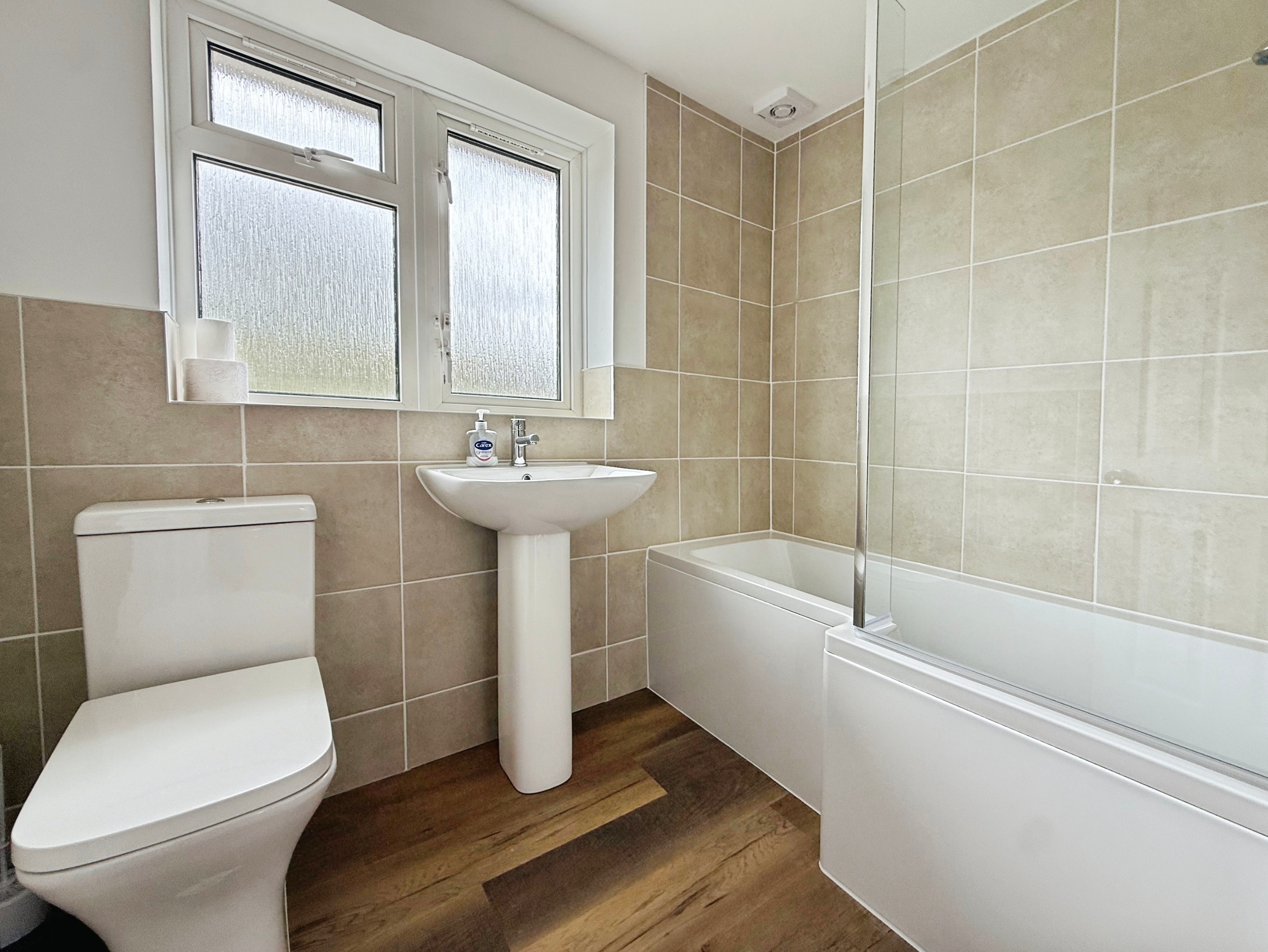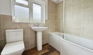 LVT flooring, bath with shower over, low level WC, wash hand basin, double glazed window to rear with obscure glass, heated towel rail.