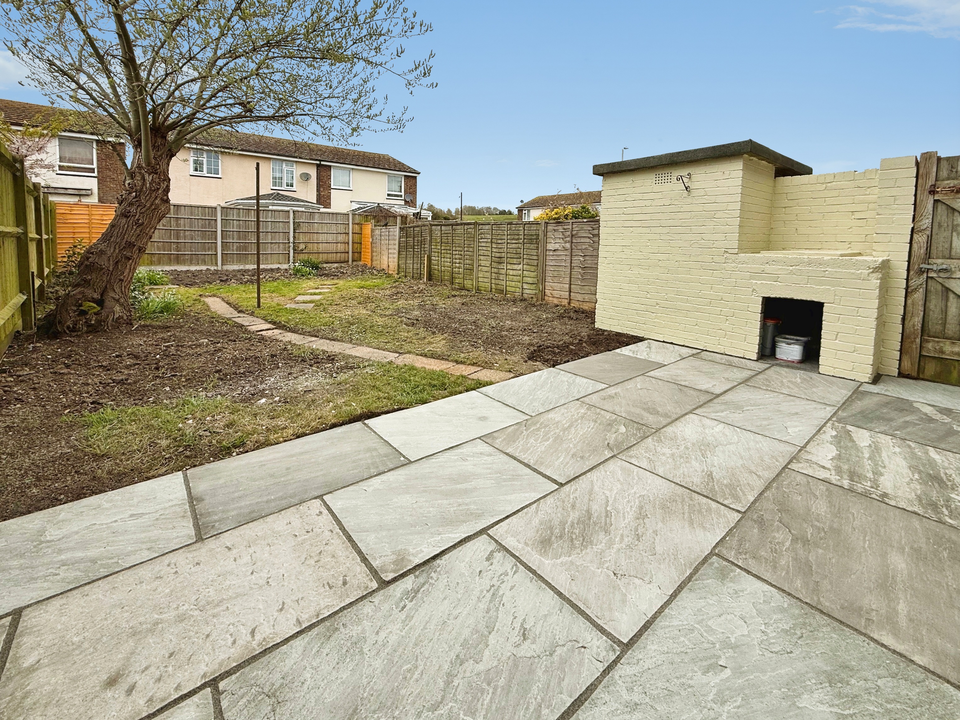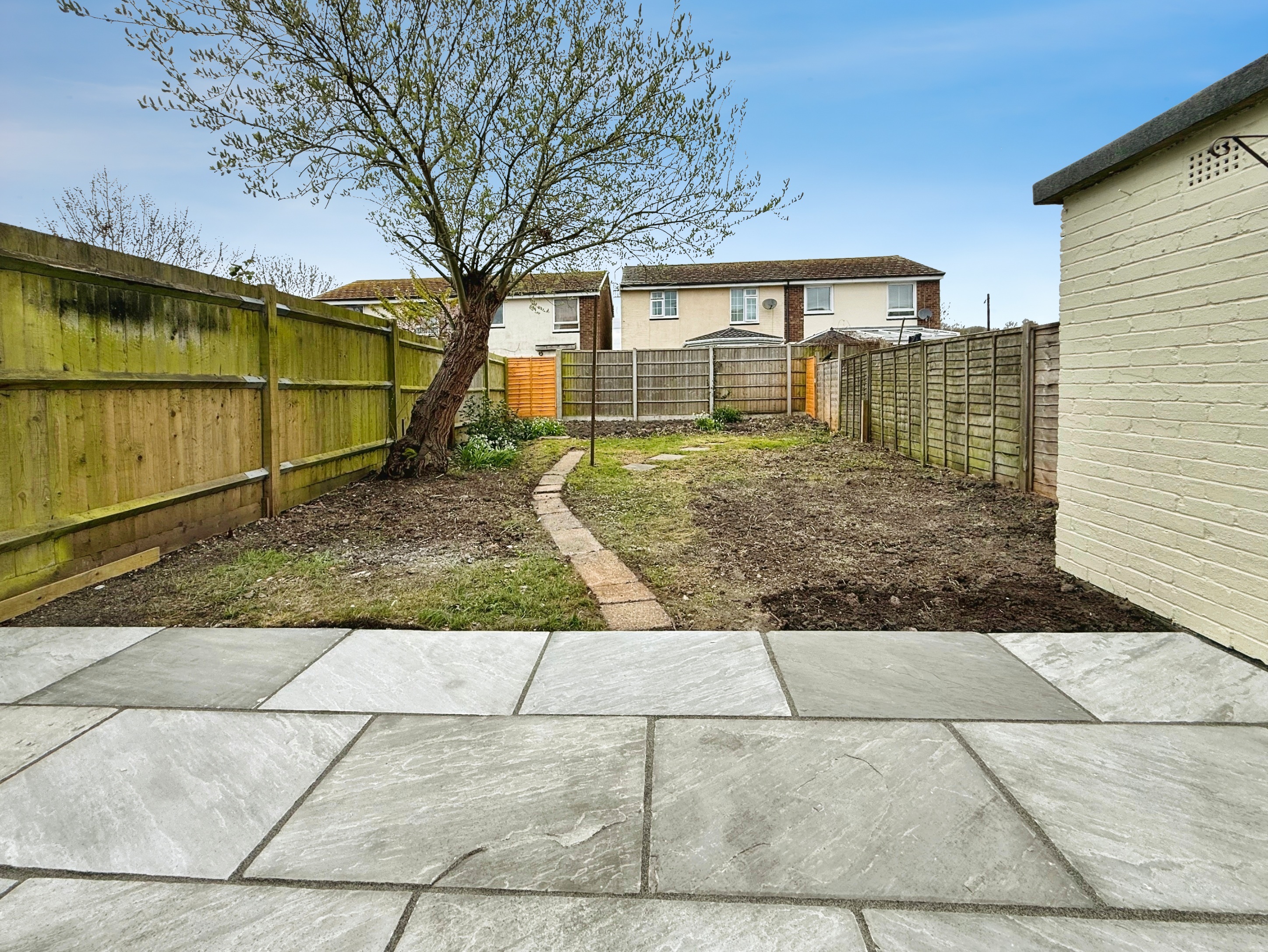 A patio to the immediate rear with lawn beyond and enclosed fencing.
