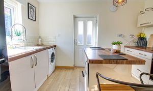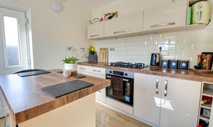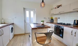 Front facing upvc double glazed window, fitted range of base and wall units, blow and half sink unit, electric oven and five ring gas hob, wine rack, over work surafce tiling, Centre Island, laminate flooring and radiator.