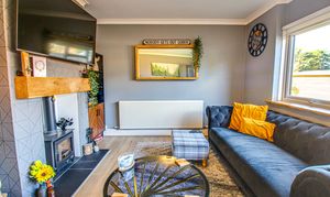 Rear facing upvc double glazed window, Inset Log Burner, Laminate flooring and radiator.
