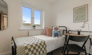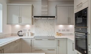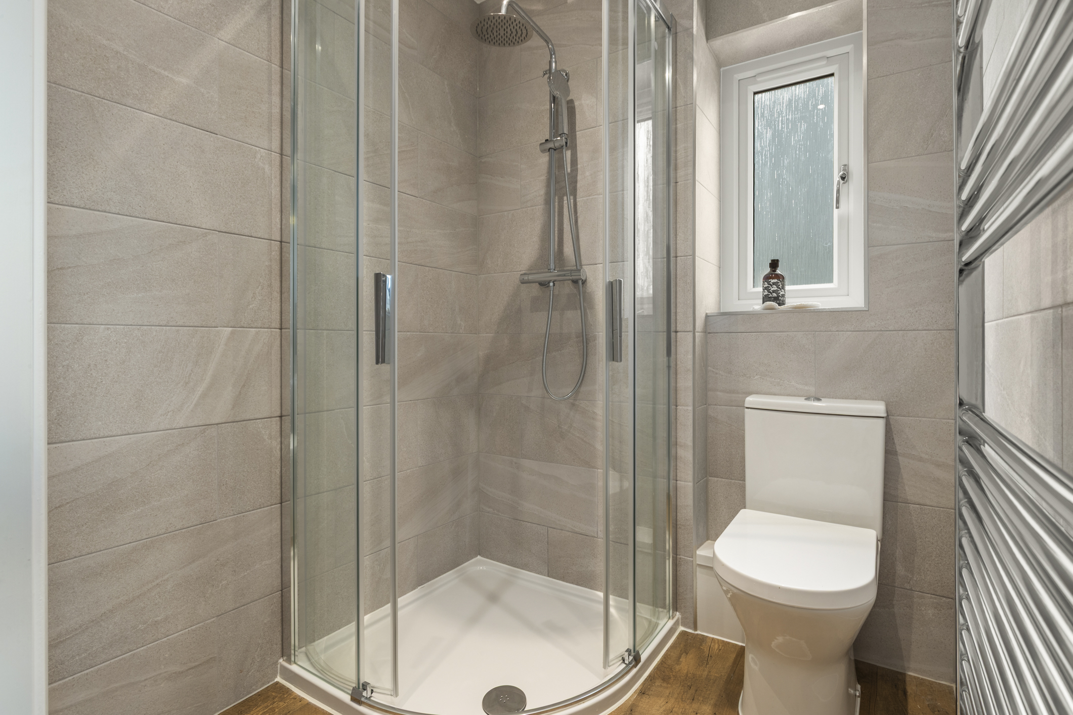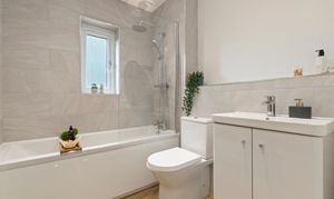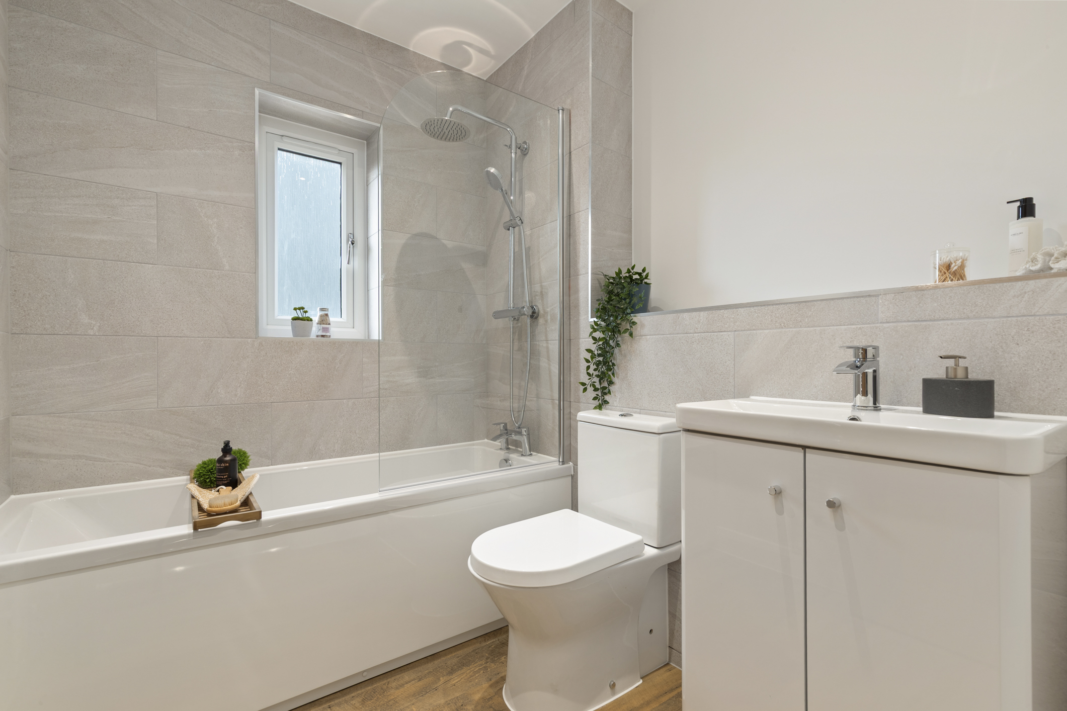 - Contemporary Family Bathroom: Fitted with modern fixtures, shower over bath.