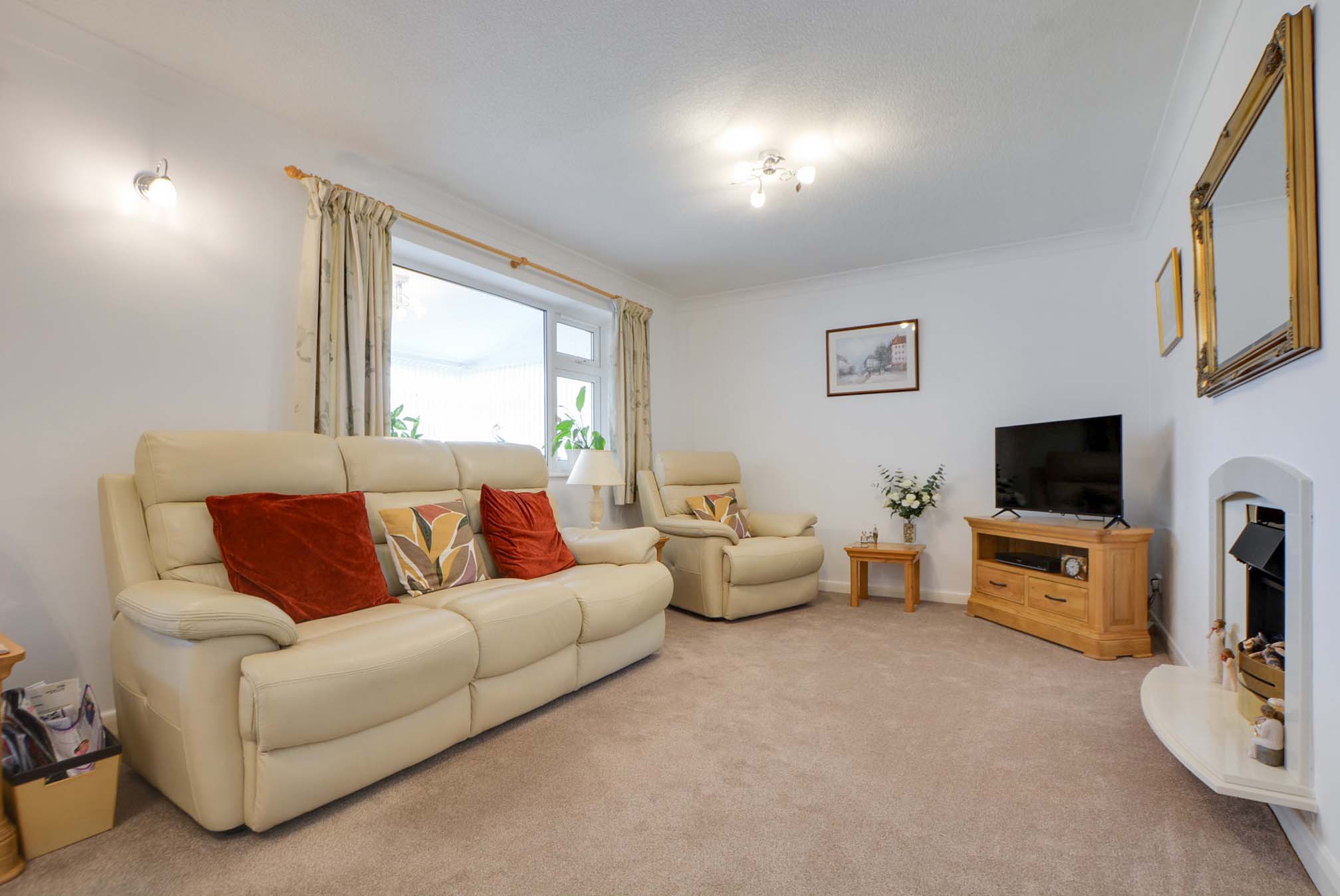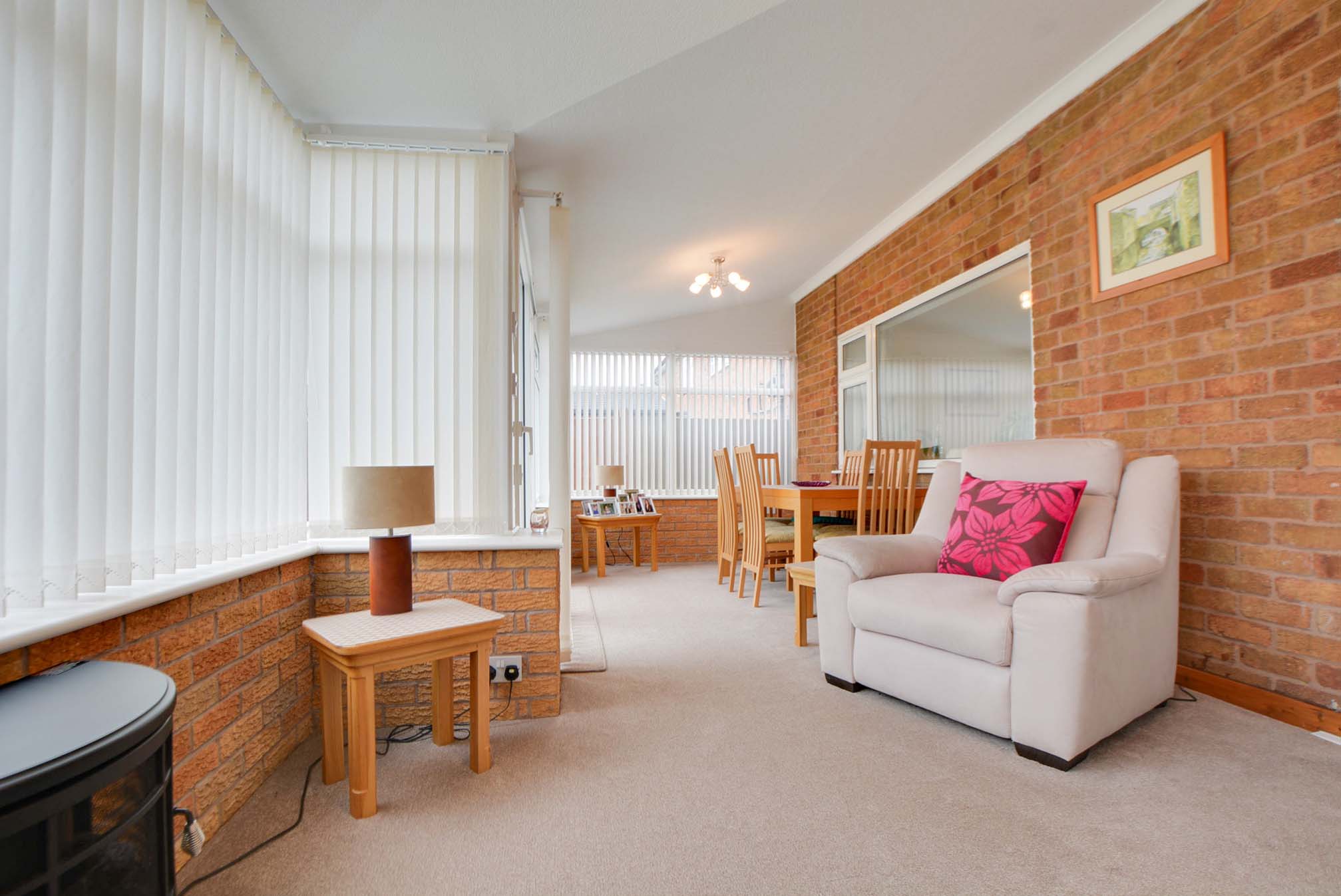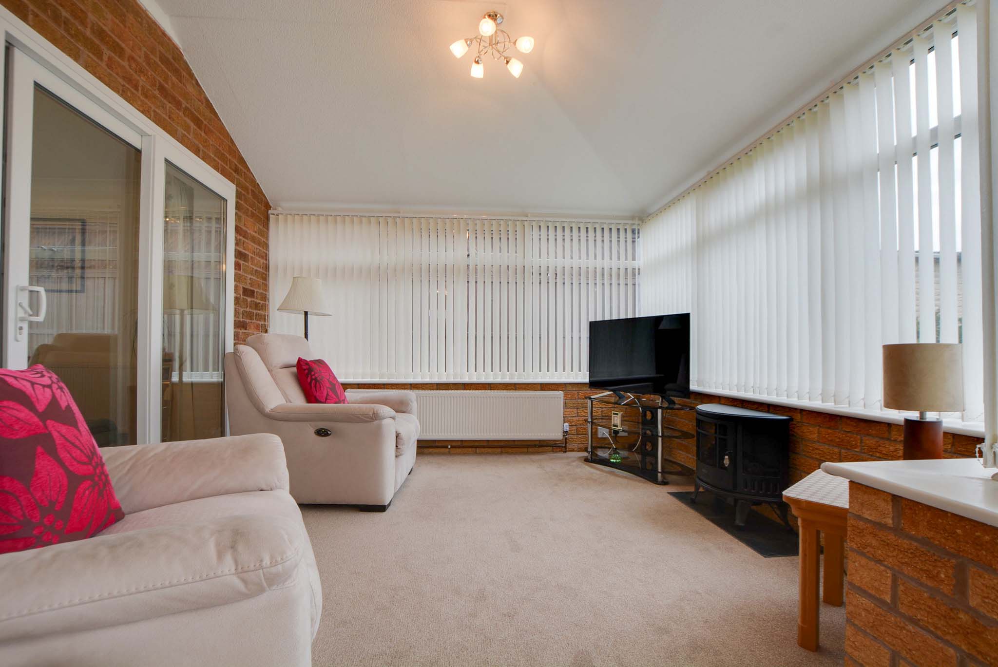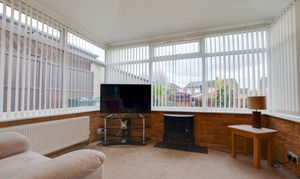 A light and airy space with a double-glazed window to the rear elevation, double-glazed sliding patio doors to the conservatory, a wall-mounted electric fire with surround and hearth, a TV point, a radiator, and coving to the ceiling.