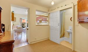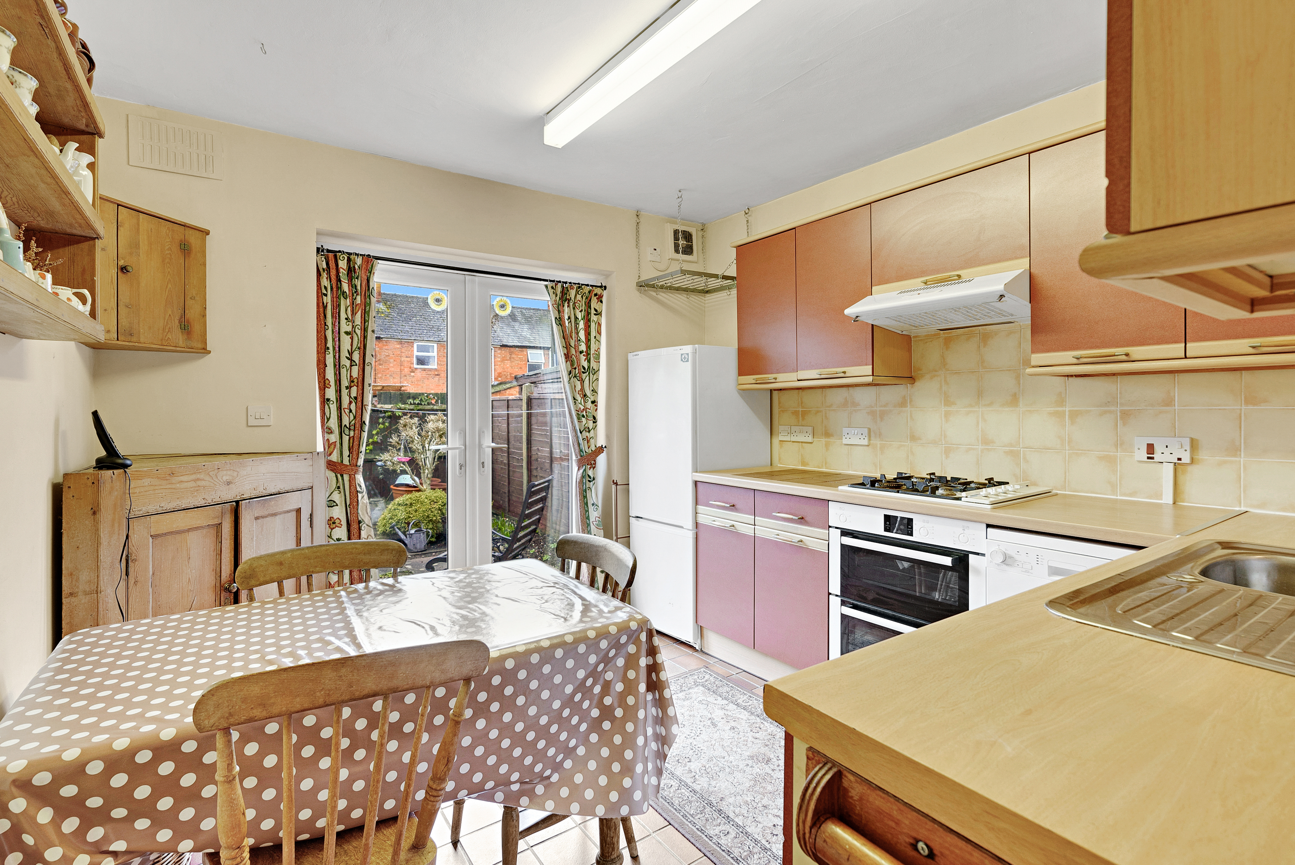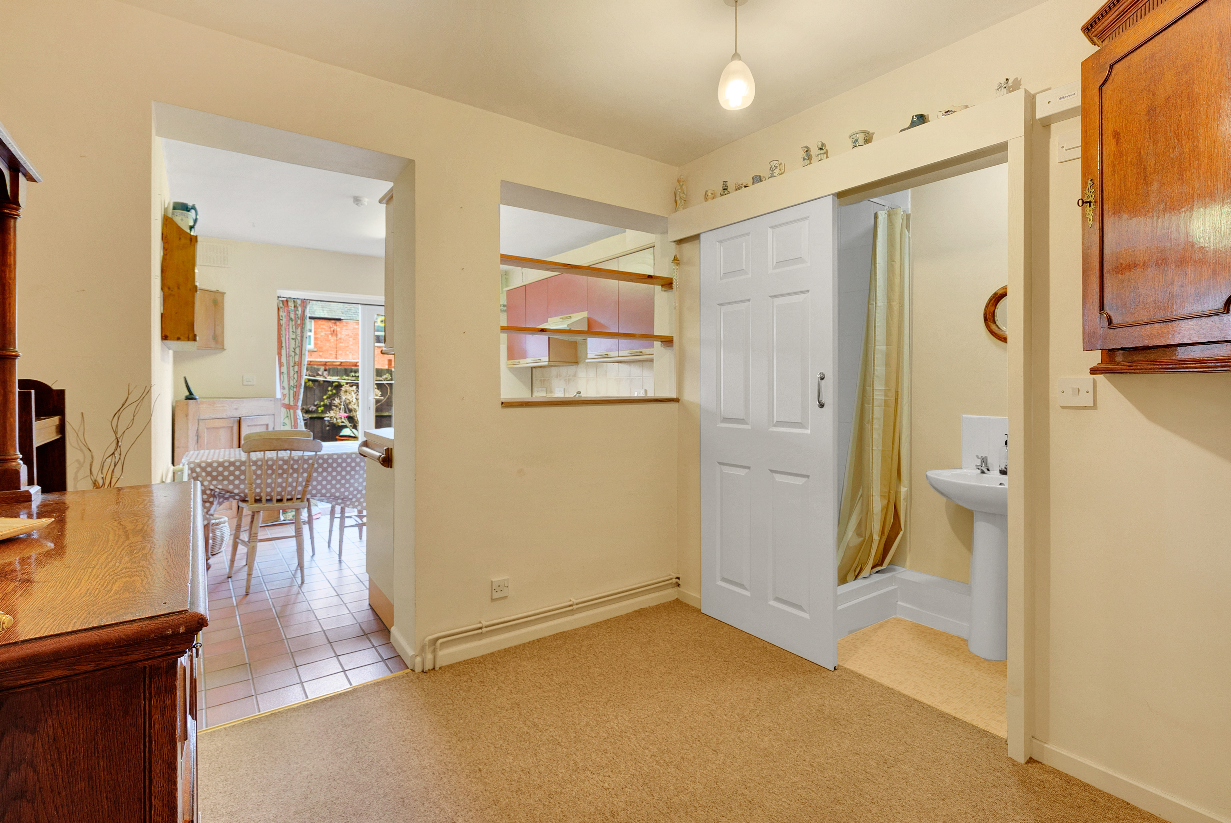 The accommodation begins with an entrance porch leading through to a comfortable sitting room, a light and inviting space with stairs rising to the first floor. Beyond, a separate dining room provides an ideal setting for everyday meals or entertaining, complemented by an adjoining cloakroom/ shower room that adds welcome practicality to the ground floor layout. To the rear of the property, the kitchen is fitted with a range of cupboard units and includes a built-in cooker, hob and extractor. Patio doors open directly onto the garden, creating a natural connection between indoor and outdoor living.