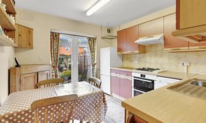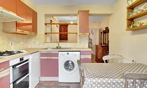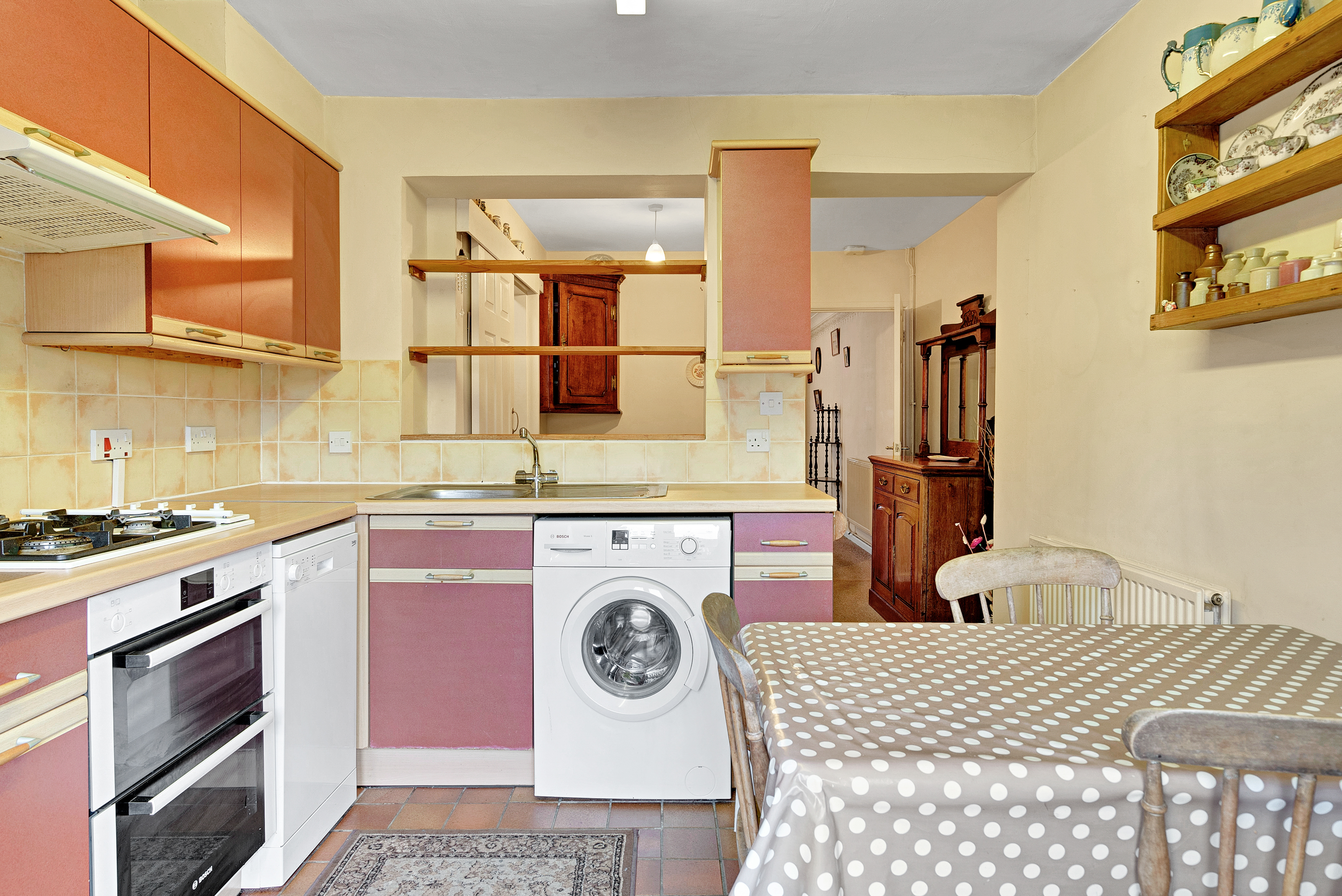 - Kitchen with a range of fitted cupboard units, built in cooker, hob and extractor and patio doors opening onto the rear garden