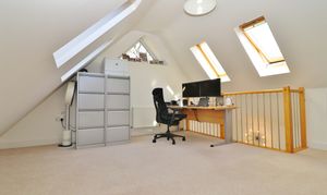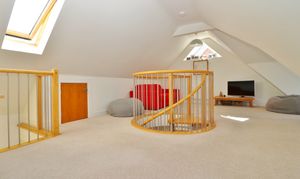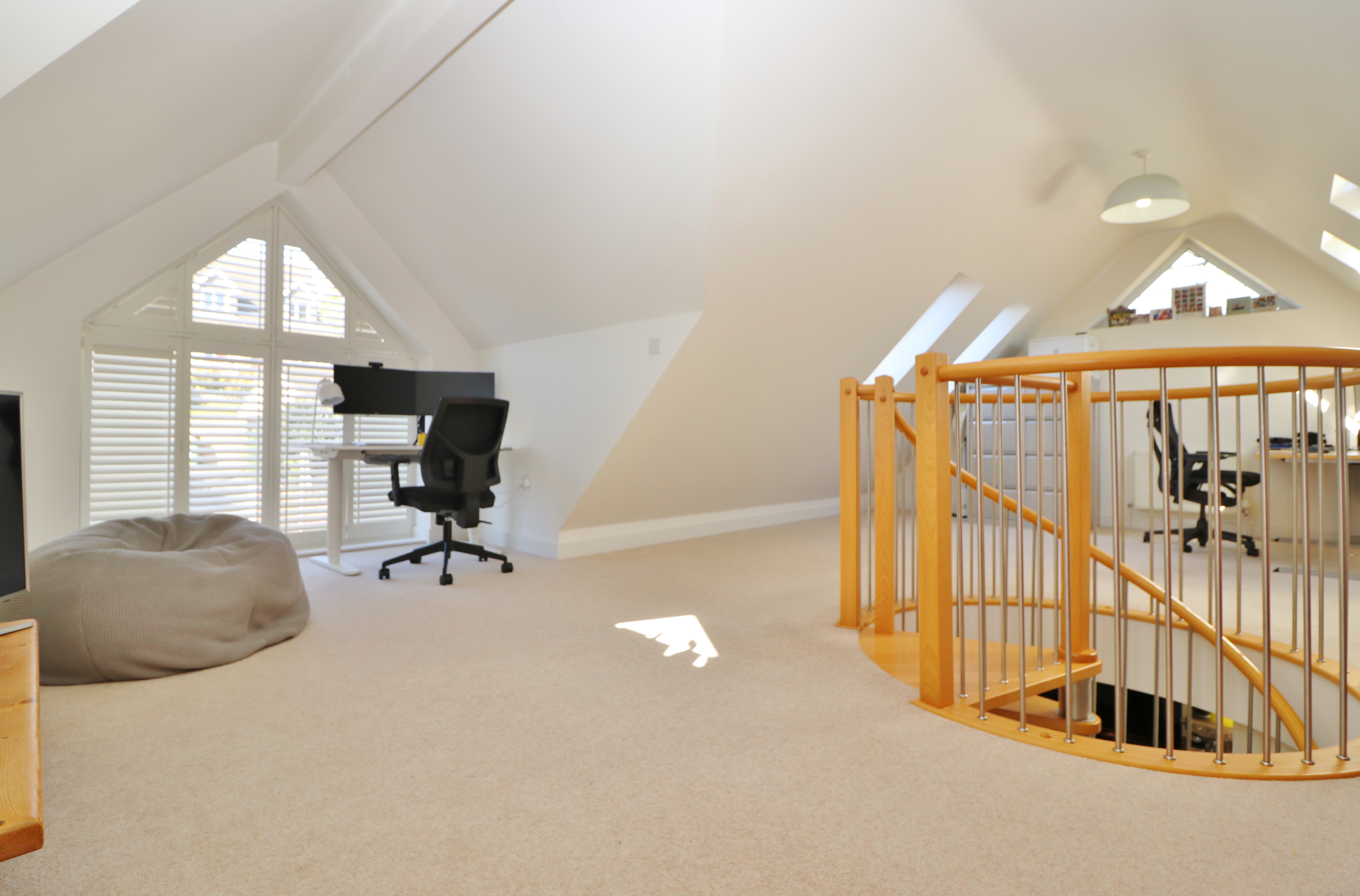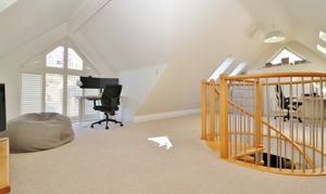 On the ground floor there is a stylish kitchen/breakfast room with adjoining utility, WC and a wonderful dining room with a vaulted ceiling and balcony, whilst the first floor offers a 23ft family room/office.