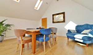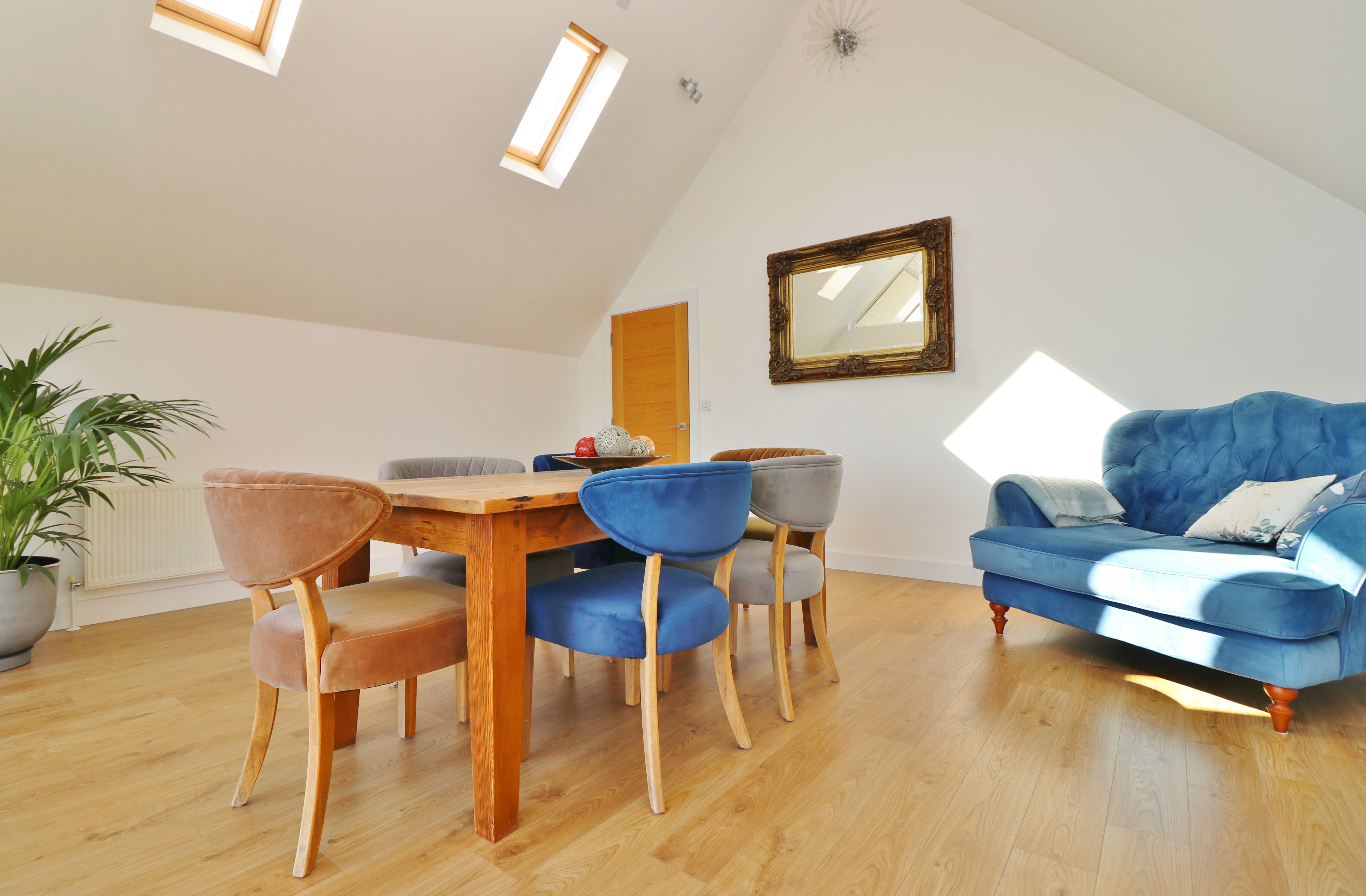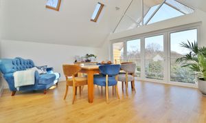 The impressive dining room features a vaulted ceiling with skylight windows and bi-folding doors leading onto the balcony, which enjoys beautiful, far reaching views across local countryside.
