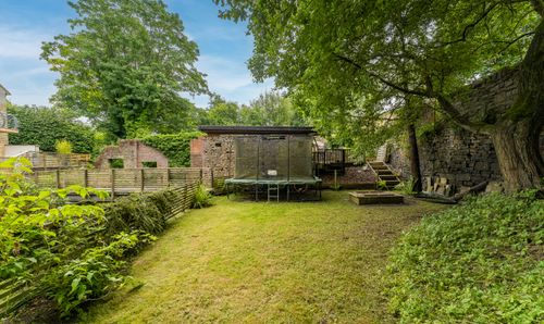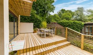 To the front, terraced stone and chipped borders and a variety of mature shrubs and plants frame the driveway, while slatted fencing ties the raised deck in with the bridges and tranquil pathways that lead past the romantic ruins of the old mill to the detached annexe.