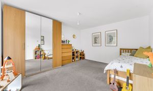 The crisp white paintwork continues upstairs on a landing with built-in storage, which opens to a large balcony forming the entrance canopy below. The soft grey carpet underfoot continues in all five double bedrooms, split over the middle and top floors.