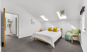 Decorated in calming, neutral tones, the impressive double-height master suite features large rear windows and glazed double doors to your private balcony, where you can enjoy a quiet coffee while listening to the waterfall.