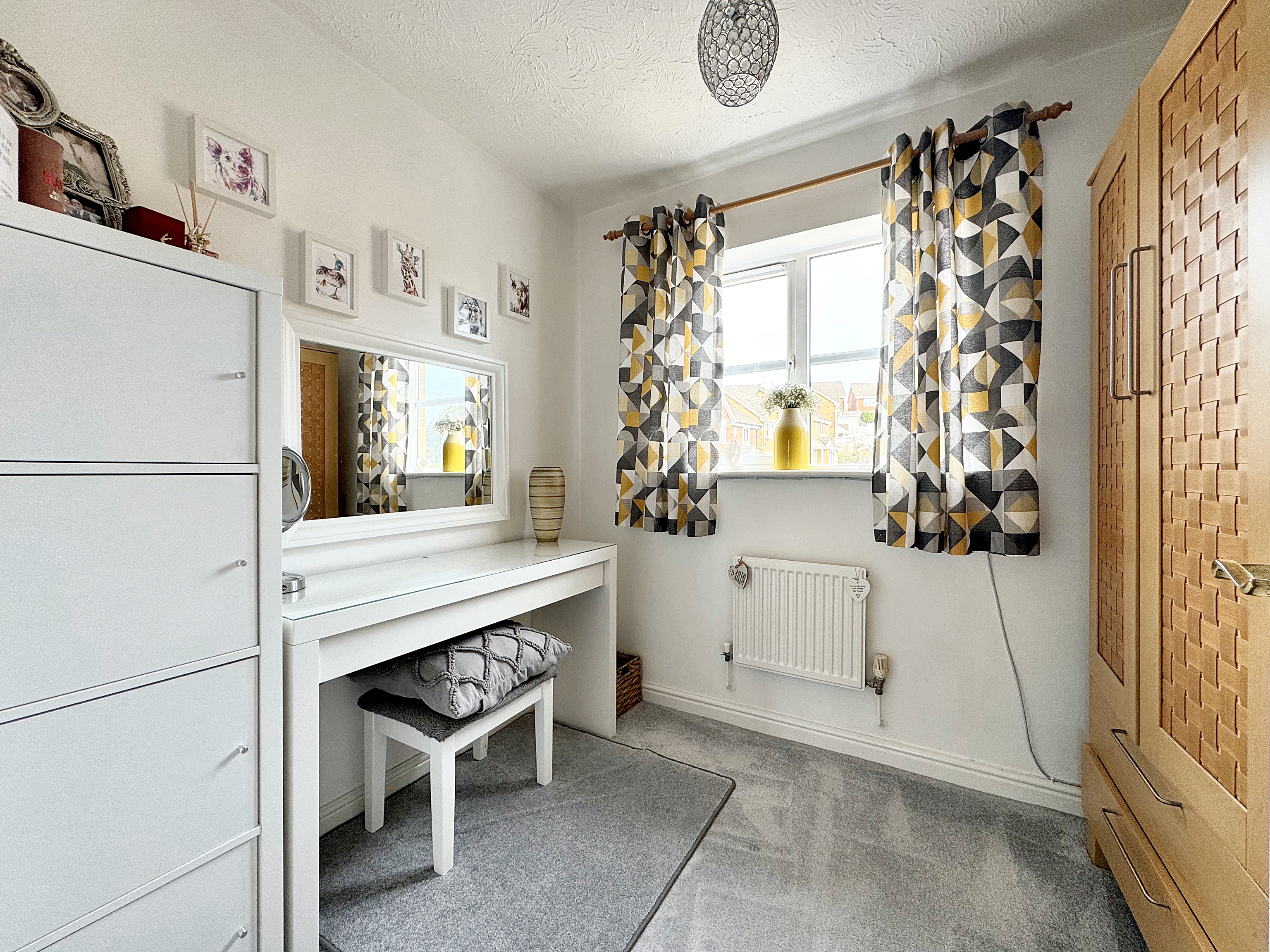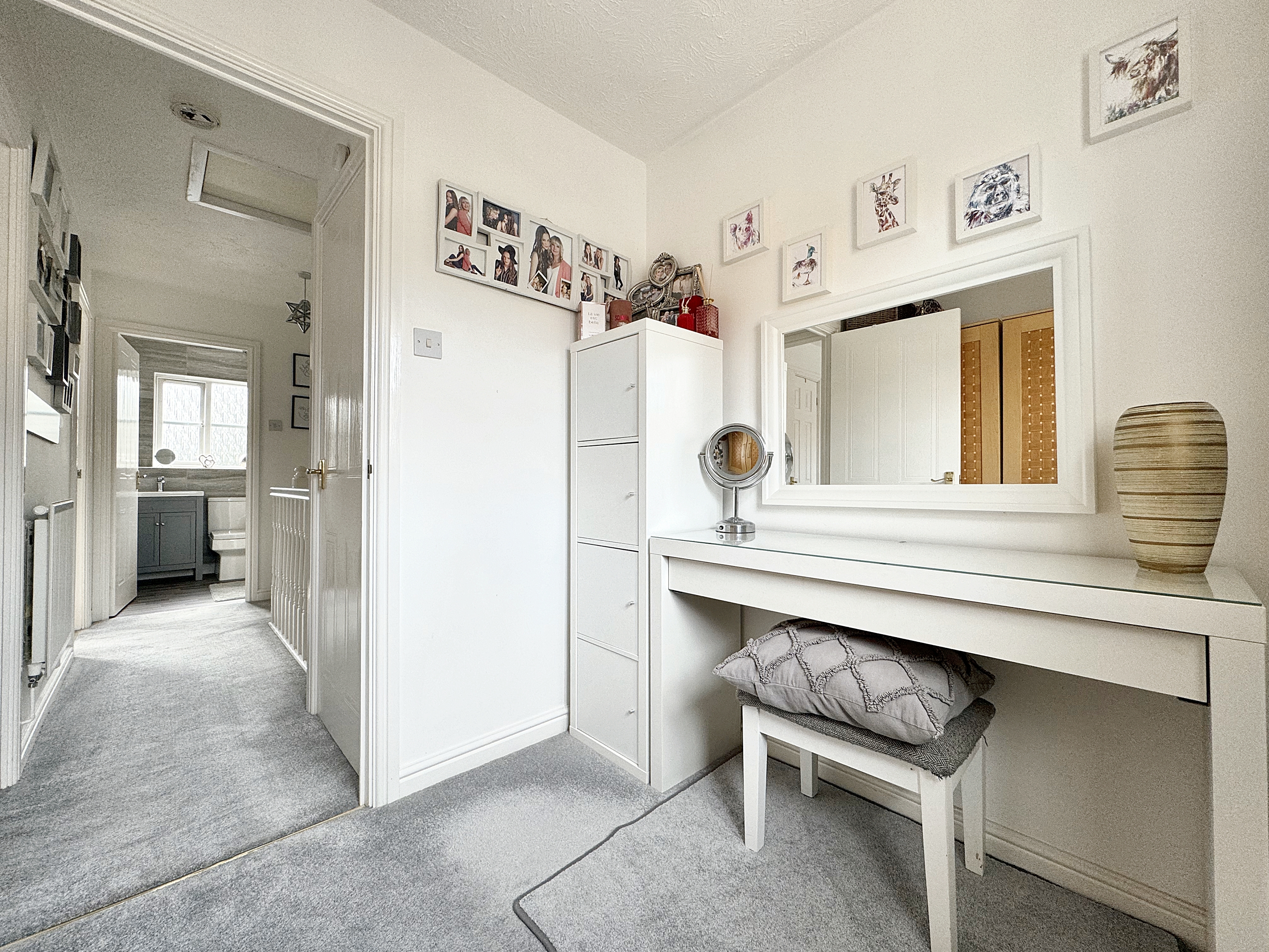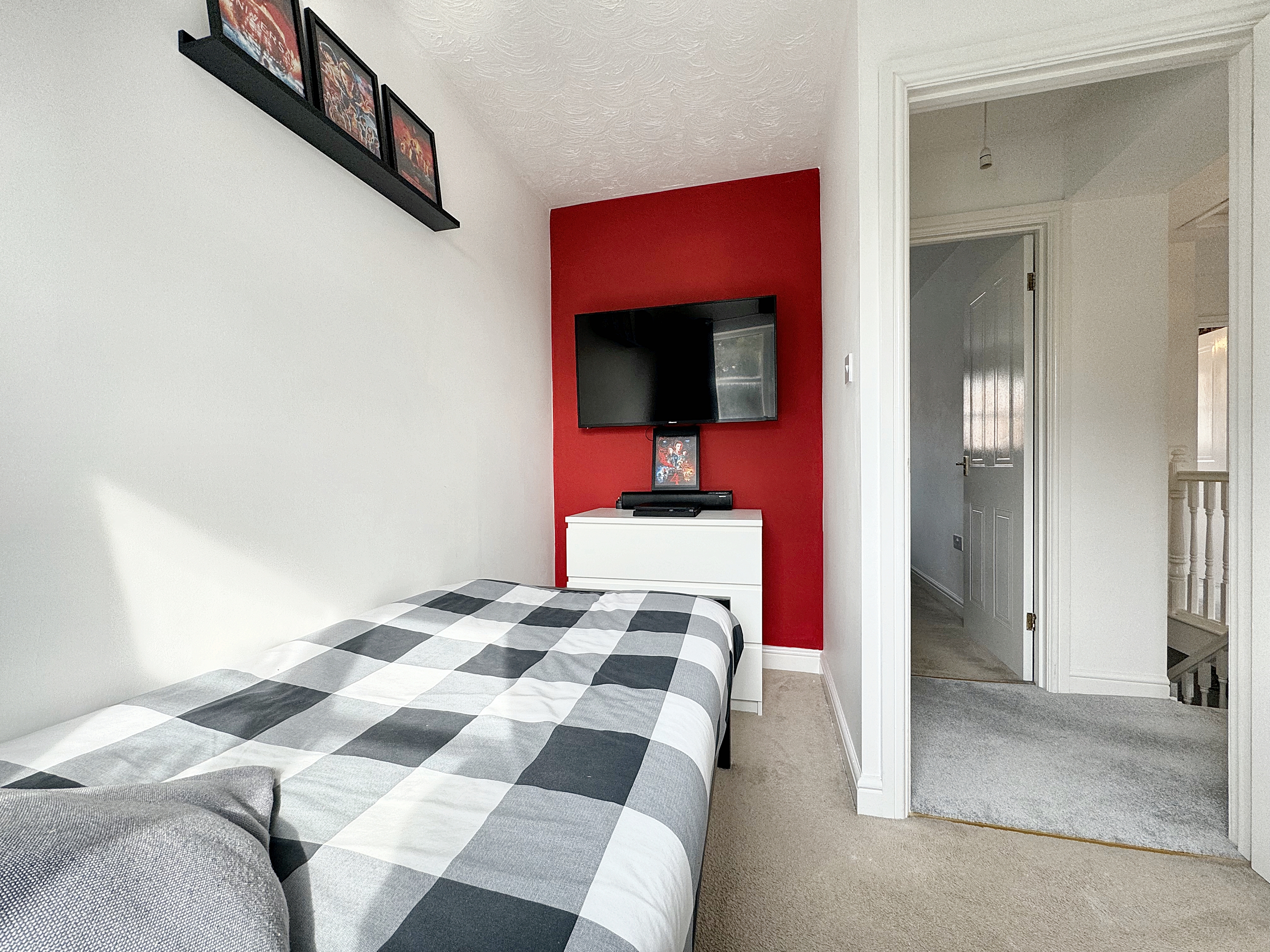The opposite side of the staircase and to the front of the property we have bedroom three. A large bedroom with ample space for bedroom furniture and storage. There is carpet and smooth walls, artex ceiling and a front facing window.