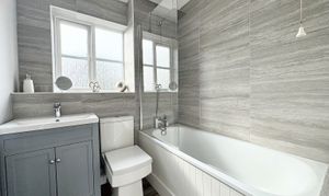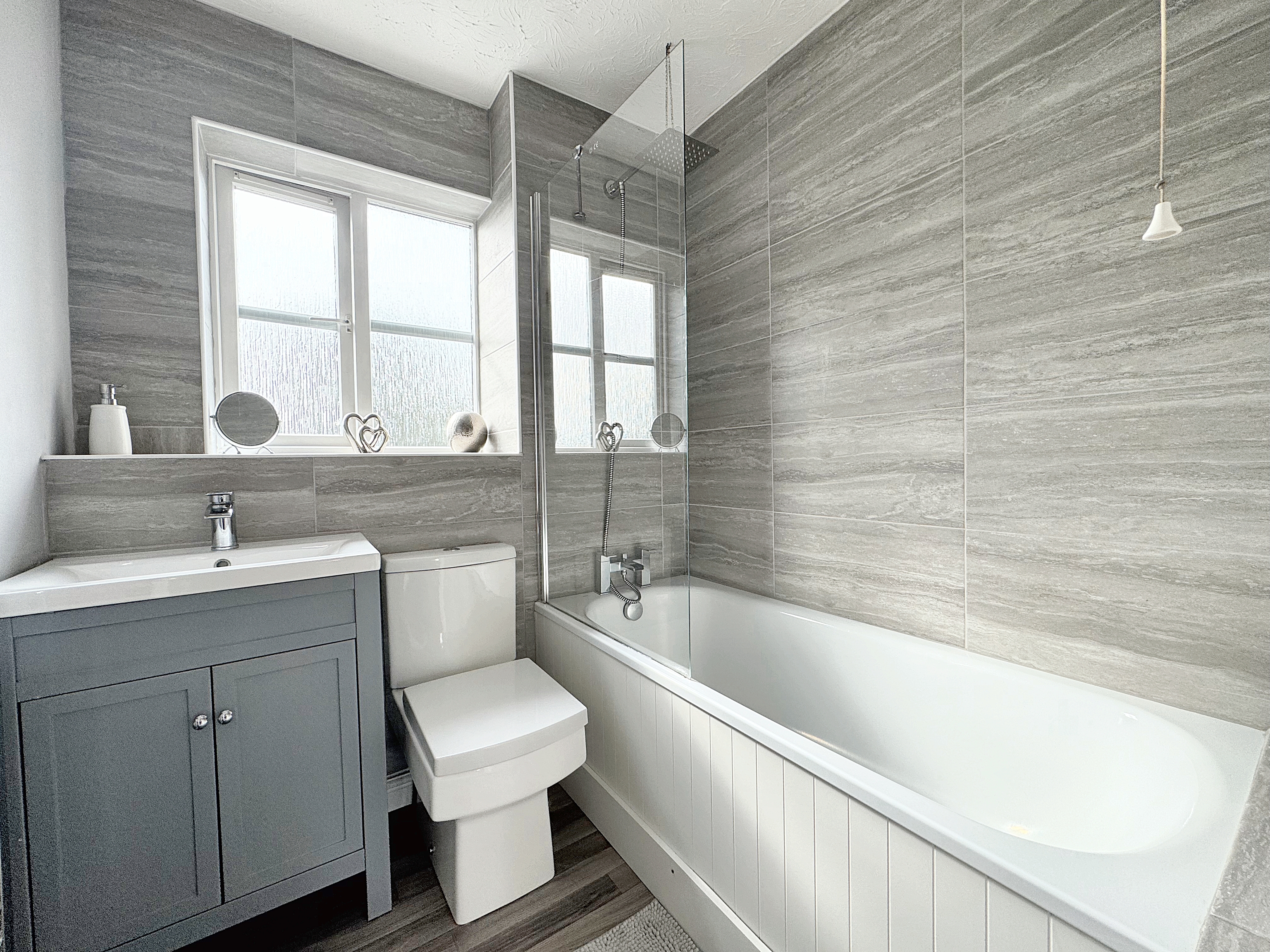 The bathroom is situated on the first floor and to the rear of the property looking out over the garden. The floor is lino and the walls are tiled with artex ceiling, the suite comprises of a bath, overhead shower, sink, toilet and vanity.