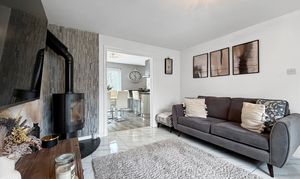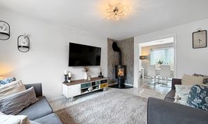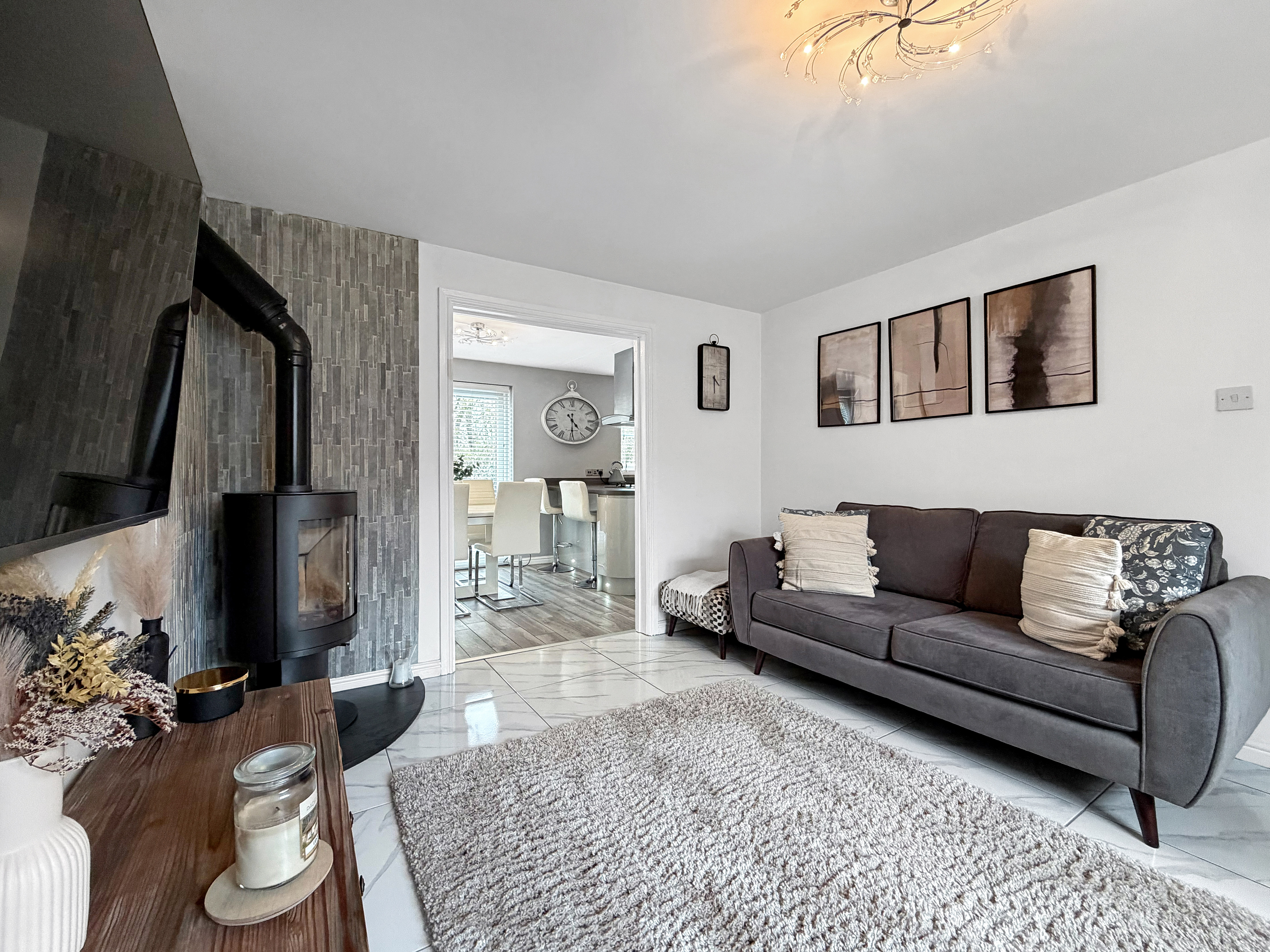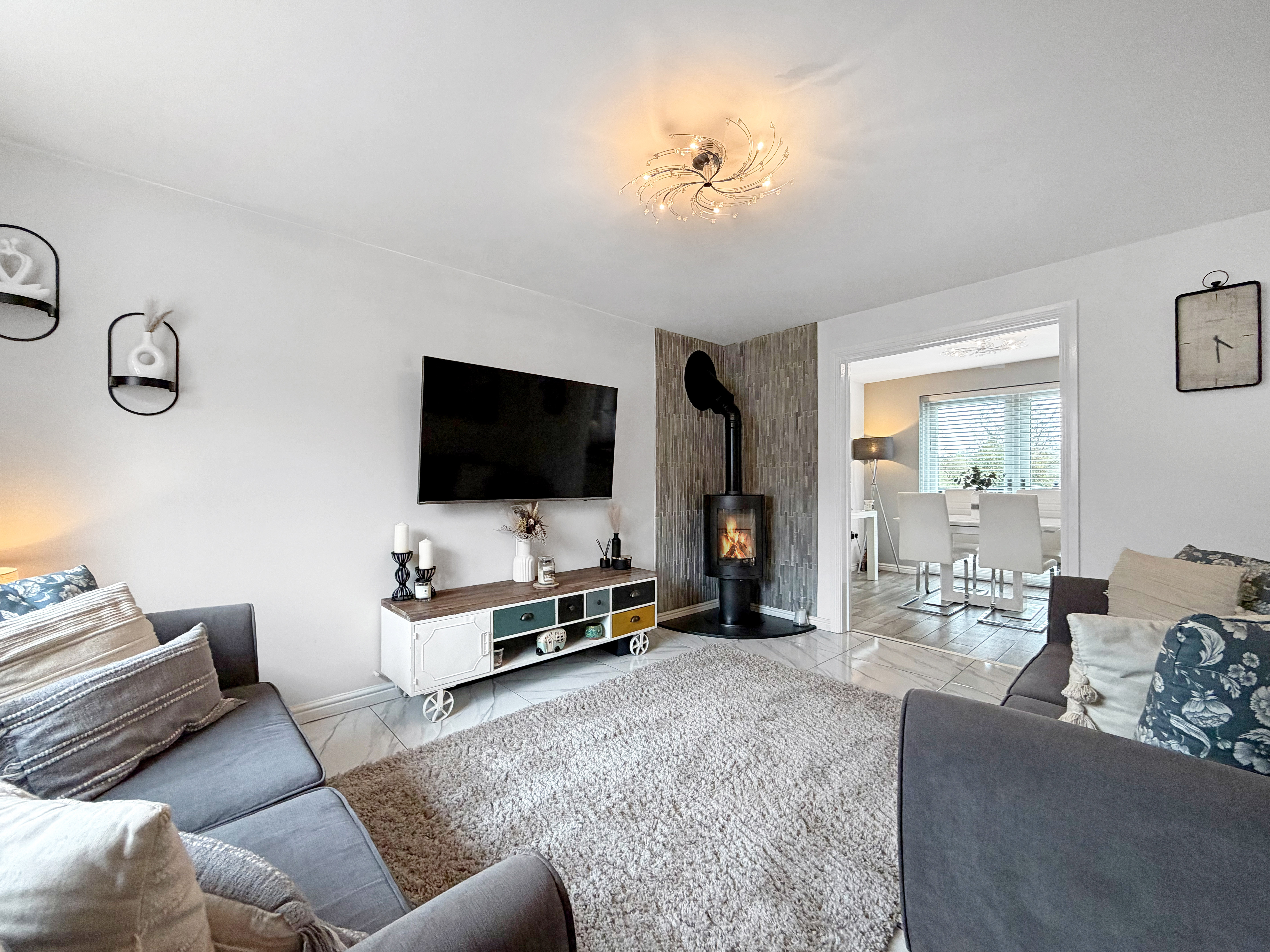 Entrance via a wooden door, leads you into the lounge area that is lit up by the front facing window, with tiled floors throughout, painted walls and ceilings with a smooth finish, this modern lounge is the perfect place to relax. With access into the kitchen/diner, the large rear french doors draw in more light and really frames the view out to the rear and beautiful log burner.