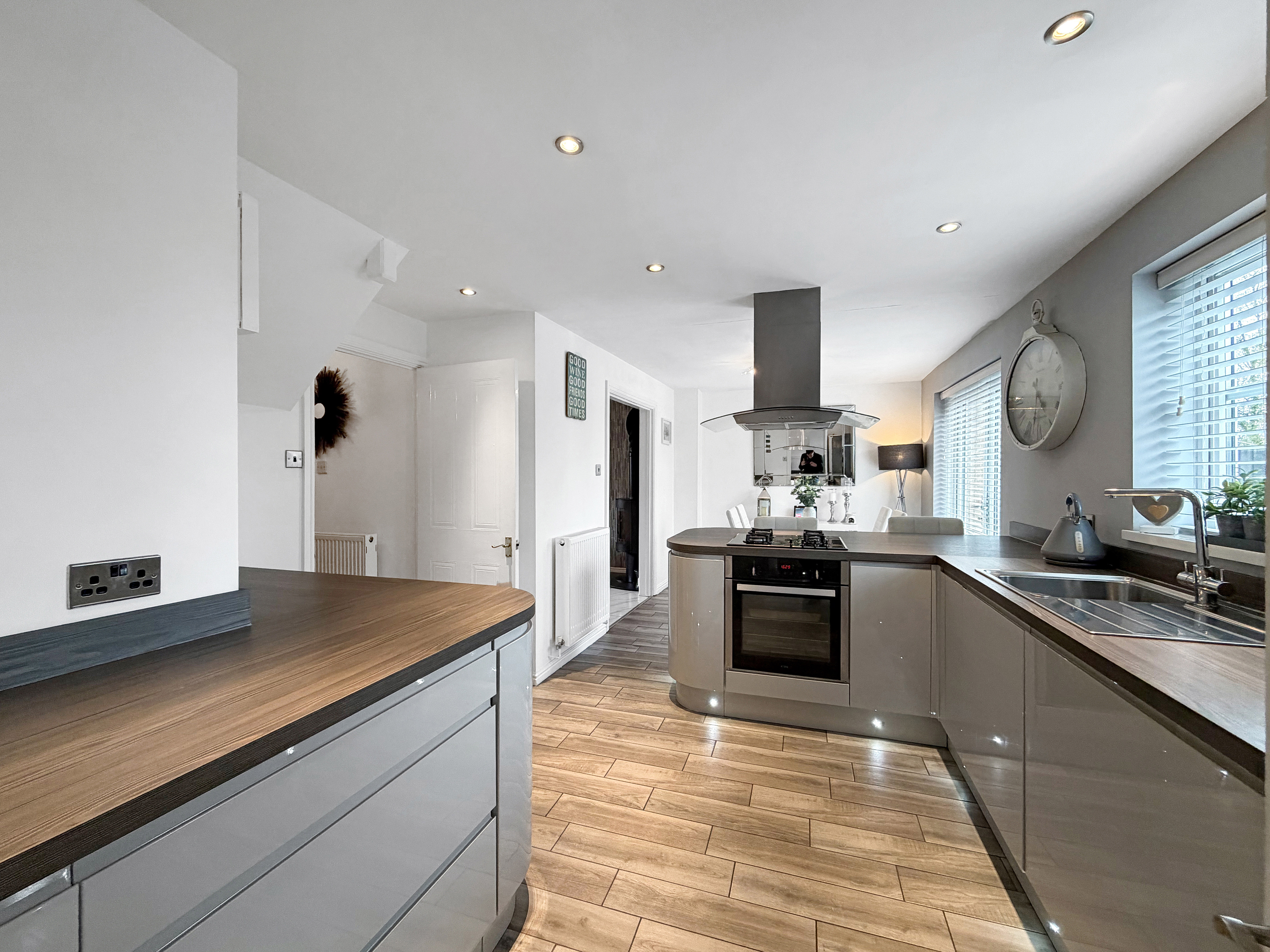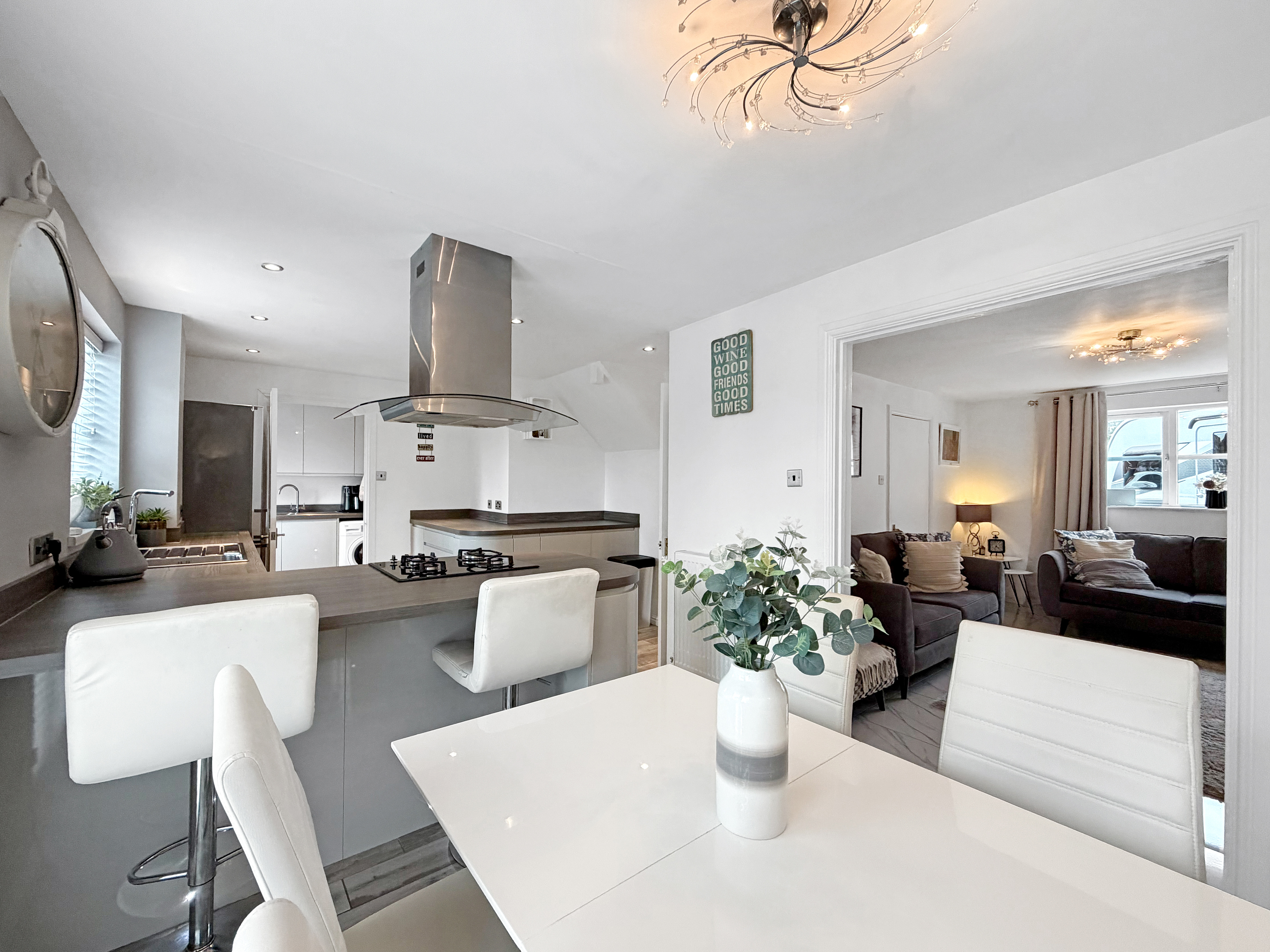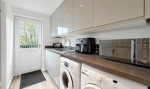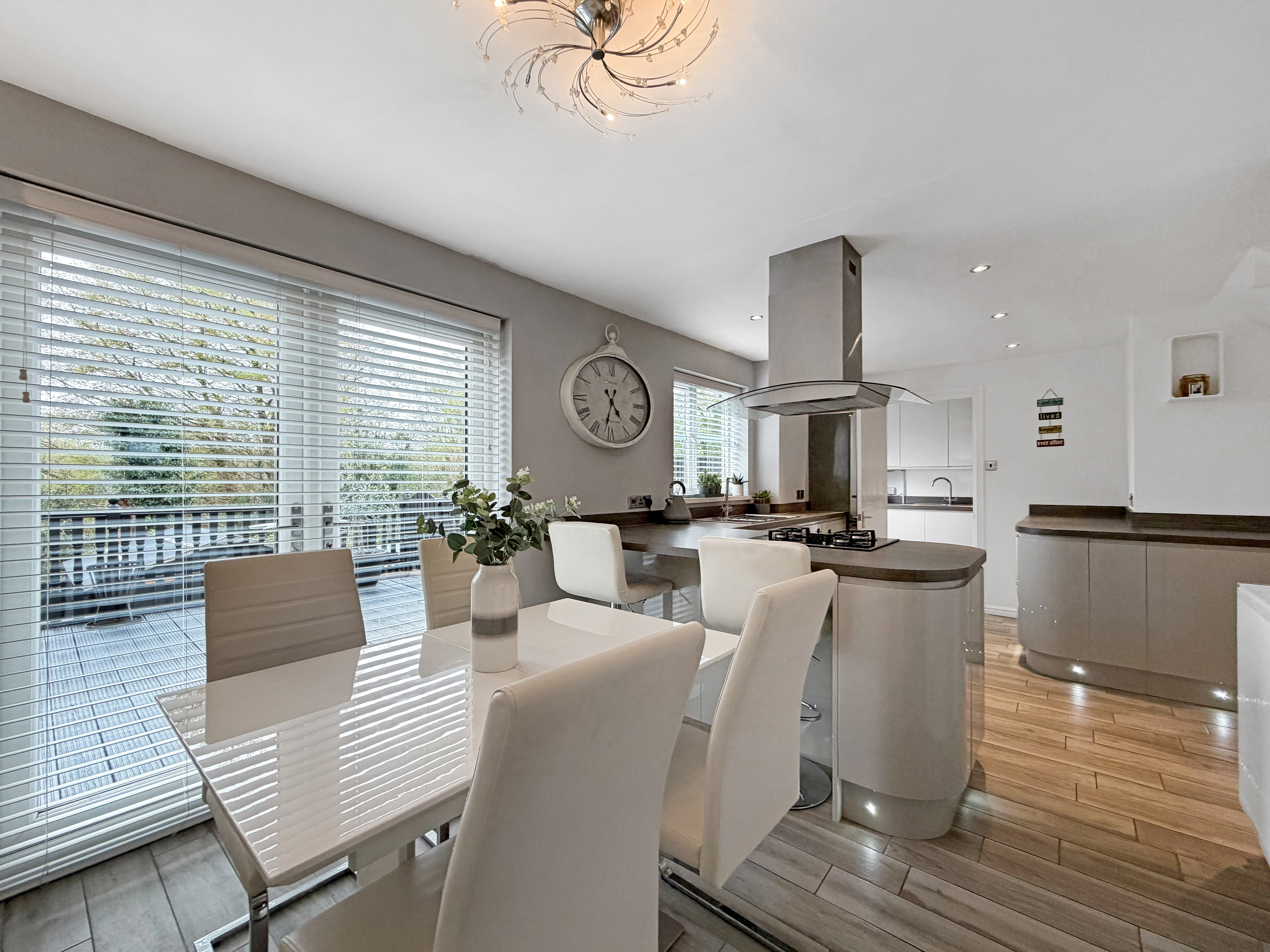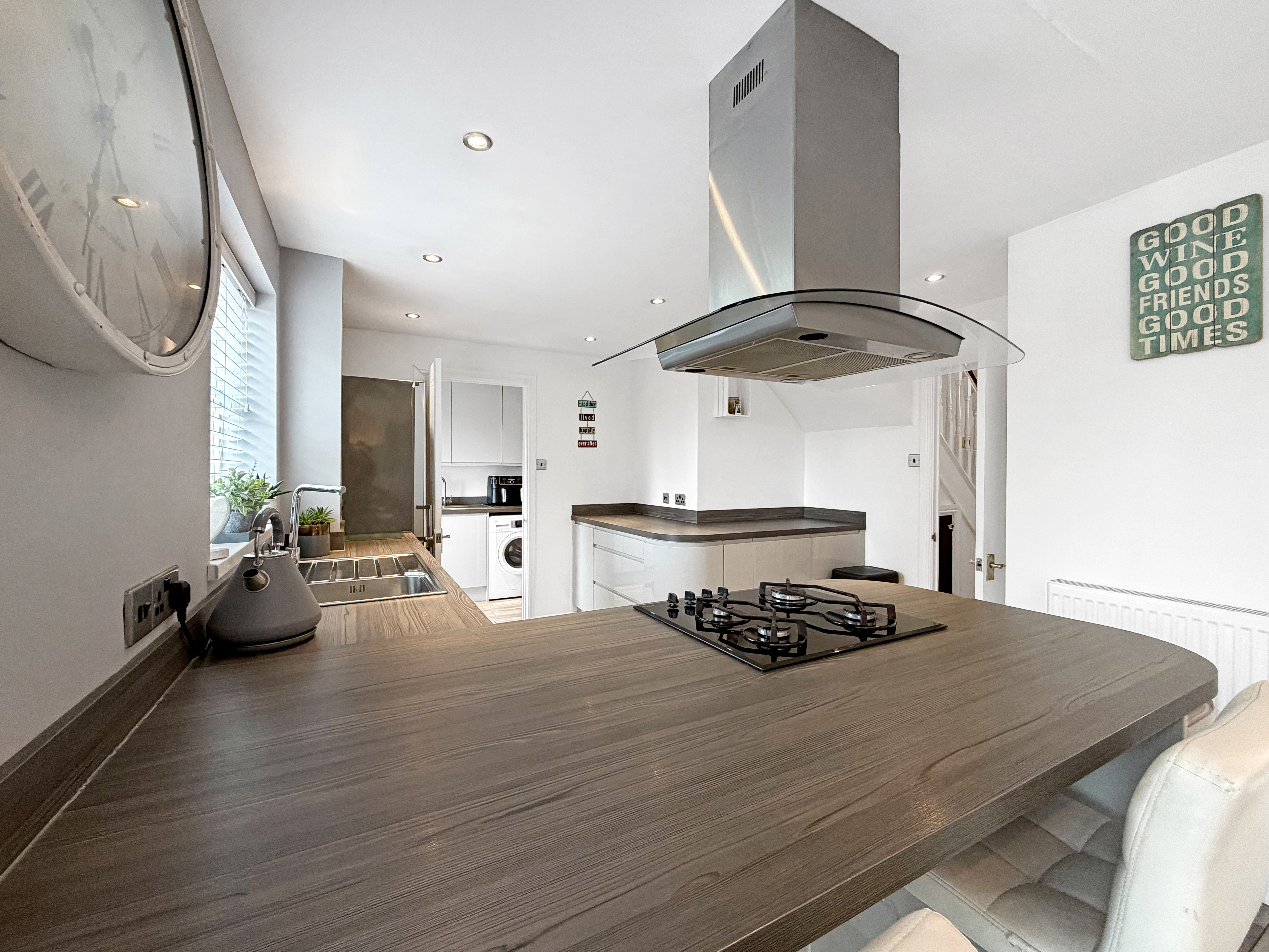 Out into the kitchen / diner, there is a large space for entertaining, the breakfast bar and new kitchen floor units line the room with a clean line of sight above. There are integrated appliances and an overhead extractor fan really complimenting the space in this room. The contrasting worktops bounce the light into the rom from the rear french doors and window, with access to the garden and the utility room.