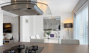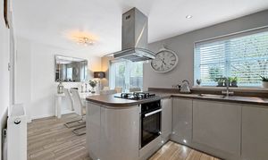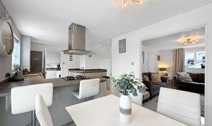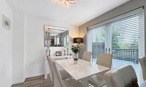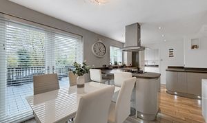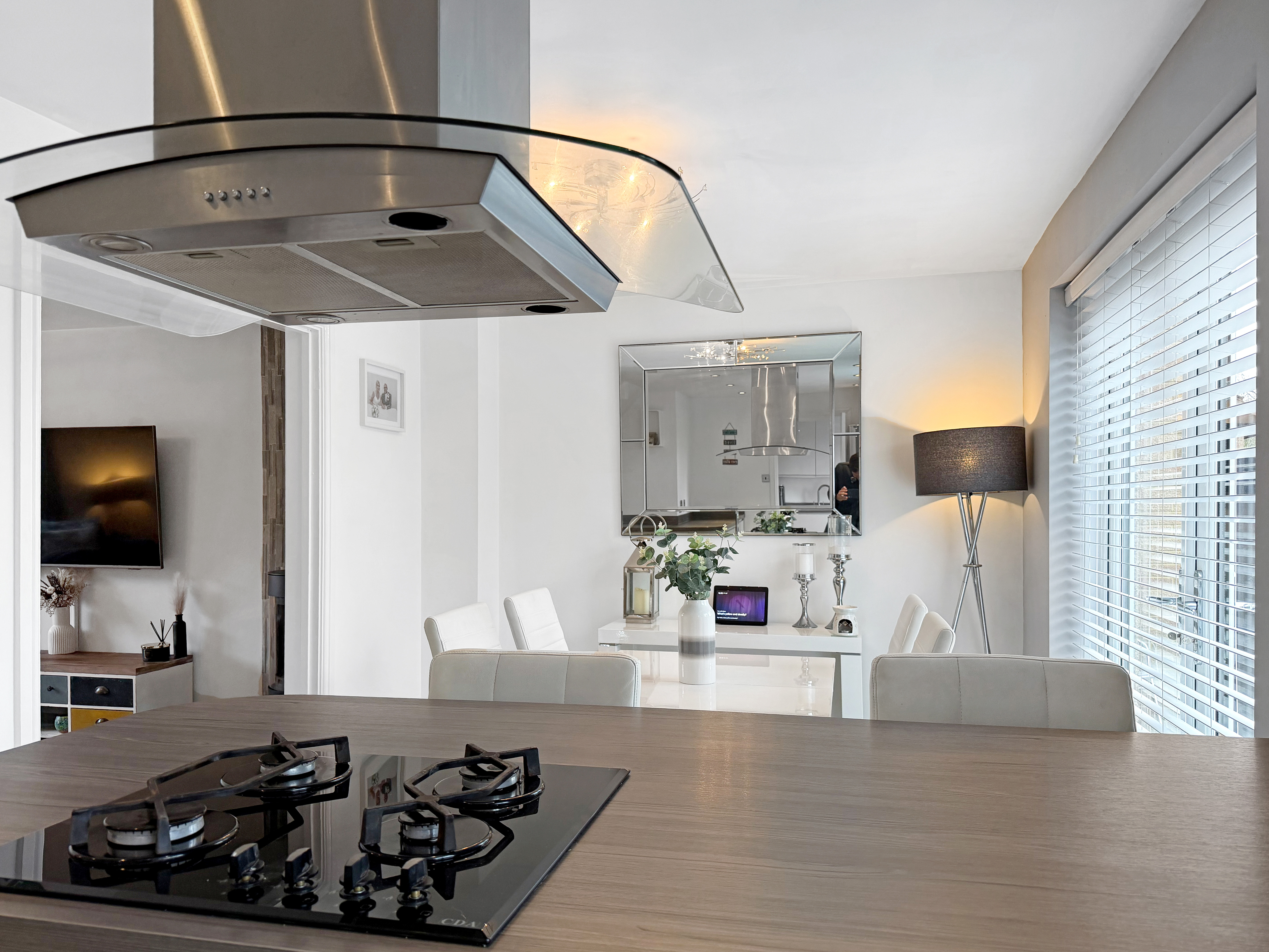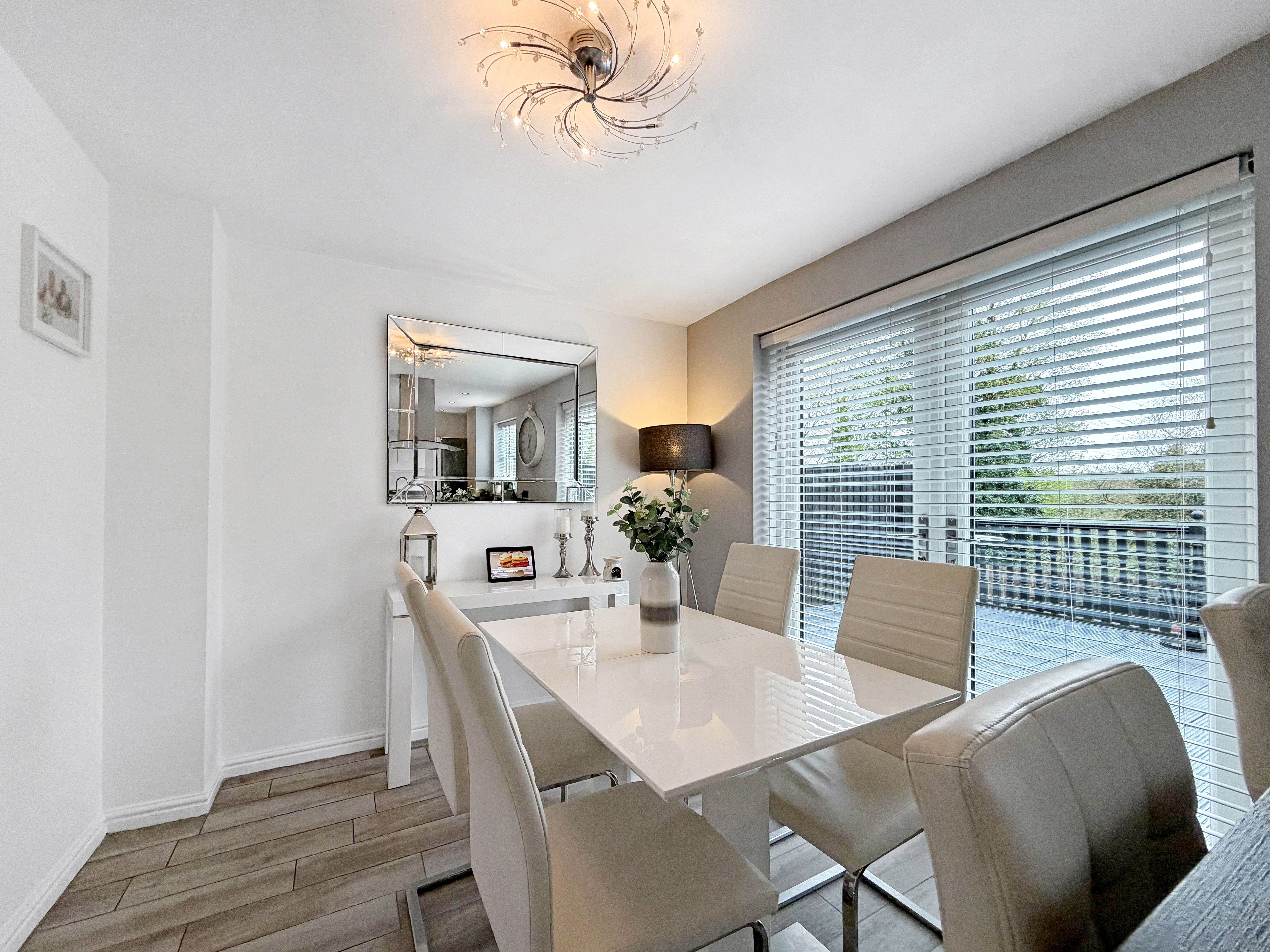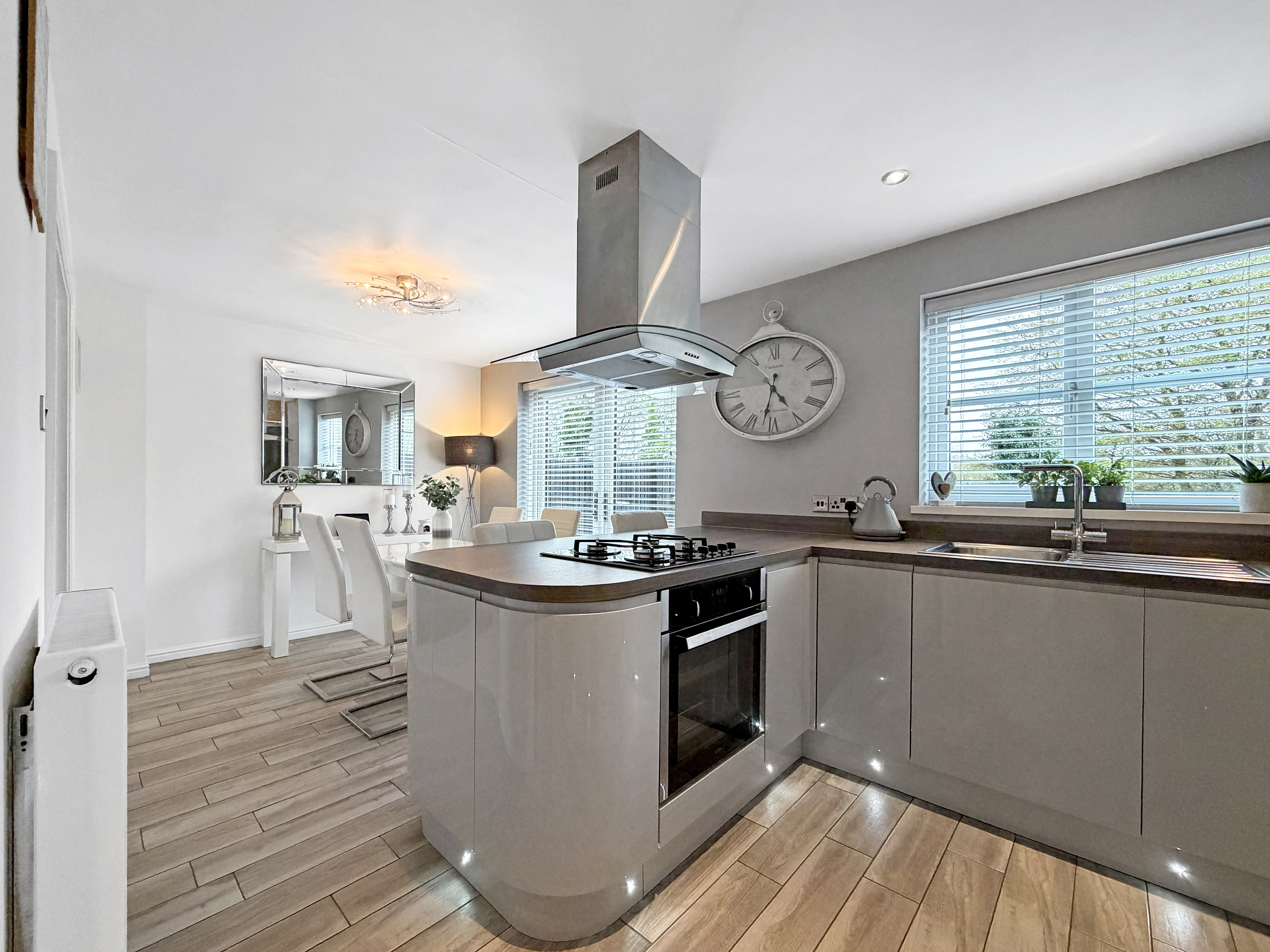 Out into the kitchen / diner, there is a large space for entertaining, the breakfast bar and new kitchen floor units line the room with a clean line of sight above. There are integrated appliances and an overhead extractor fan really complimenting the space in this room. The contrasting worktops bounce the light into the rom from the rear french doors and window, with access to the garden and the utility room.