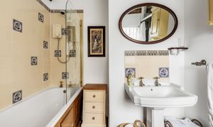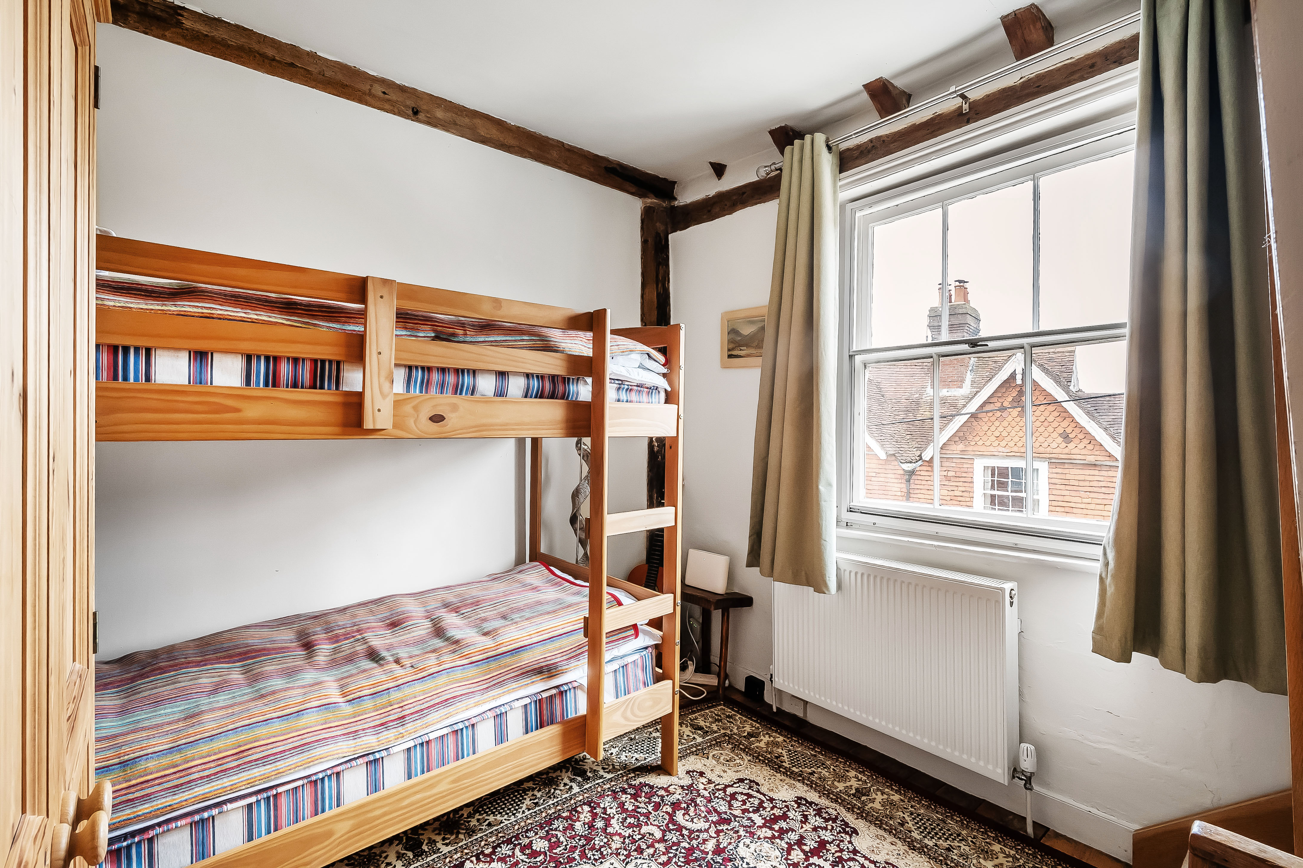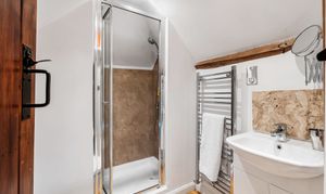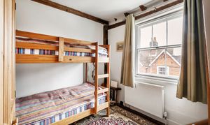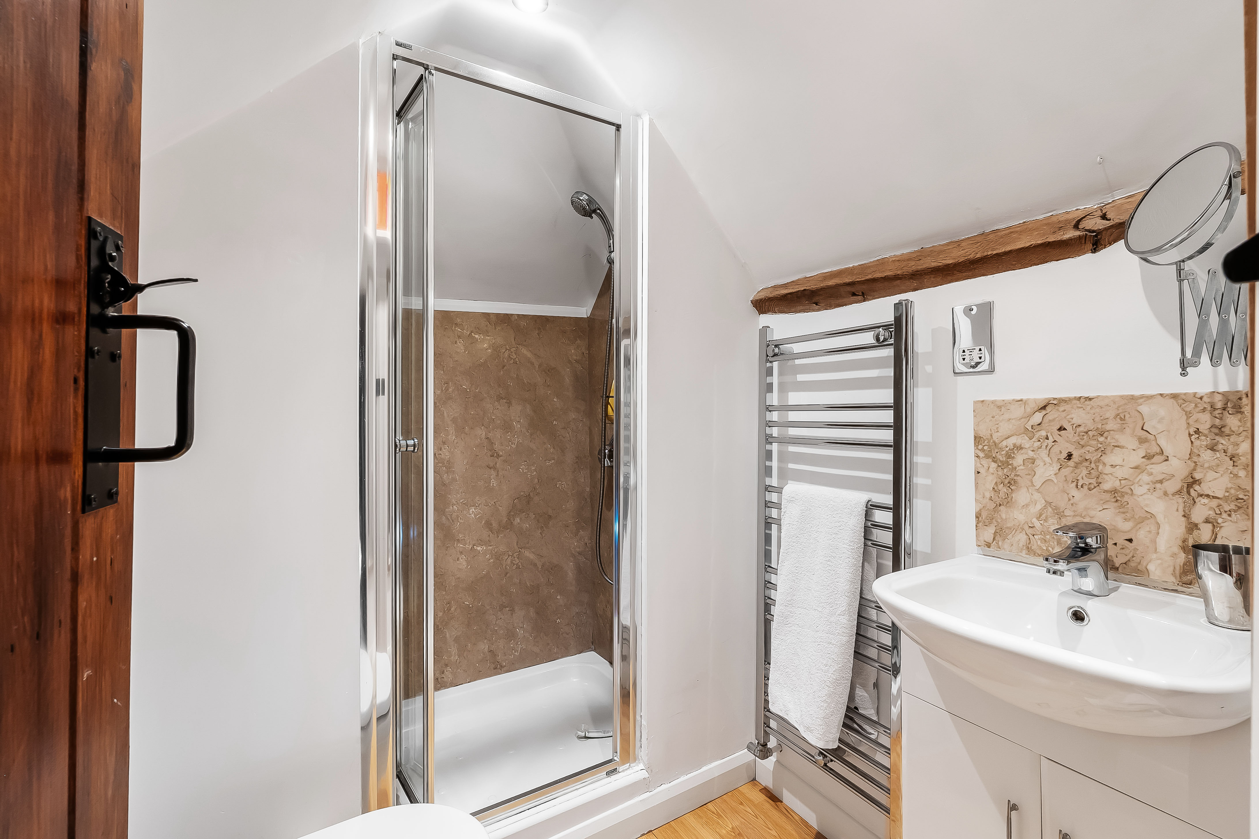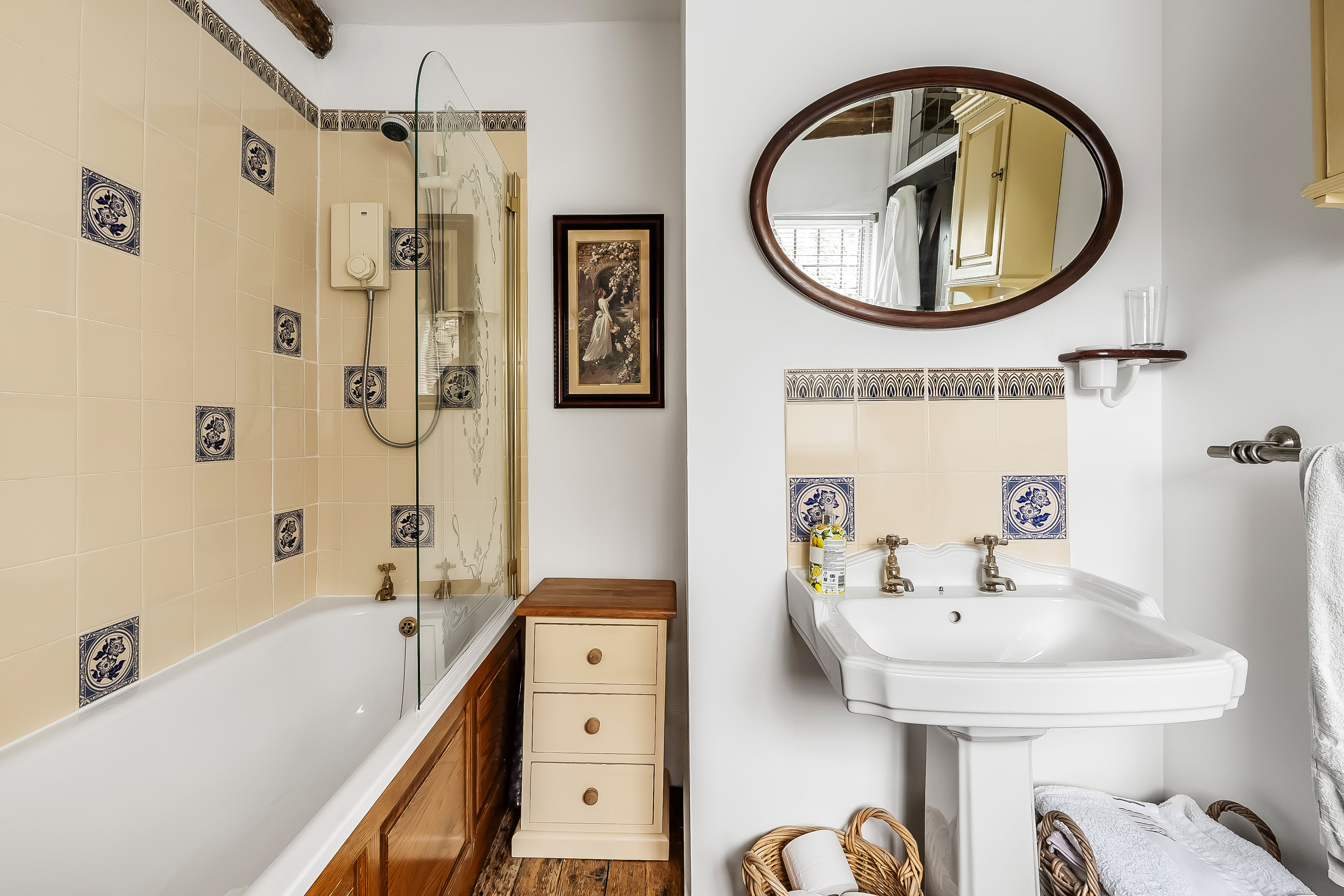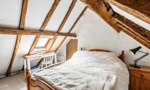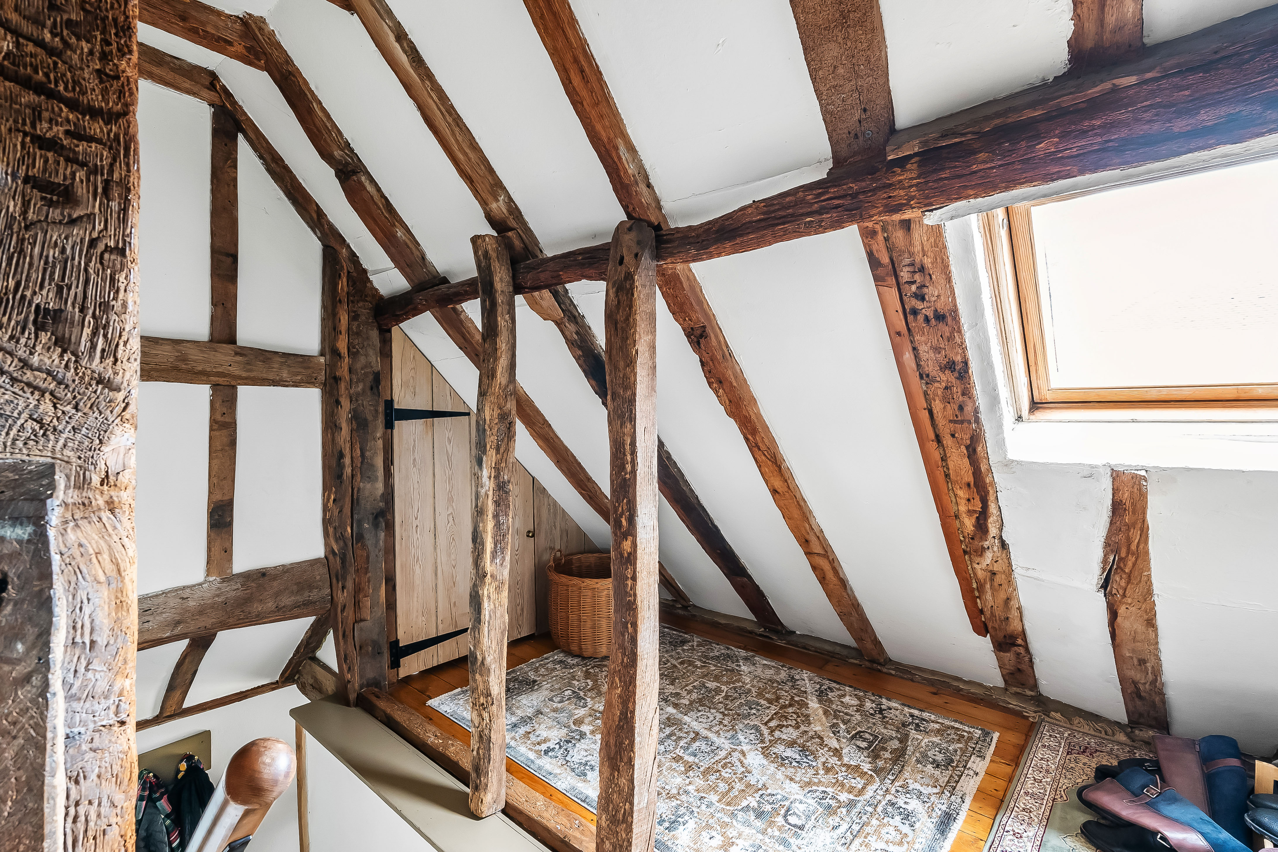 The second floor continues the home’s charm, offering an additional bedroom – currently used as the principal bedroom – together with a shower room. Each space beautifully reflects the property’s heritage, with exposed timbers and warm oak flooring enhancing the overall sense of character and warmth.