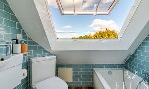 Upstairs, the master bedroom is a serene retreat with fitted wardrobes and a window seat overlooking the rear garden. A second double bedroom features fitted wardrobe storage, while the modern family bathroom is finished with an L-shaped bath, overhead shower, and contemporary fittings. On the top floor, two further bedrooms with Velux windows and a second bathroom create ideal children’s rooms, with the flexibility to serve as a study or guest space.