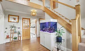 The entrance hall features a vaulted ceiling with stairs leading to the first floor galleried landing, a storage cupboard and doors through to all principal accommodation, including the WC.