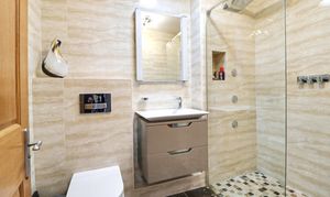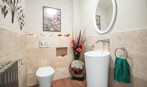 The contemporary family bathroom has a window to the side and has been fitted with a free-standing bath, WC and a vanity wash hand basin.