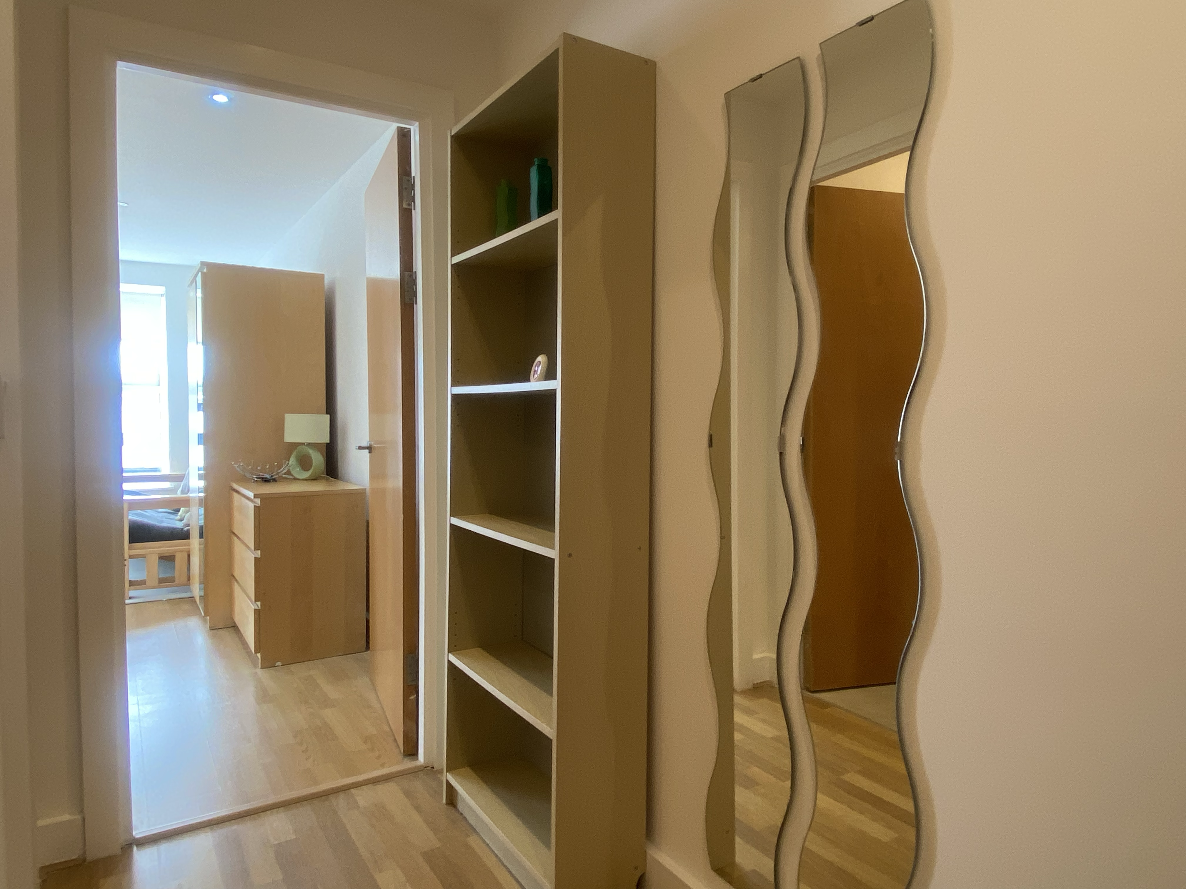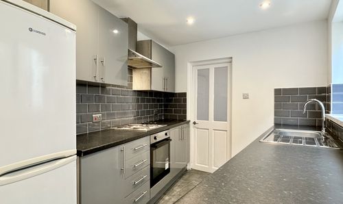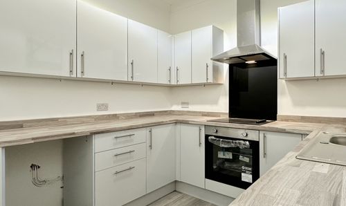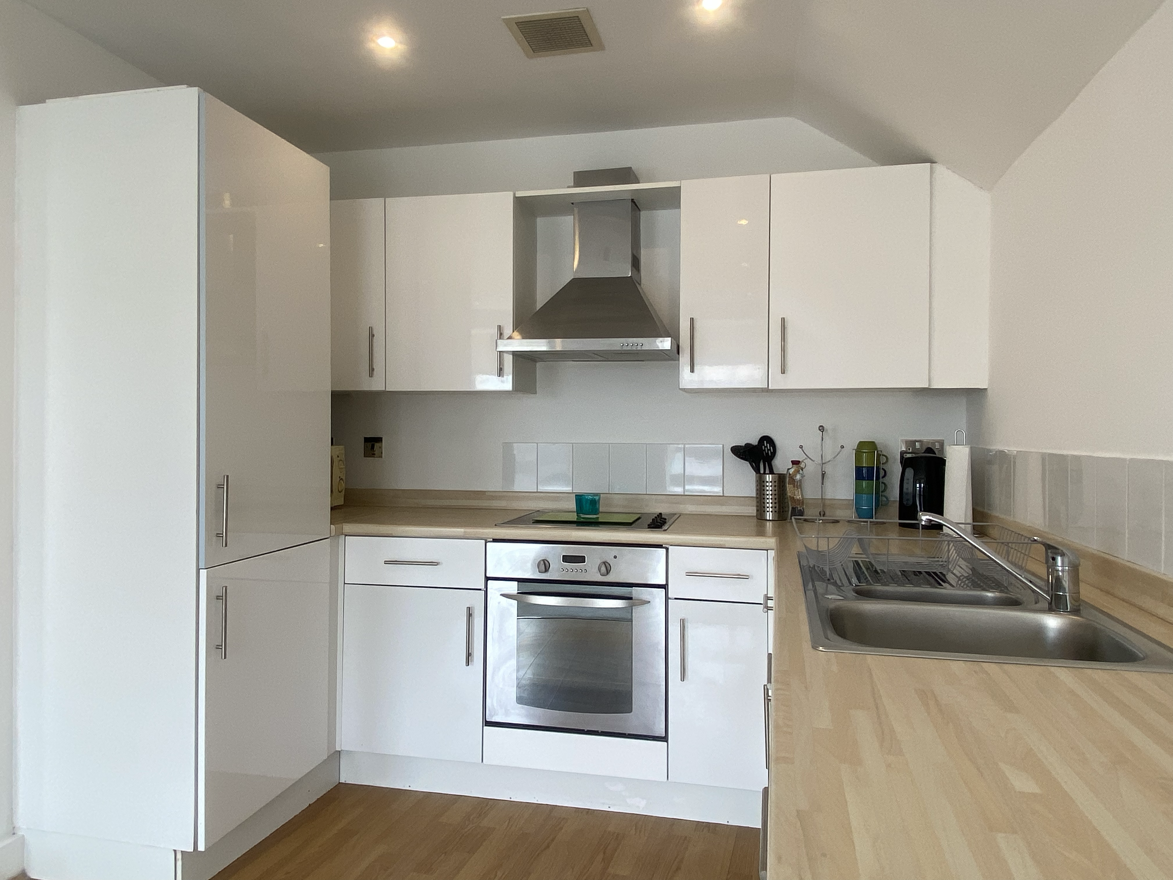 Internally, this fully furnished property comprises an entrance hallway leading to an open-plan kitchen and living area. The kitchen includes a washer dryer, fridge freezer, and an electric oven with hob.