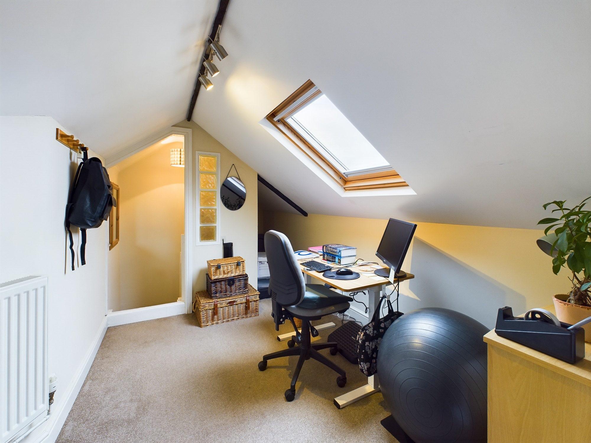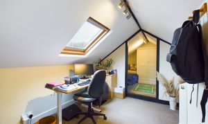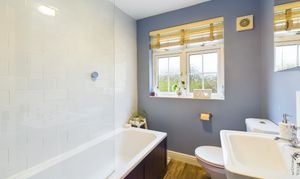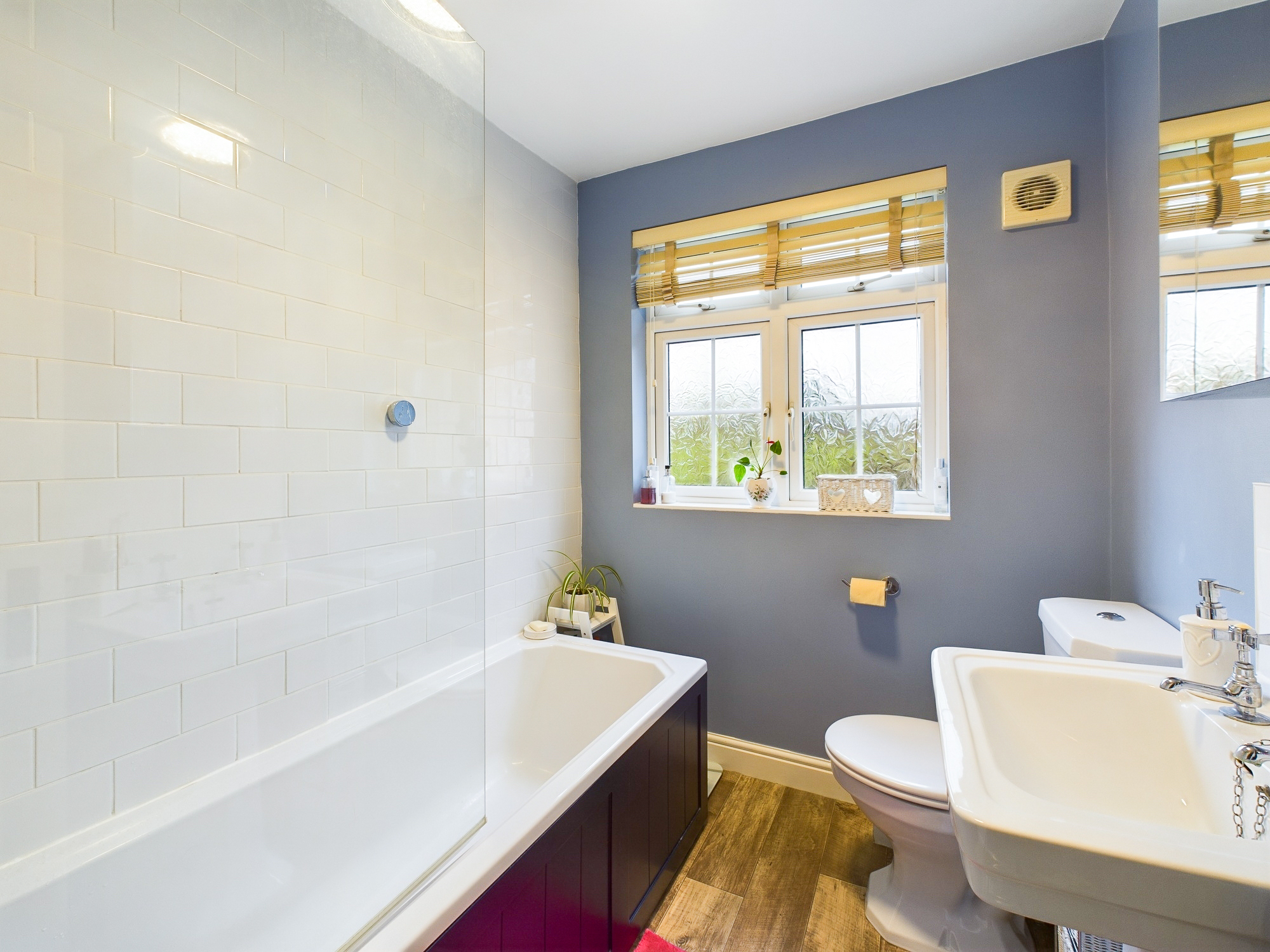 Fitted with a three piece suite comprising W.C., wash basin, bath with separate shower over and a pivoting glass screen. Extractor fan. Tiled splashbacks. Electric heated towel rail. Window to the rear.
