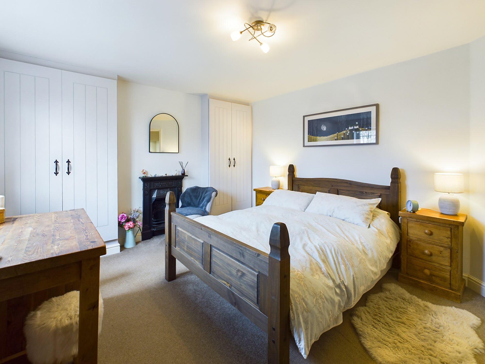 Window to the front. Victorian style cast iron fireplace with built-in wardrobes in the alcoves either side.