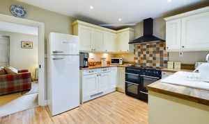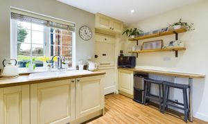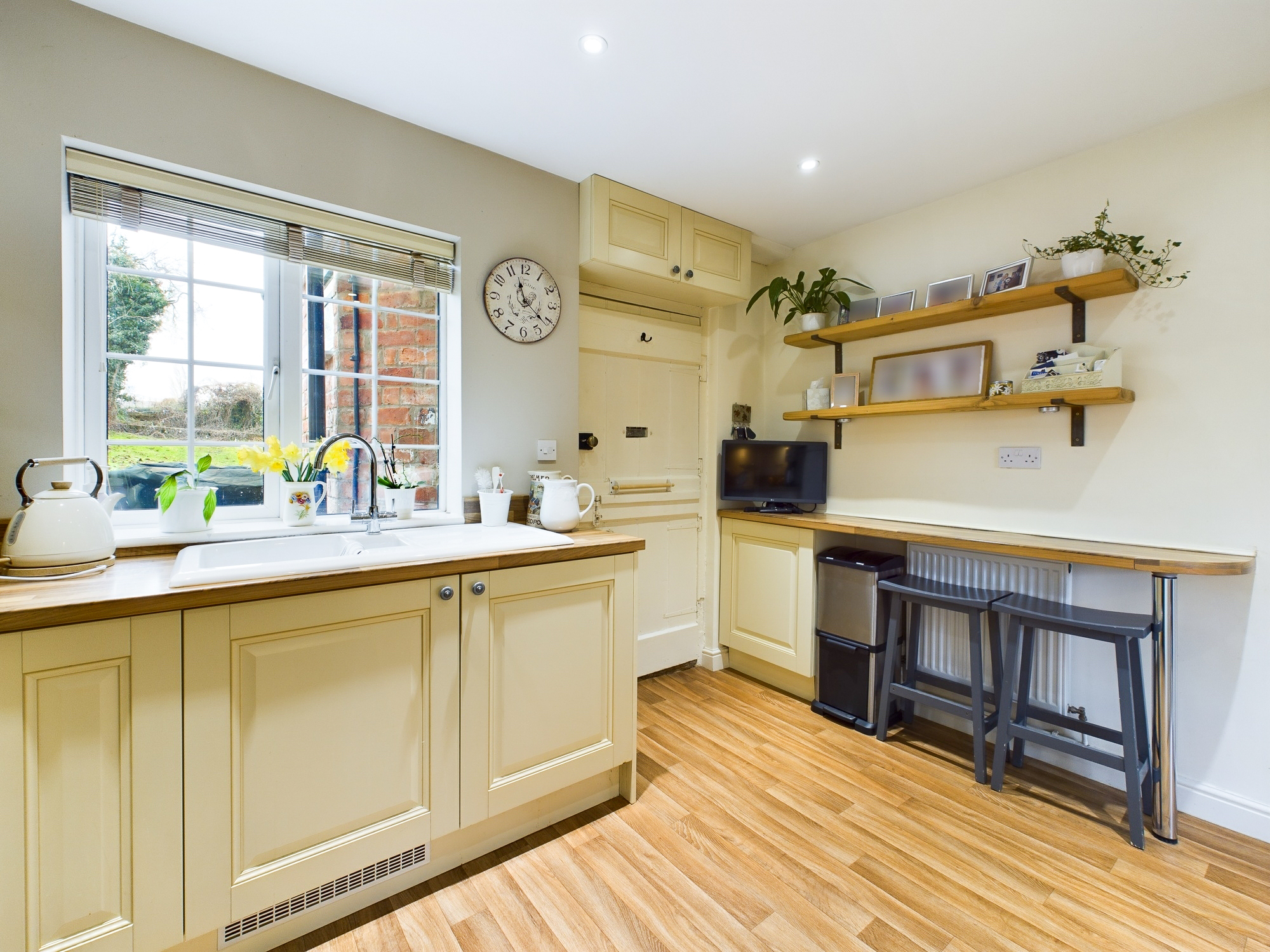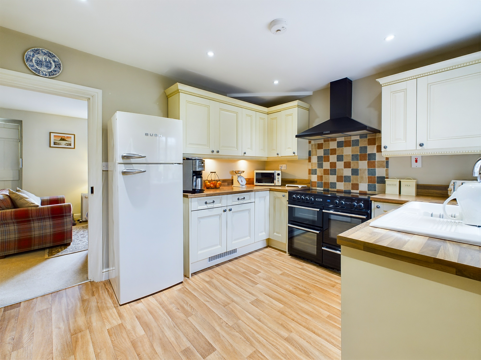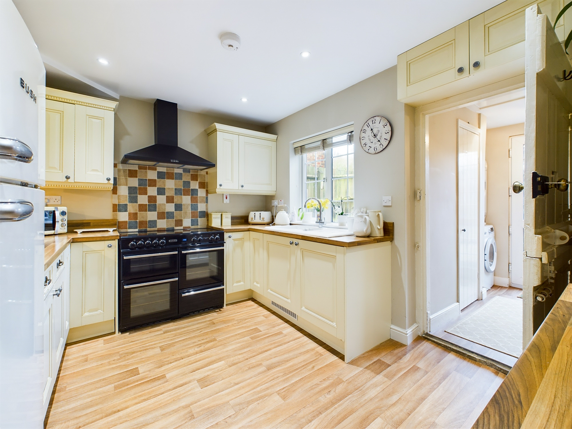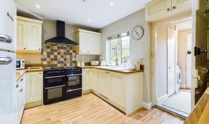 Fitted with a range of base and wall units, working surfaces including a separate breakfast bar. Ceramic sink with stainless steel mixer tap, range oven with five-ring hob, tiled splash back and extractor hood. Integrated dishwasher and space for a fridge/freezer. Window to the rear.