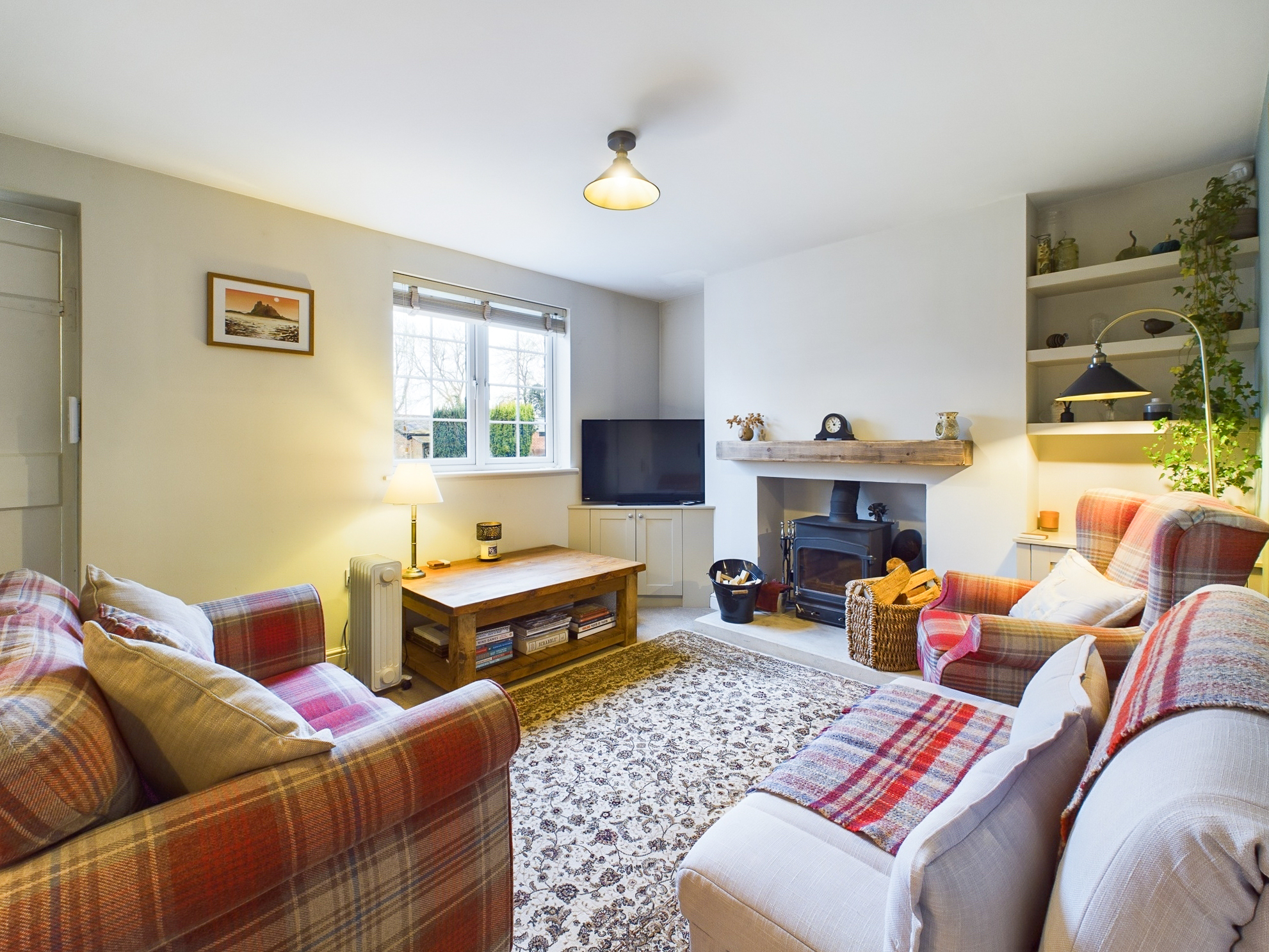 Window to the front. Chimney breast with log burner and wooden mantle. Built-in cupboards to either side.