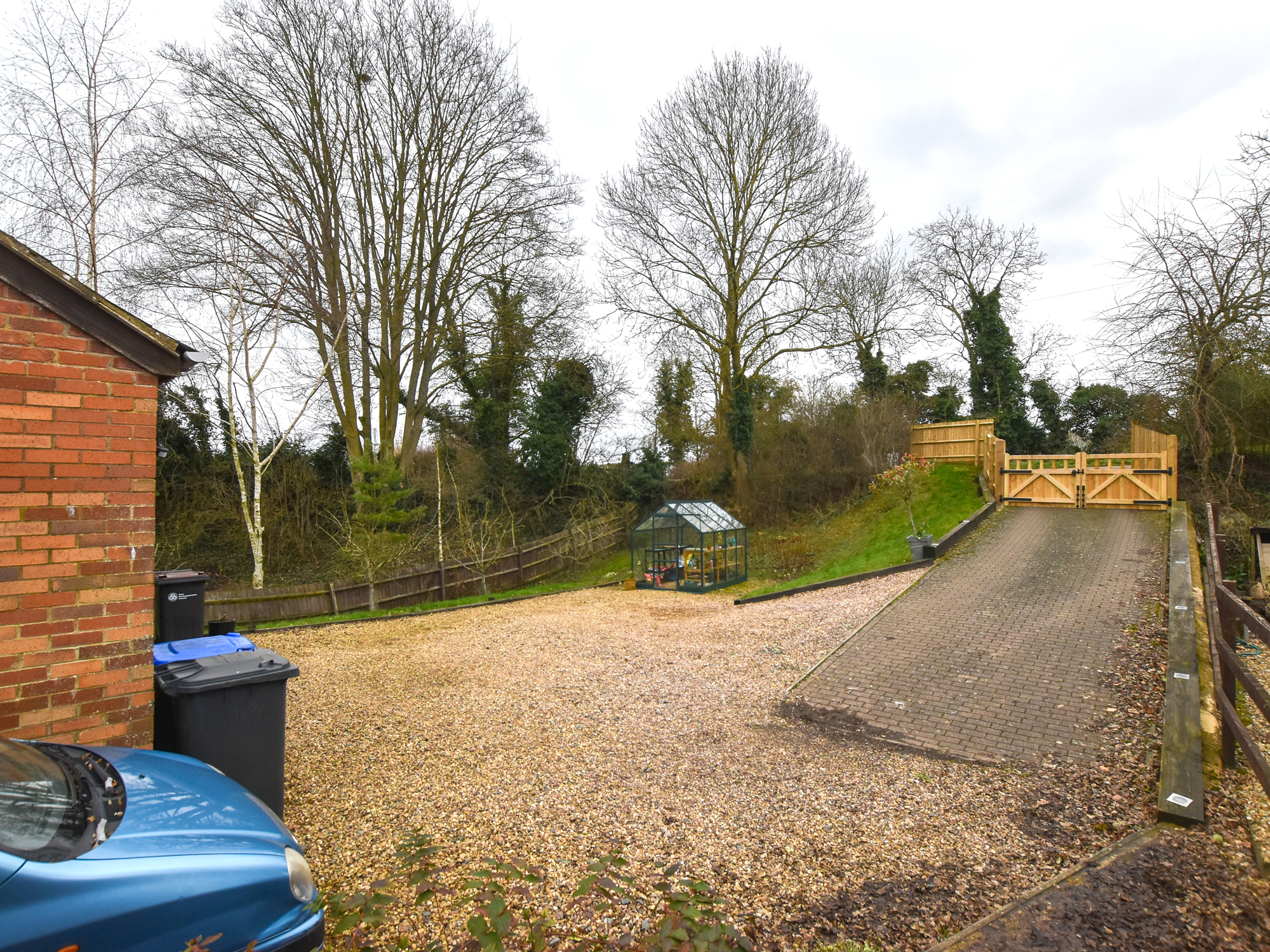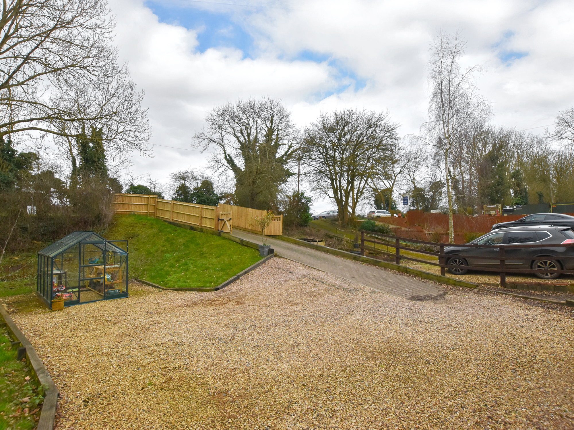 To the front of the garage there is a large gravel driveway. A gated block paved driveway descends from the road to gravel parking area. The green house is also included in the sale.