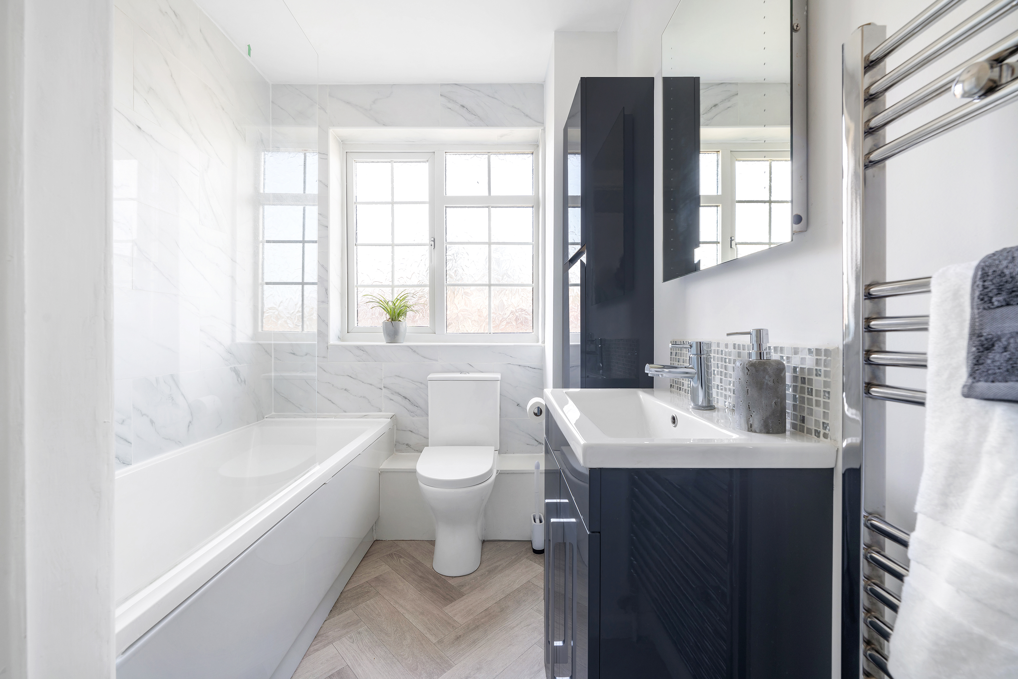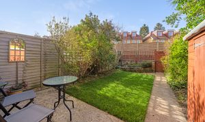 To the first floor there is a bedroom overlooking the garden and a double aspect 27ft kitchen/reception room which is a great space for entertaining. The fitted kitchen has a range of wall and base units, built-in double oven, gas hob with extractor, integrated slimline dishwasher and fridge/freezer. The second floor has a further two double bedrooms which are similar in style with fitted cupboards and wardrobe, and the family bathroom has a panel bath with Drench shower head and mixer tap, vanity storage and chrome heated towel rail. Other features to note, double glazing, gas central heating and loft space.
