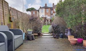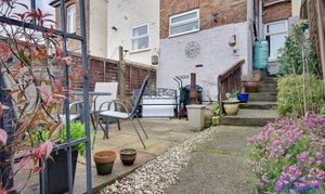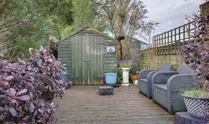 On the first floor are two bedrooms and a generous family bathroom, creating a comfortable and relaxing living environment. Outside, the property truly shines with a sizeable rear garden featuring a large hardstanding terrace, steps leading down to a private lawned area and a useful garden shed.