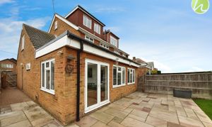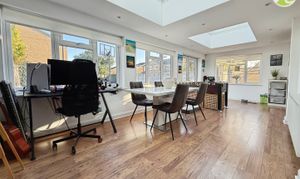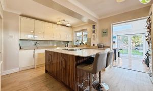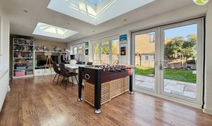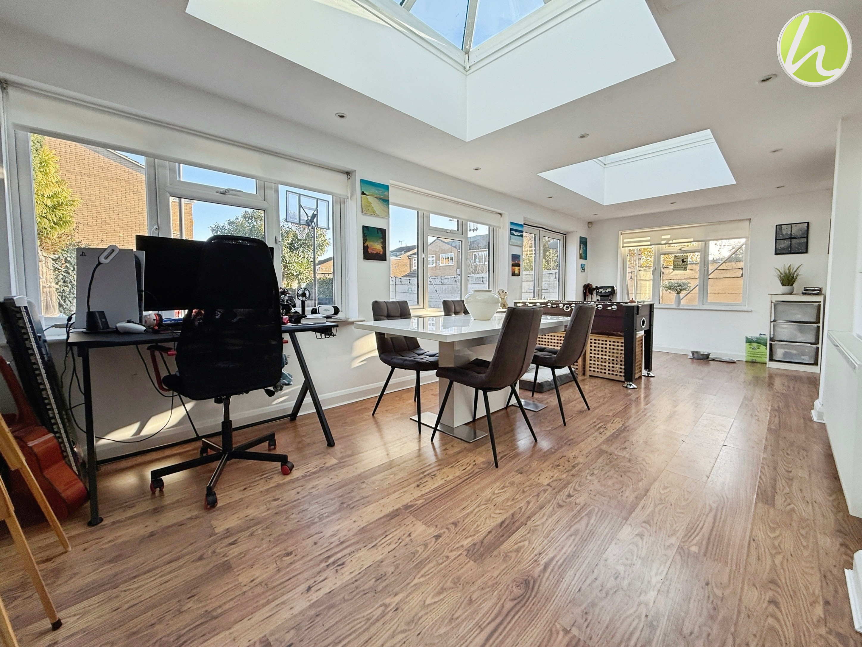 Upon entering, you are welcomed into a large, bright living room, ideal for everyday relaxation and entertaining. The heart of the home is the stunning modern fitted kitchen, complete with high-end appliances, a sleek feature island and ample storage, creating a perfect culinary and social hub. To the rear, the extended family/play room is flooded with natural light thanks to two elegant sky lanterns, offering an inviting space suitable for multiple uses.